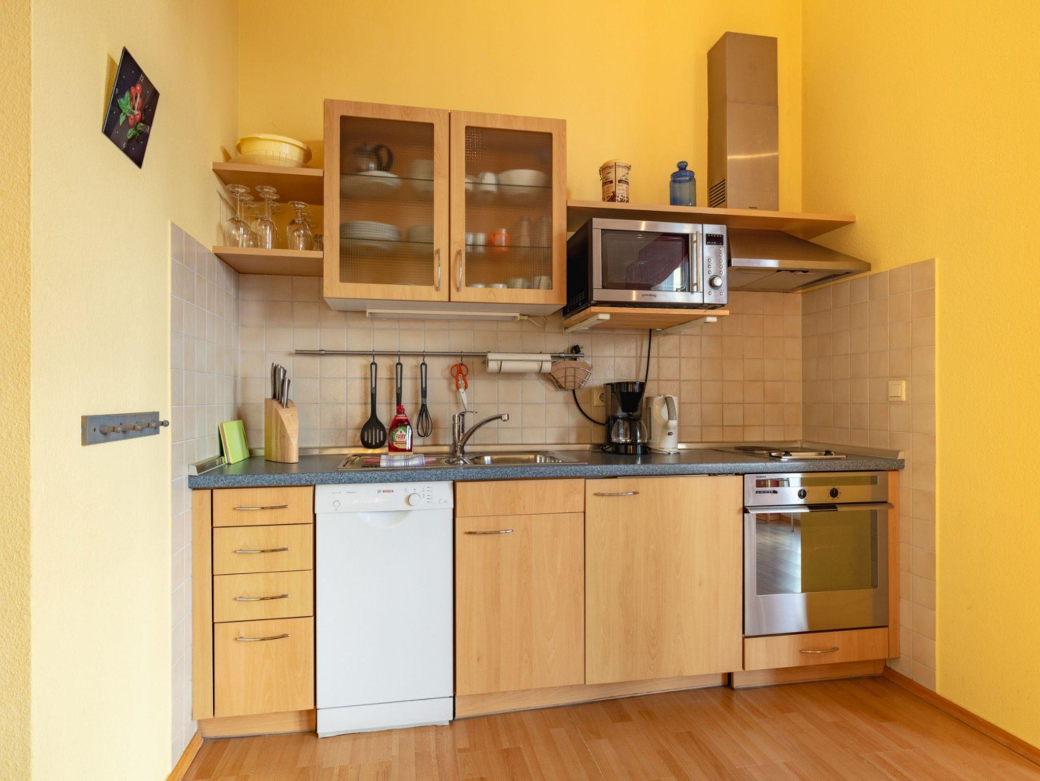 Die Wohnung besteht aus einem Schlafraum mit Doppelbett, einem kombinierten Wohn- und Schlafraum mit Doppelbettschlafcouch, einer kompletten Küchenzeile mit Geschirrspüler, Herd, Backofen, Kaffeemaschine.