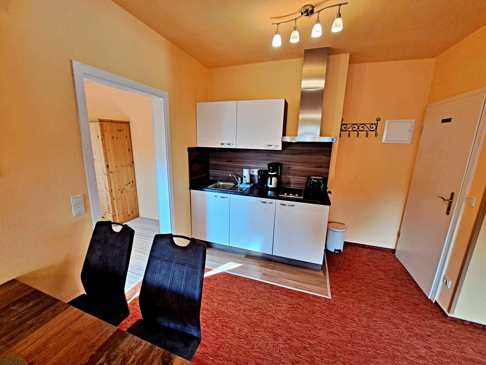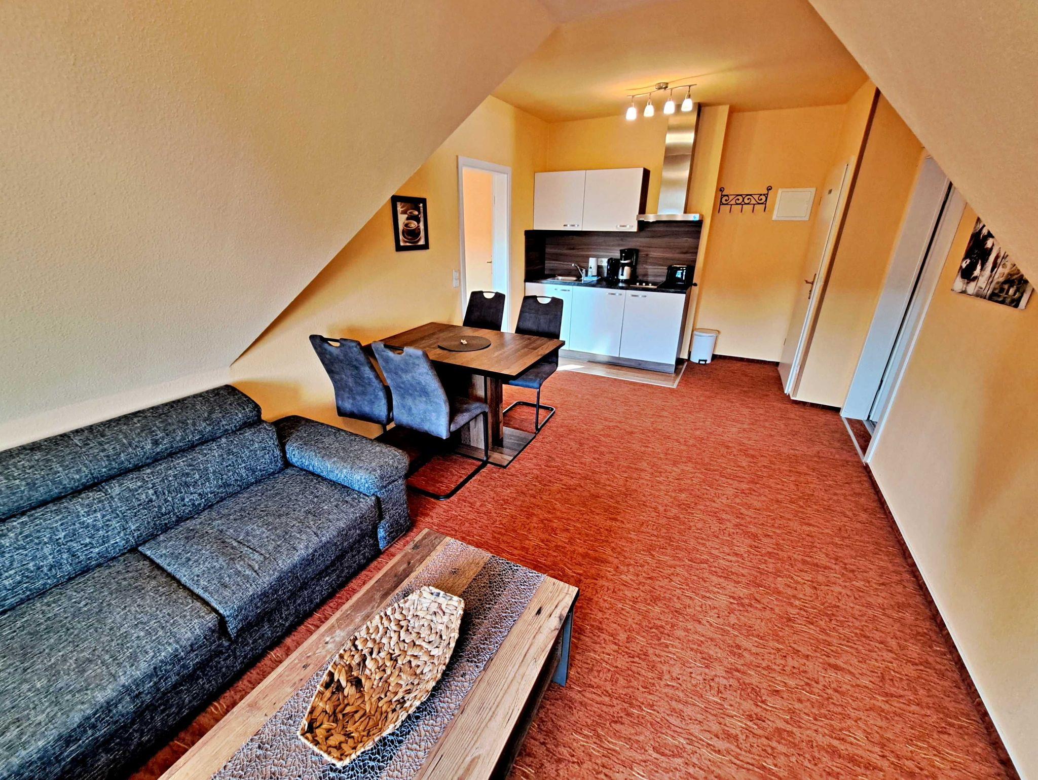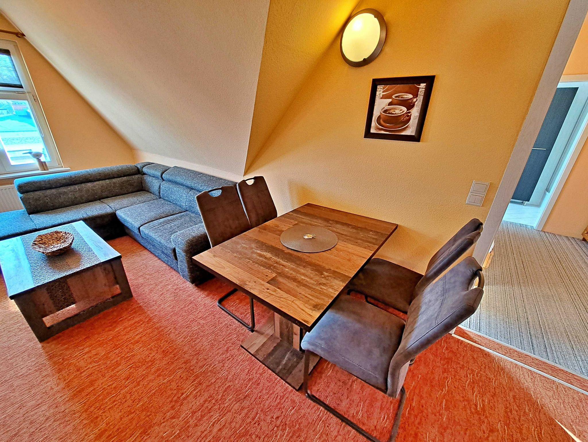 Diese großzügige ca. 70 qm große Unterkunft ist ideal für Ihren entspannten Aufenthalt und befindet sich im Dachgeschoss der Villa Haus Bella! Im einladenden Wohnzimmer finden Sie eine bequeme Couchgarnitur, Flachbild-TV, einen Esstisch mit vier Stühlen sowie eine praktische Pantry-Küche, ausgestattet mit einem Zwei-Platten-Herd, Toaster, Wasserkocher, Kaffeemaschine, Geschirr und Kühlschrank. Die Wohnung bietet Ihnen außerdem zwei gemütliche Schlafzimmer: eines mit einem Doppelbett und das andere mit zwei Einzelbetten. Das helle Tageslicht-Bad mit Dusche und WC erreichen Sie bequem direkt von einem der Schlafzimmer aus. Für Ihren Komfort stehen Ihnen der Parkplatz am Haus und WLAN selbstverständlich kostenfrei zur Verfügung.