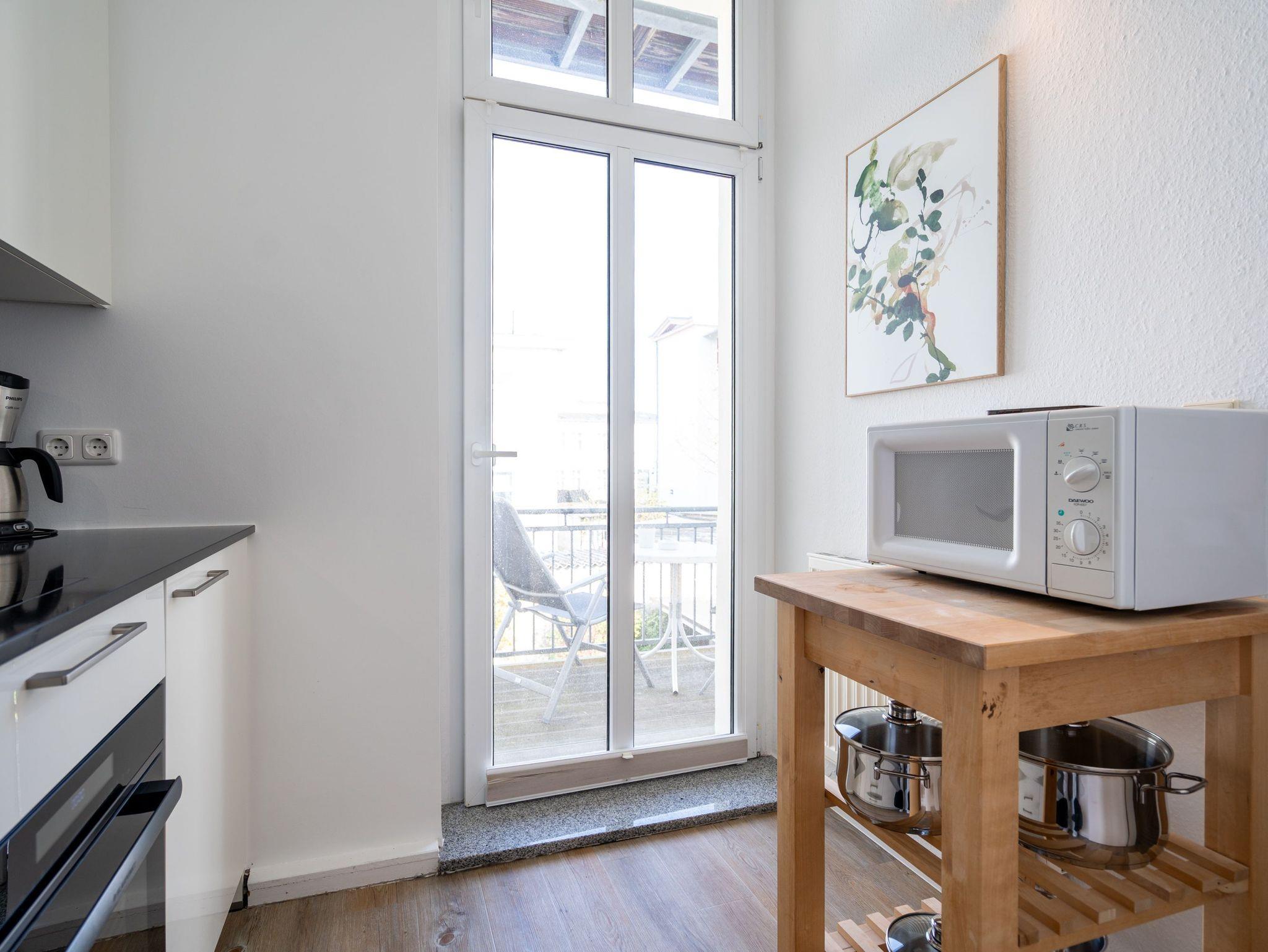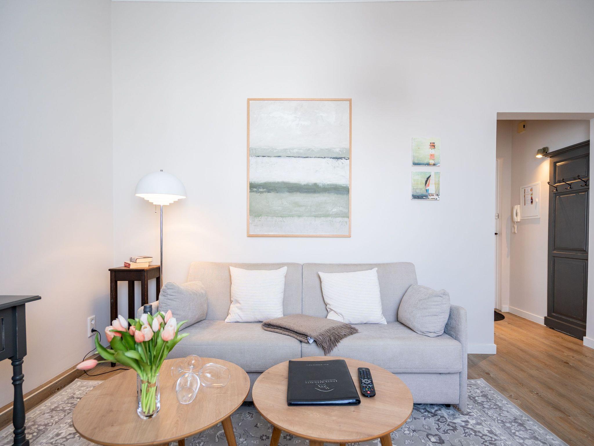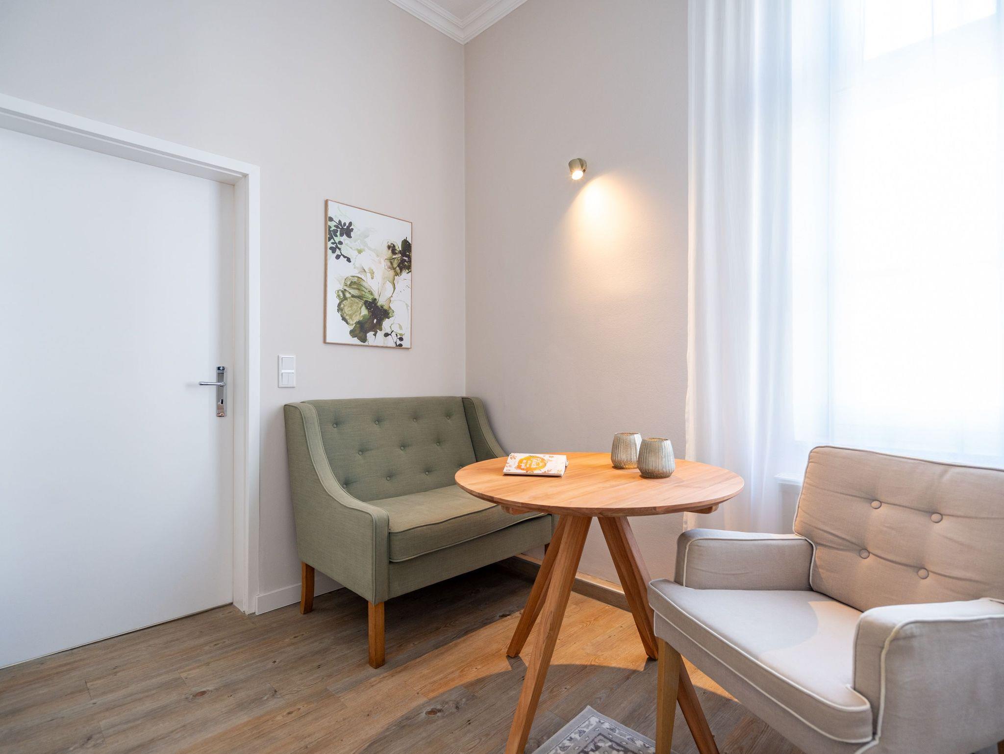Im 1. Obergeschoss, zur Süd-West Seite gelegen, befindet sich diese geschmackvolle 2-Raum-Ferienwohnung (36 qm) für 2-3 Personen. Der helle Wohnbereich verfügt über ein Schlafsofa (als Aufbettung für eine 3. Person möglich), Flat-TV und einen schönen Essplatz. Die separate Küche mit Zugang zum kleinen West-Balkon ist komplett ausgestattet. Ein Schlafzimmer mit Boxspringdoppelbett (1,80m x 2,00m) [&] Flat-TV und ein Bad mit Dusche und WC ergänzen diese Ferienappartement. Ein PKW-Stellplatz Nr. 5 befindet sich direkt auf dem Grundstück.