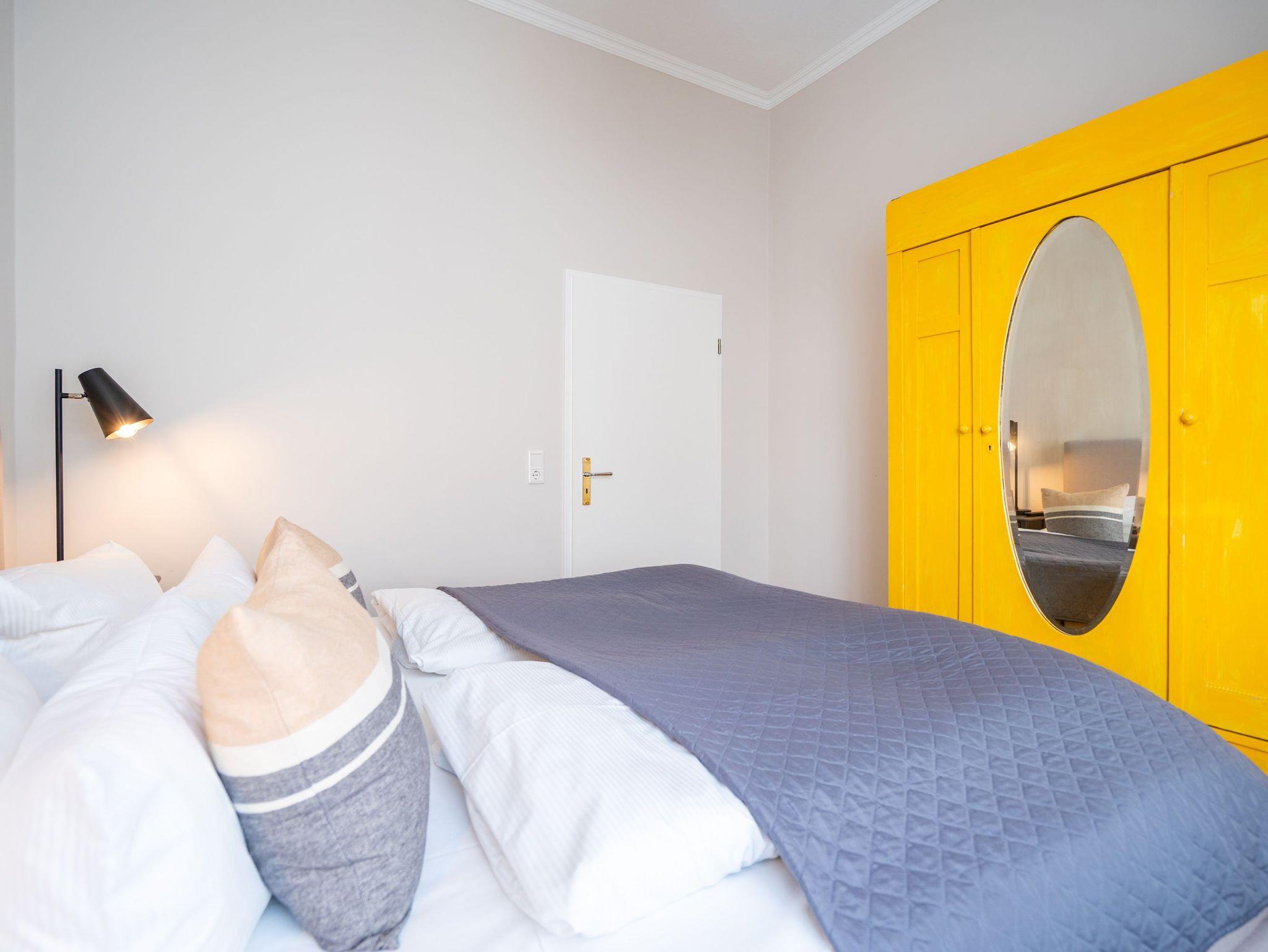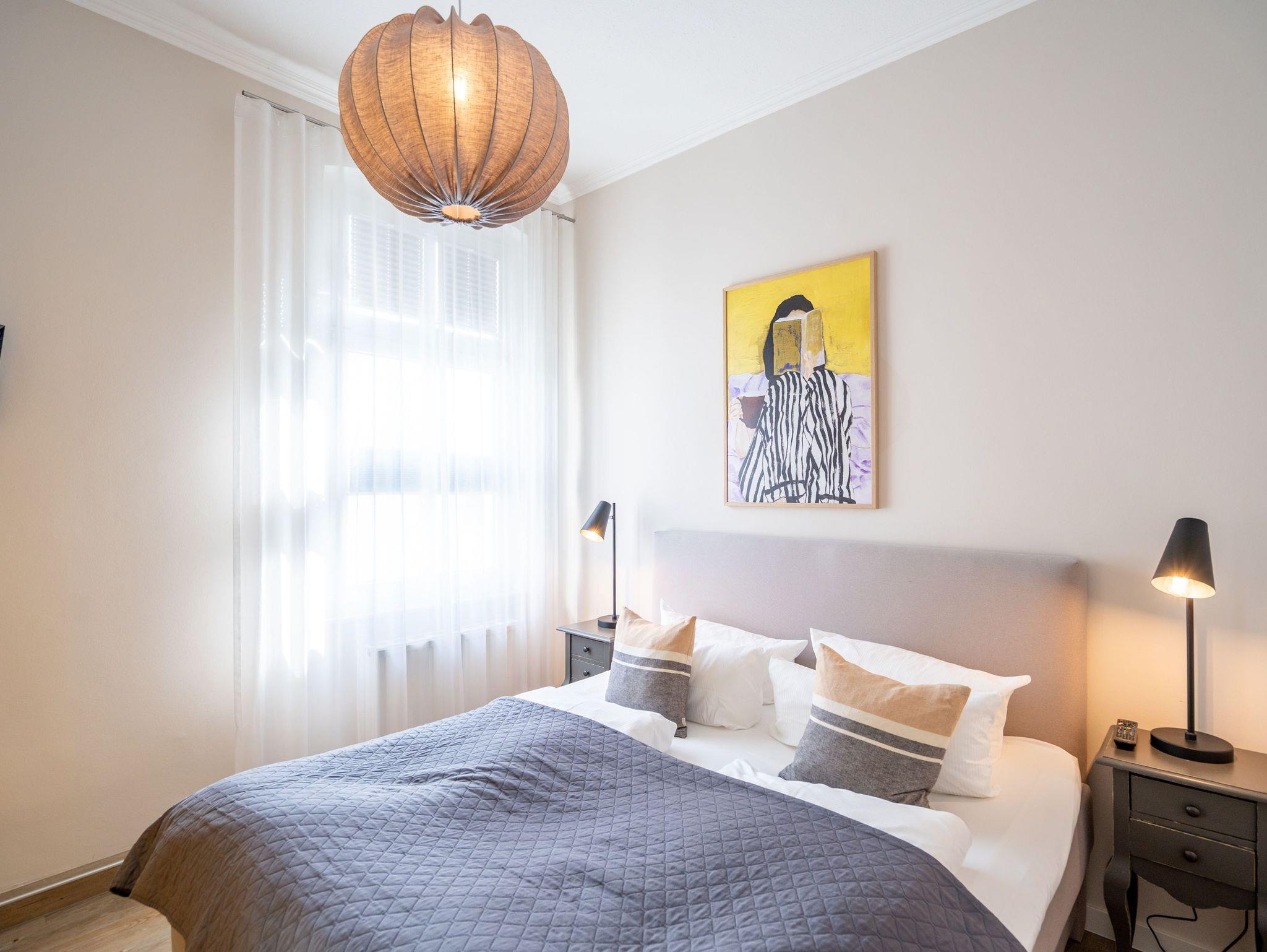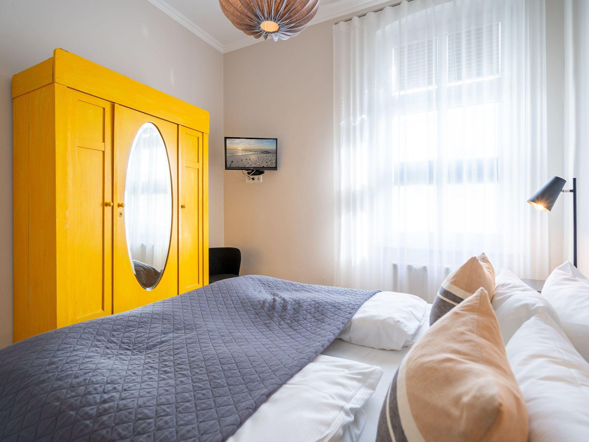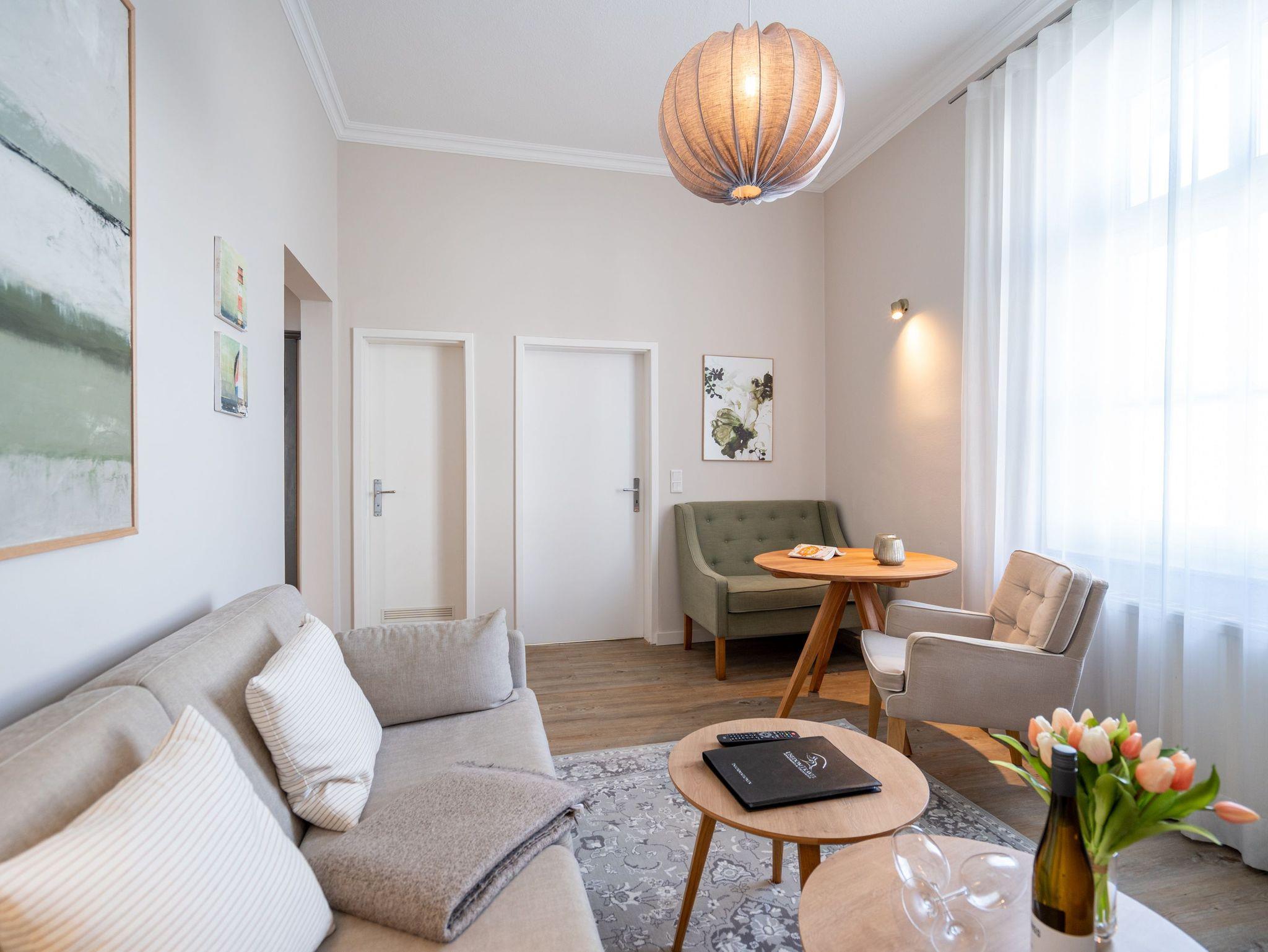 Im 1. Obergeschoss, zur Süd-West Seite gelegen, befindet sich diese geschmackvolle 2-Raum-Ferienwohnung (36 qm) für 2-3 Personen. Der helle Wohnbereich verfügt über ein Schlafsofa (als Aufbettung für eine 3. Person möglich), Flat-TV und einen schönen Essplatz. Die separate Küche mit Zugang zum kleinen West-Balkon ist komplett ausgestattet. Ein Schlafzimmer mit Boxspringdoppelbett (1,80m x 2,00m) [&] Flat-TV und ein Bad mit Dusche und WC ergänzen diese Ferienappartement. Ein PKW-Stellplatz Nr. 5 befindet sich direkt auf dem Grundstück.