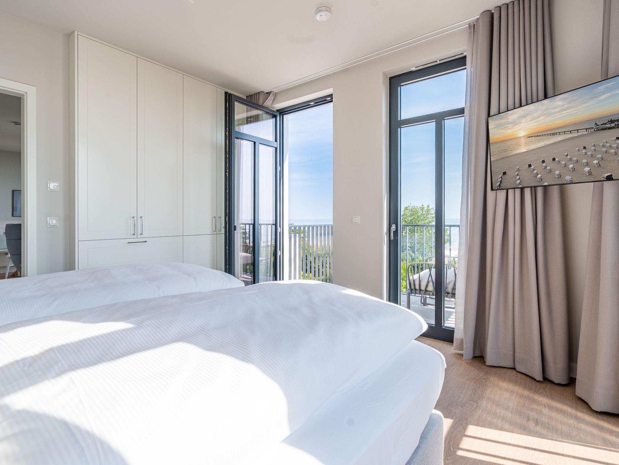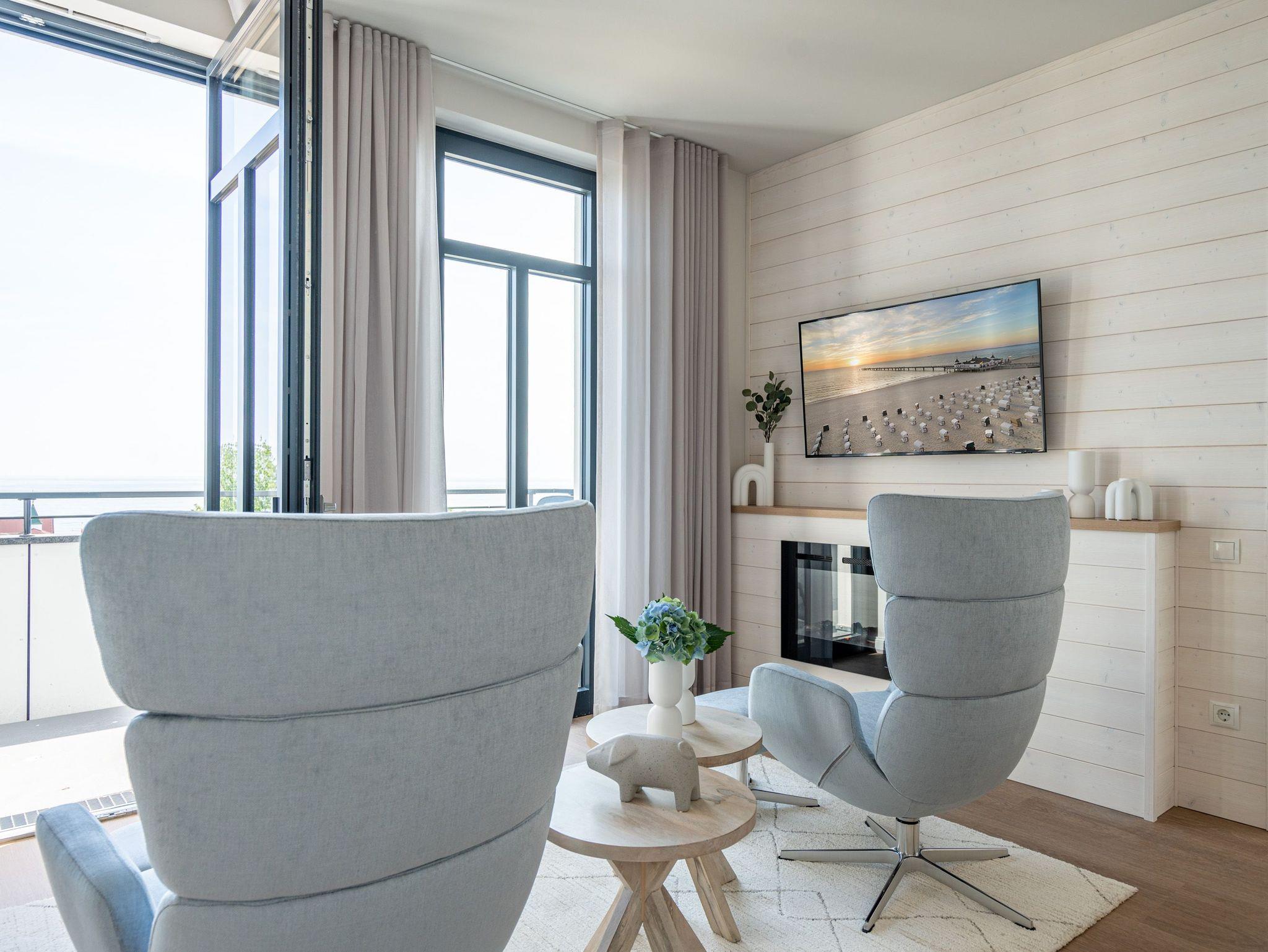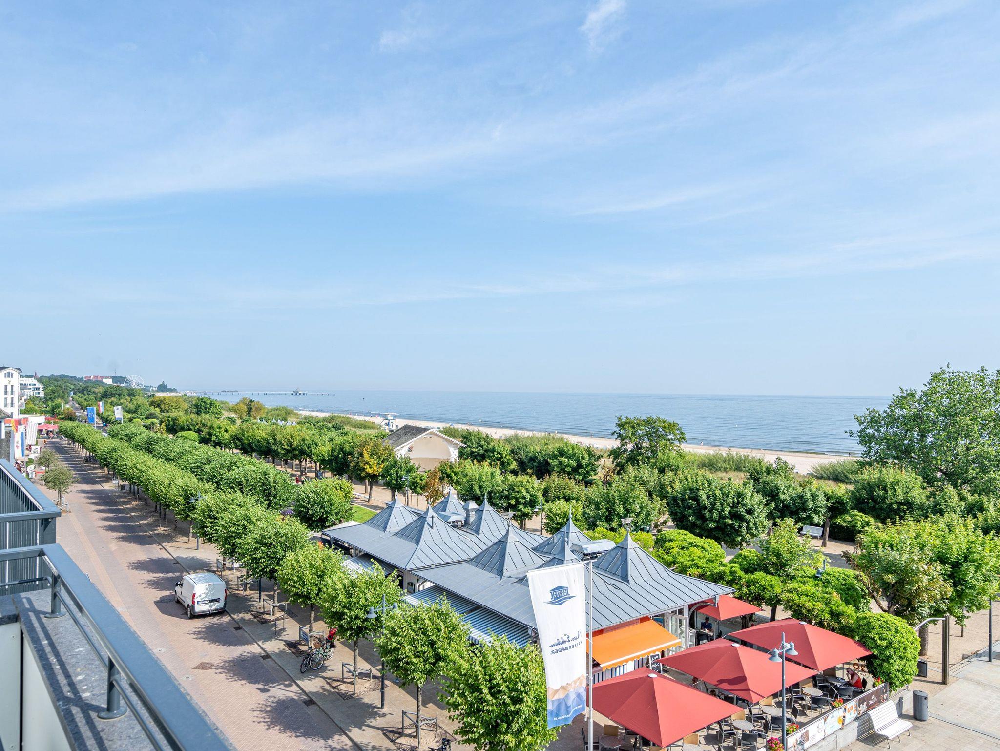 Visasvis der Seebrücke reicht der Blick aus dem exklusiven 2-Raum-Appartement A 3.4 (Haus A) in der 3. Etage von der Heringsdorfer Seebrücke bis nach Swinemünde. An Tagen mit klarer Seeluft sogar bis zu den weißen Klippen von Misdroy. Dieses kleine, aber feine Urlaubsdomizil wartet auf seinen 48 Quadratmetern mit viel Komfort und Finesse auf. Der offene Wohnbereich und das Schlafzimmer sind ideal für zwei Personen und sind ein Traum für alle Ostseeliebhaber. Denn von der werden Sie hier nicht genug bekommen. Nordisches Design gibt beim Interieur den Ton an. Modern und hyggelig zugleich. Genießen sie aus den stylischen, drehbaren Relaxsesseln die Füße auf bequeme Hocker ausgestreckt den fantastischen Blick aufs Meer. Ein Elektrokamin (ohne Wärmeabgabe) sorgt zudem für eine heimelige Atmosphäre. Sogar im Sommer. Ein 50-Zoll-Flachbildfernseher steht für Ihre Unterhaltung zur Verfügung. Die offene Küchenzeile ist mit einem Backofen, einem 3-Platten-Induktionskochfeld, einer Spülmaschine, einer Nespresso-Kapselmaschine und vielem mehr komplett ausgestattet. Hier fehlt es an nichts, um raffinierte Gerichte zu zaubern und sie anschließend am schönen Esstisch gemeinsam einzunehmen. Nur einen Schritt aus dem bodentiefen Fenster hinaus und Sie stehen auf dem ersten Ost-Balkon mit einem Beistelltisch, zwei Sesseln und einer Gartenliege. Entspannen Sie hier bei Sonnenschein und atmen die energieaufladende Brise, die direkt vom Wasser herüberweht, tief ein. Das Schlafzimmer verspricht im luxuriösen Boxspringdoppelbett (2,00m x 2,00m) wunderbare Stunden der Ruhe. Hier befindet sich ein großer Kleiderschrank und ein weiterer 43-Zoll-Flachbildfernseher. Mit Meerblick aufwachen, das ist doch purer Luxus. In diesem charmanten Appartement gehört er zur Grundausstattung dazu. Kaum aus dem Bett, können Sie vom Schlafzimmer aus auf dem zweiten Balkon (Richtung Ost) die aufgehende Sonne begrüßen. Denn auf Usedom entsteigt sie jeden Morgen der Ostsee. Das innenliegende Bad ist mit einer Dusche, einem Waschtisch und einer Toilette ausgestattet. Zur Wohnung gehört in der Tiefgarage ein PKW-Stellplatz. Genießen Sie in diesem wunderschönen Urlaubsparadies unvergessliche Tage am Meer.