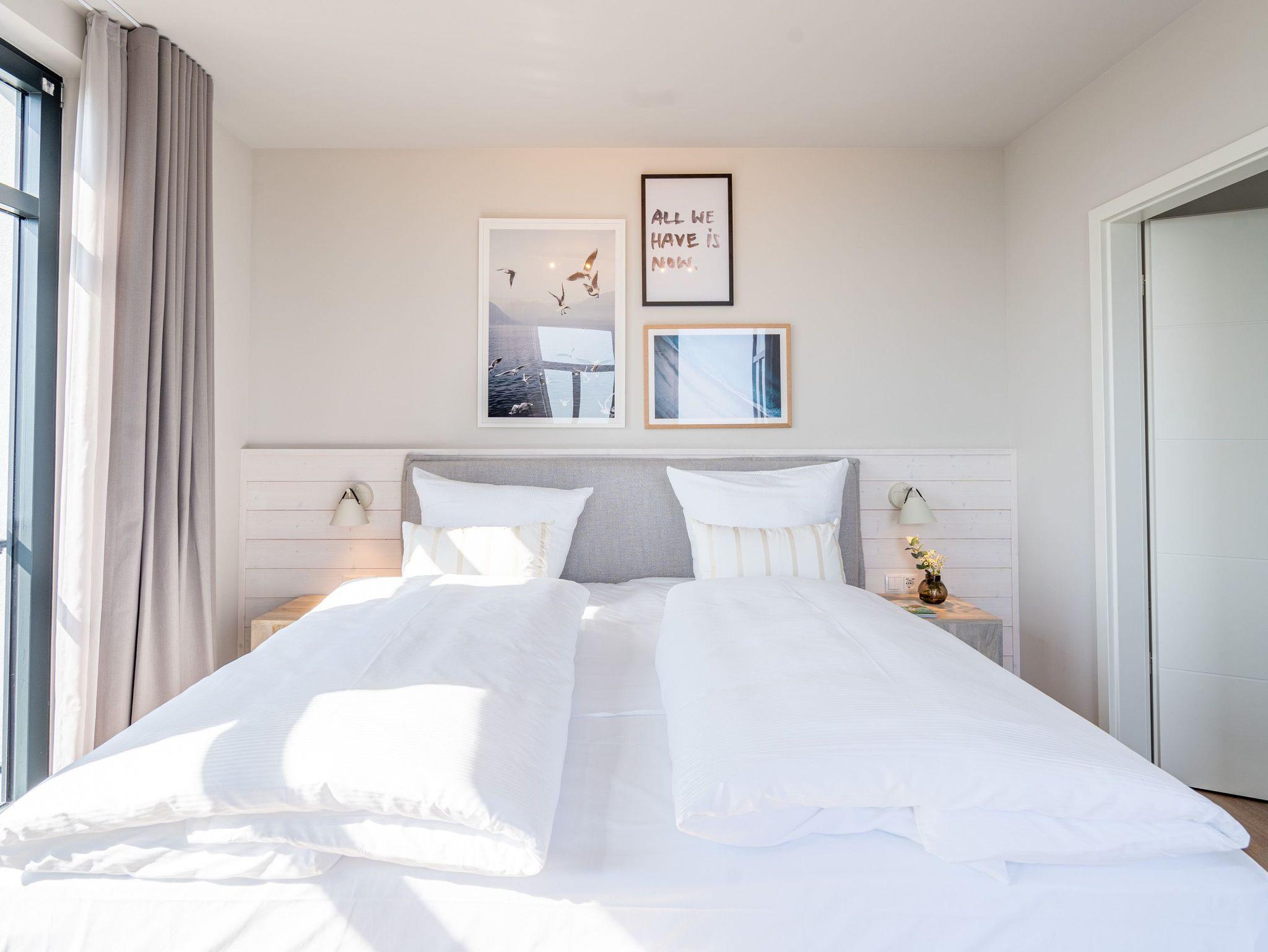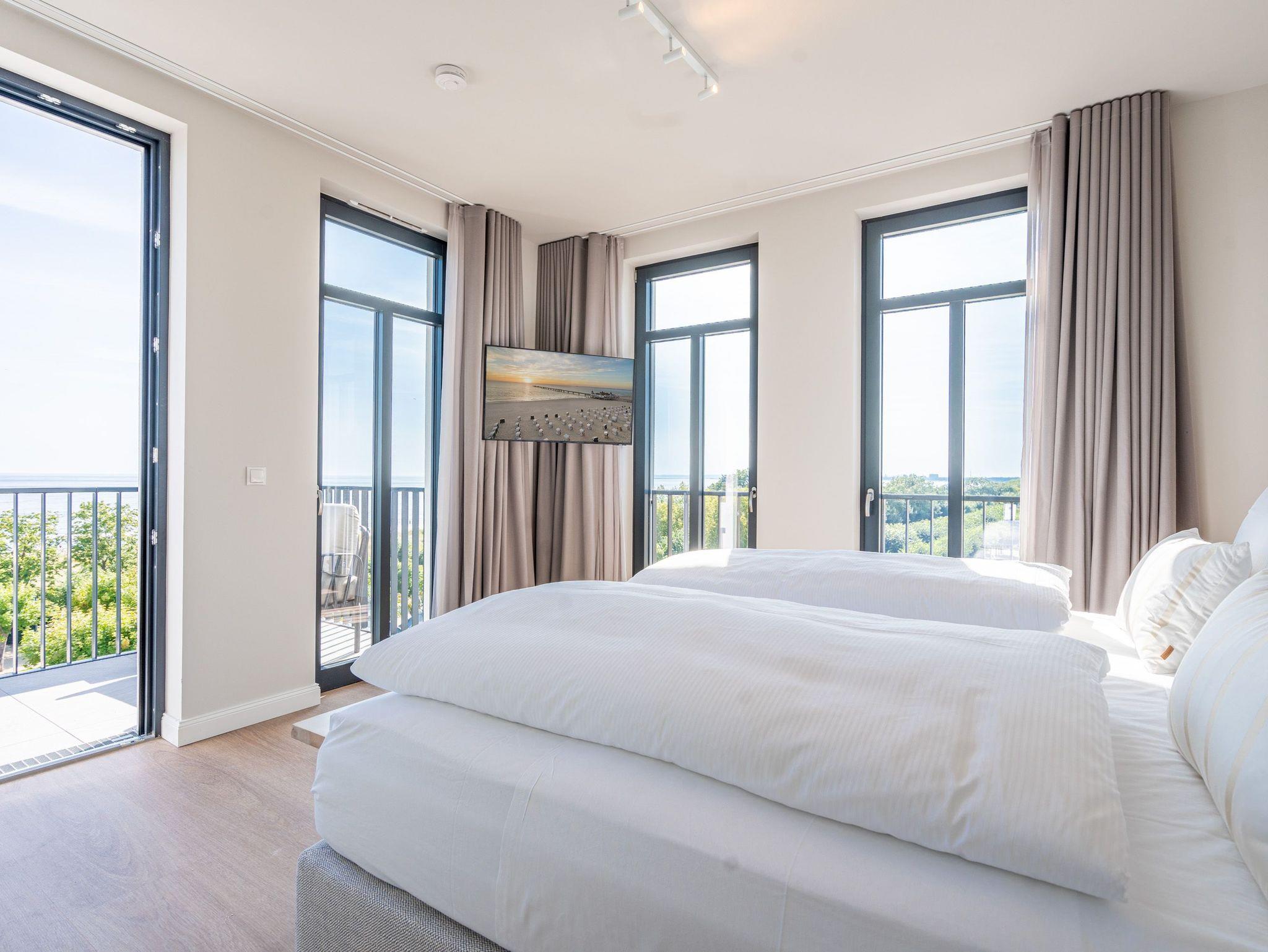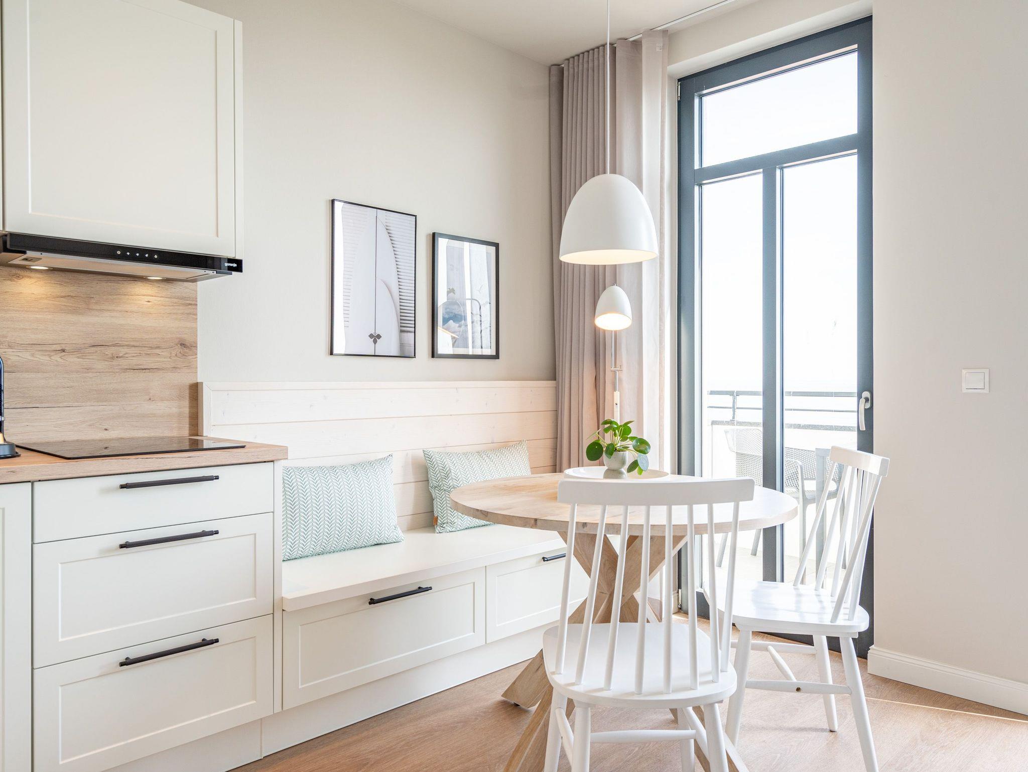 Visasvis der Seebrücke reicht der Blick aus dem exklusiven 2-Raum-Appartement A 3.4 (Haus A) in der 3. Etage von der Heringsdorfer Seebrücke bis nach Swinemünde. An Tagen mit klarer Seeluft sogar bis zu den weißen Klippen von Misdroy. Dieses kleine, aber feine Urlaubsdomizil wartet auf seinen 48 Quadratmetern mit viel Komfort und Finesse auf. Der offene Wohnbereich und das Schlafzimmer sind ideal für zwei Personen und sind ein Traum für alle Ostseeliebhaber. Denn von der werden Sie hier nicht genug bekommen. Nordisches Design gibt beim Interieur den Ton an. Modern und hyggelig zugleich. Genießen sie aus den stylischen, drehbaren Relaxsesseln die Füße auf bequeme Hocker ausgestreckt den fantastischen Blick aufs Meer. Ein Elektrokamin (ohne Wärmeabgabe) sorgt zudem für eine heimelige Atmosphäre. Sogar im Sommer. Ein 50-Zoll-Flachbildfernseher steht für Ihre Unterhaltung zur Verfügung. Die offene Küchenzeile ist mit einem Backofen, einem 3-Platten-Induktionskochfeld, einer Spülmaschine, einer Nespresso-Kapselmaschine und vielem mehr komplett ausgestattet. Hier fehlt es an nichts, um raffinierte Gerichte zu zaubern und sie anschließend am schönen Esstisch gemeinsam einzunehmen. Nur einen Schritt aus dem bodentiefen Fenster hinaus und Sie stehen auf dem ersten Ost-Balkon mit einem Beistelltisch, zwei Sesseln und einer Gartenliege. Entspannen Sie hier bei Sonnenschein und atmen die energieaufladende Brise, die direkt vom Wasser herüberweht, tief ein. Das Schlafzimmer verspricht im luxuriösen Boxspringdoppelbett (2,00m x 2,00m) wunderbare Stunden der Ruhe. Hier befindet sich ein großer Kleiderschrank und ein weiterer 43-Zoll-Flachbildfernseher. Mit Meerblick aufwachen, das ist doch purer Luxus. In diesem charmanten Appartement gehört er zur Grundausstattung dazu. Kaum aus dem Bett, können Sie vom Schlafzimmer aus auf dem zweiten Balkon (Richtung Ost) die aufgehende Sonne begrüßen. Denn auf Usedom entsteigt sie jeden Morgen der Ostsee. Das innenliegende Bad ist mit einer Dusche, einem Waschtisch und einer Toilette ausgestattet. Zur Wohnung gehört in der Tiefgarage ein PKW-Stellplatz. Genießen Sie in diesem wunderschönen Urlaubsparadies unvergessliche Tage am Meer.