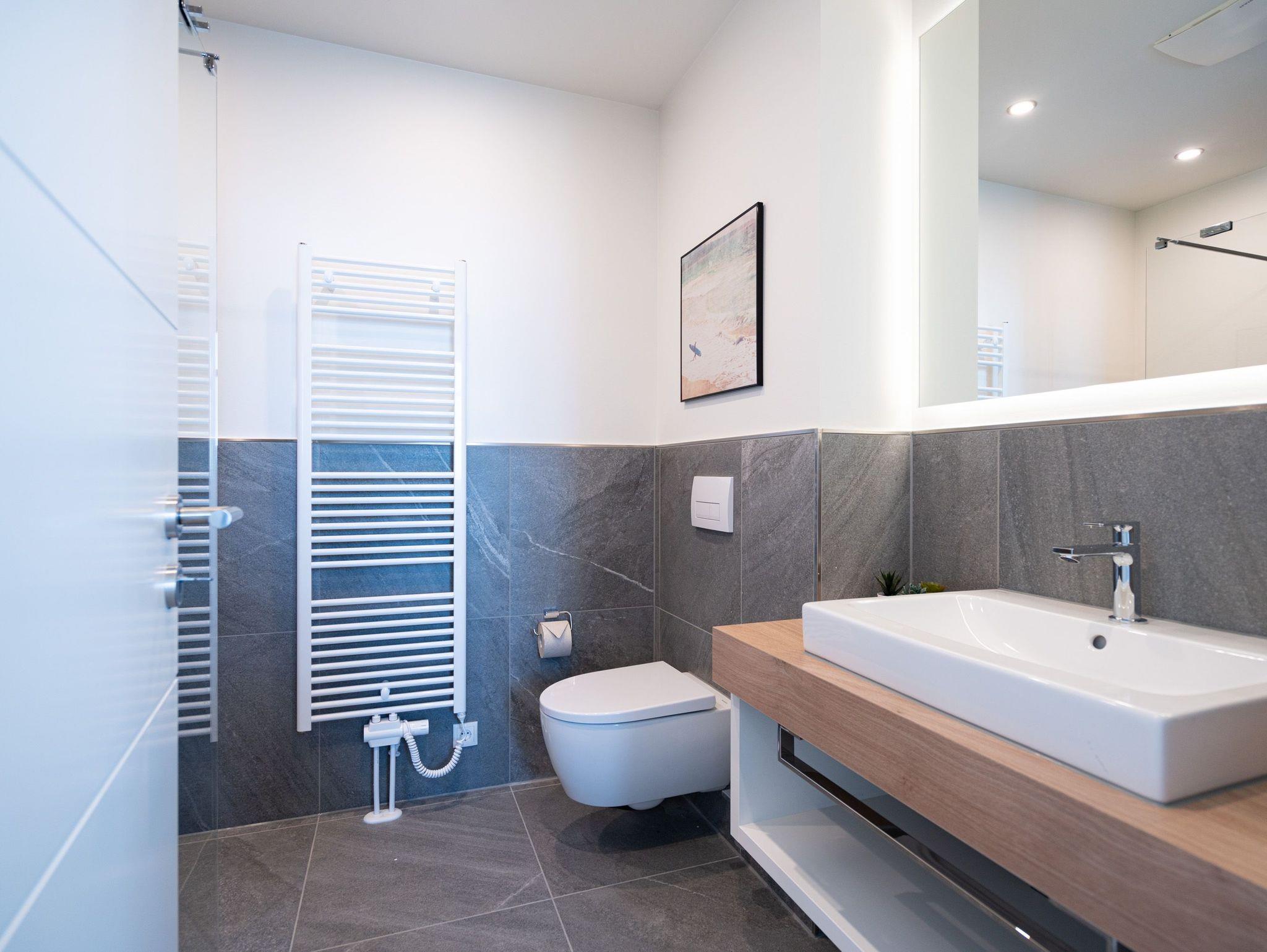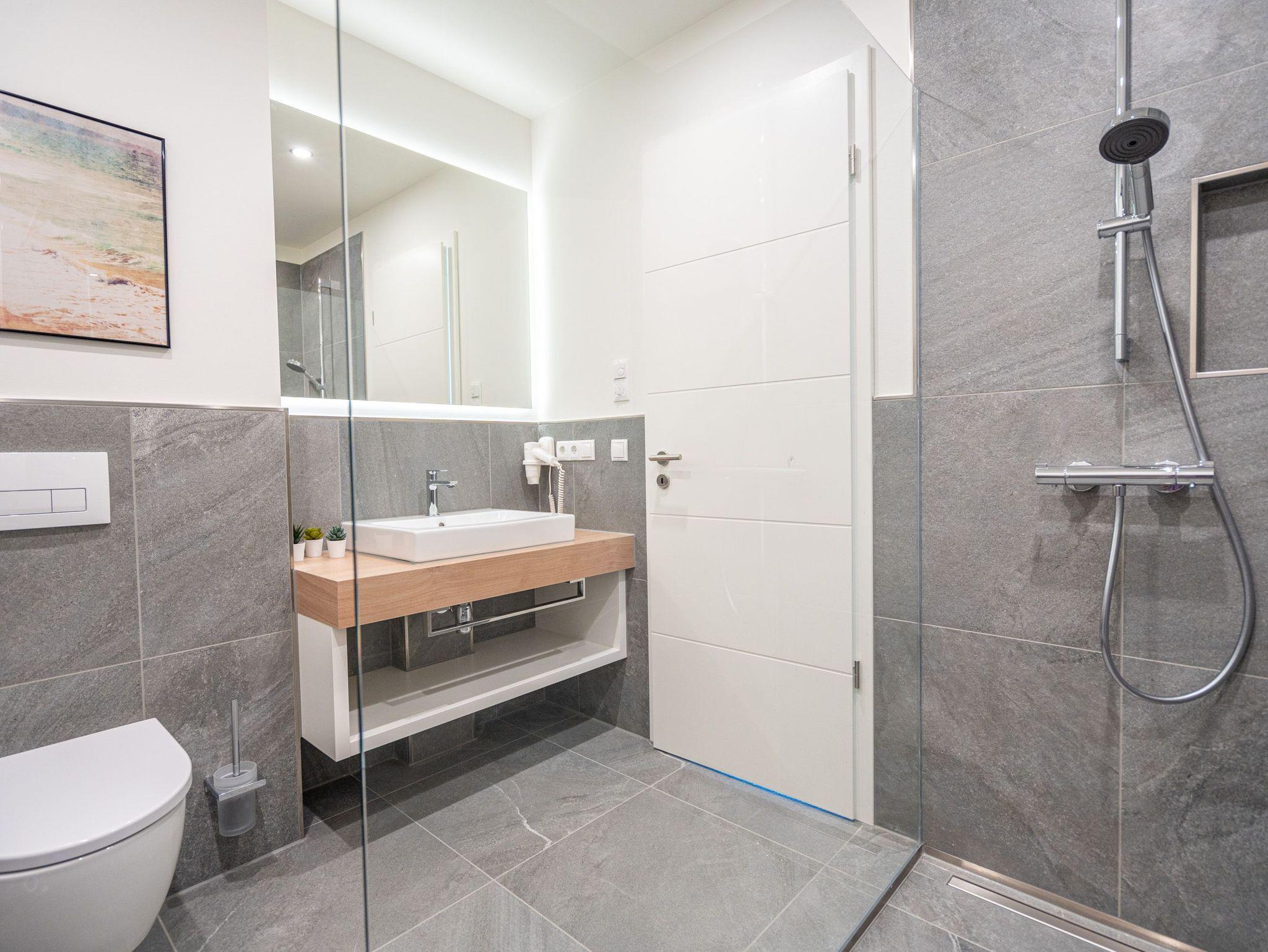 Die 2024 fertig gestellte Strandterrasse liegt direkt an der belebten Strandpromenade und bietet einen einzigartigen Ausblick auf die Grand Dame der historischen Seebrücken sowie die historische Konzertmuschel, einem beliebten Treffpunkt für Kunst und Kultur. Dahinter liegt die Ostsee ein Panorama, das zu den schönsten in den Kaiserbädern gehört. Es ist wie das Abtauchen in eine andere Zeit. In eine Zeit, in der man mit Stock, Sonnenschirm und Hut fürs Sehen und gesehen werden über die Promenade schlenderte; aber auch in eine Zeit, in der damals wie heute Zeit einmal für eine kurze Weile keine Rolle spielt. Weil man angekommen ist im Loslassen, Entspannen und Genießen. Es ist dieser besondere Geruch nach Meeresluft und Freiheit, der in Erinnerung bleibt. Dazu die Bilder, die man mitnimmt. Von langen Strandspaziergängen, vom Lachen in fröhlich schäumenden Ostseewellen, von der Zeit in einem wunderschönen Urlaubsdomizil. Denn genau das ist die Strandterrasse mit ihren 56 modernen und exklusiven Ferienappartements direkt gegenüber der Ahlbecker Seebrücke. Die Ein-, Zwei- oder Dreizimmerwohnungen zwischen 40 und 70 Quadratmeter groß sind von einer Innenarchitektin gemeinsam mit unserem Erfahrungsschatz an Gästewünschen mit viel Liebe zum Detail und ganz individuell konzipiert worden. Entspannung und Wohlfühlen stehen an erster Stelle. Alles ist aufeinander abgestimmt und sorgt für eine gemütliche Atmosphäre. Wählen Sie zwischen einem Domizil in einem hellen, sandfarbenen Designkonzept oder einem Appartement mit anthrazitfarbenen Farbakzenten. Alle Appartements verfügen gleichermaßen über eine stilvolle und komfortable Einrichtung, die passgenau angefertigt worden ist, sowie über moderne Küchen und Bäder. Jedem Schlafzimmer ist ein eigenes Bad mit Dusche zugeordnet (außer App. B4.5). Die Appartements besitzen fast alle einen Balkon viele schauen sogar zur Ostsee hinaus. Die meisten Feriendomizile haben einen Elektrokamin und Infrarotsaunen. Im Erdgeschoss befindet sich ein separater Gemeinschaftsraum für Fahrräder. Außerdem besteht die Möglichkeit, im Gemeinschaftswaschraum 2 Waschmaschinen [&] Trockner zu nutzen. Ergänzt wird das Angebot durch eine Gemeinschaftssauna, die täglich von 11:00 bis 22:00 Uhr nutzbar ist. In der Tiefgarage (Einfahrtshöhe 2,03 Meter) steht für jede Wohnung 1 Pkw-Stellplatz zur Verfügung. Ist alles zur Zufriedenheit untergebracht? Dann kann der Urlaub ja beginnen. Und beim Blick vom Balkon über die Ostsee treffen sich zum Sonnenaufgang das Heute und das Damals. Gelassenheit legt sich beim Gang hinunter an den Strand auf die Seele. Jetzt darf die Zeit stehenbleiben.