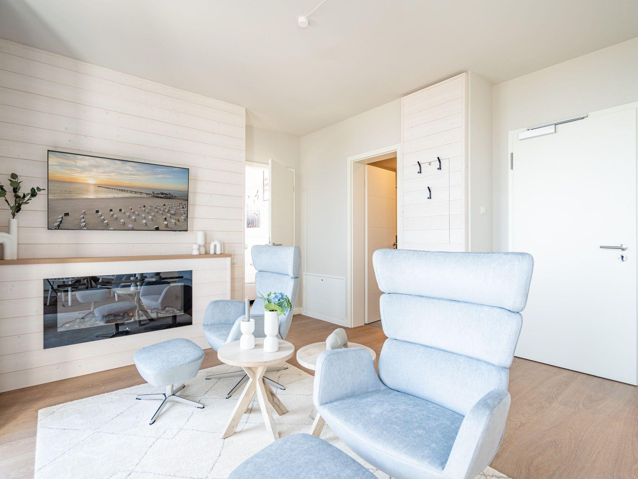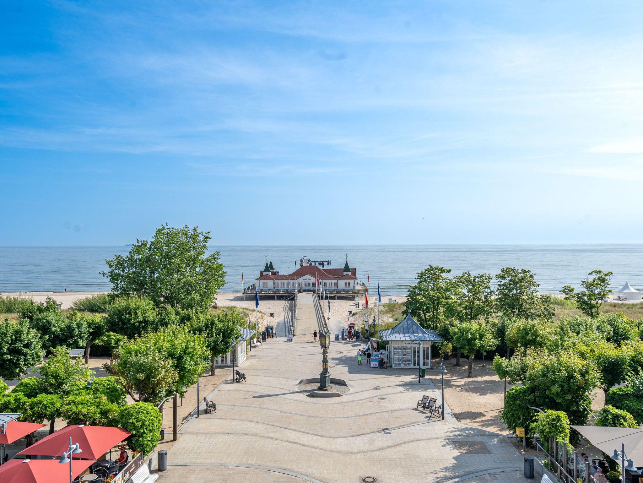 Die 2024 fertig gestellte Strandterrasse liegt direkt an der belebten Strandpromenade und bietet einen einzigartigen Ausblick auf die Grand Dame der historischen Seebrücken sowie die historische Konzertmuschel, einem beliebten Treffpunkt für Kunst und Kultur. Dahinter liegt die Ostsee ? ein Panorama, das zu den schönsten in den Kaiserbädern gehört. Es ist wie das Abtauchen in eine andere Zeit. In eine Zeit, in der man mit Stock, Sonnenschirm und Hut fürs „Sehen und gesehen werden“ über die Promenade schlenderte; aber auch in eine Zeit, in der ? damals wie heute ? Zeit einmal für eine kurze Weile keine Rolle spielt. Weil man angekommen ist im Loslassen, Entspannen und Genießen. Es ist dieser besondere Geruch nach Meeresluft und Freiheit, der in Erinnerung bleibt. Dazu die Bilder, die man mitnimmt. Von langen Strandspaziergängen, vom Lachen in fröhlich schäumenden Ostseewellen, von der Zeit in einem wunderschönen Urlaubsdomizil. Denn genau das ist die Strandterrasse mit ihren 56 modernen und exklusiven Ferienappartements direkt gegenüber der Ahlbecker Seebrücke. Die Ein-, Zwei- oder Dreizimmerwohnungen ? zwischen 40 und 70 Quadratmeter groß ? sind von einer Innenarchitektin gemeinsam mit unserem Erfahrungsschatz an Gästewünschen mit viel Liebe zum Detail und ganz individuell konzipiert worden. Entspannung und Wohlfühlen stehen an erster Stelle. Alles ist aufeinander abgestimmt und sorgt für eine gemütliche Atmosphäre. Wählen Sie zwischen einem Domizil in einem hellen, sandfarbenen Designkonzept oder einem Appartement mit anthrazitfarbenen Farbakzenten. Alle Appartements verfügen gleichermaßen über eine stilvolle und komfortable Einrichtung, die passgenau angefertigt worden ist, sowie über moderne Küchen und Bäder. Jedem Schlafzimmer ist ein eigenes Bad mit Dusche zugeordnet (außer App. B4.5). Die Appartements besitzen fast alle einen Balkon ? viele schauen sogar zur Ostsee hinaus. Die meisten Feriendomizile haben einen Elektrokamin und Infrarotsaunen. Im Erdgeschoss befindet sich ein separater Gemeinschaftsraum für Fahrräder. Außerdem besteht die Möglichkeit, im Gemeinschaftswaschraum 2 Waschmaschinen [&] Trockner zu nutzen. Ergänzt wird das Angebot durch eine Gemeinschaftssauna, die täglich von 11:00 bis 22:00 Uhr nutzbar ist. In der Tiefgarage (Einfahrtshöhe 2,03 Meter) steht für jede Wohnung 1 Pkw-Stellplatz zur Verfügung. Ist alles zur Zufriedenheit untergebracht? Dann kann der Urlaub ja beginnen. Und beim Blick vom Balkon über die Ostsee treffen sich zum Sonnenaufgang das Heute und das Damals. Gelassenheit legt sich beim Gang hinunter an den Strand auf die Seele. Jetzt darf die Zeit stehenbleiben.