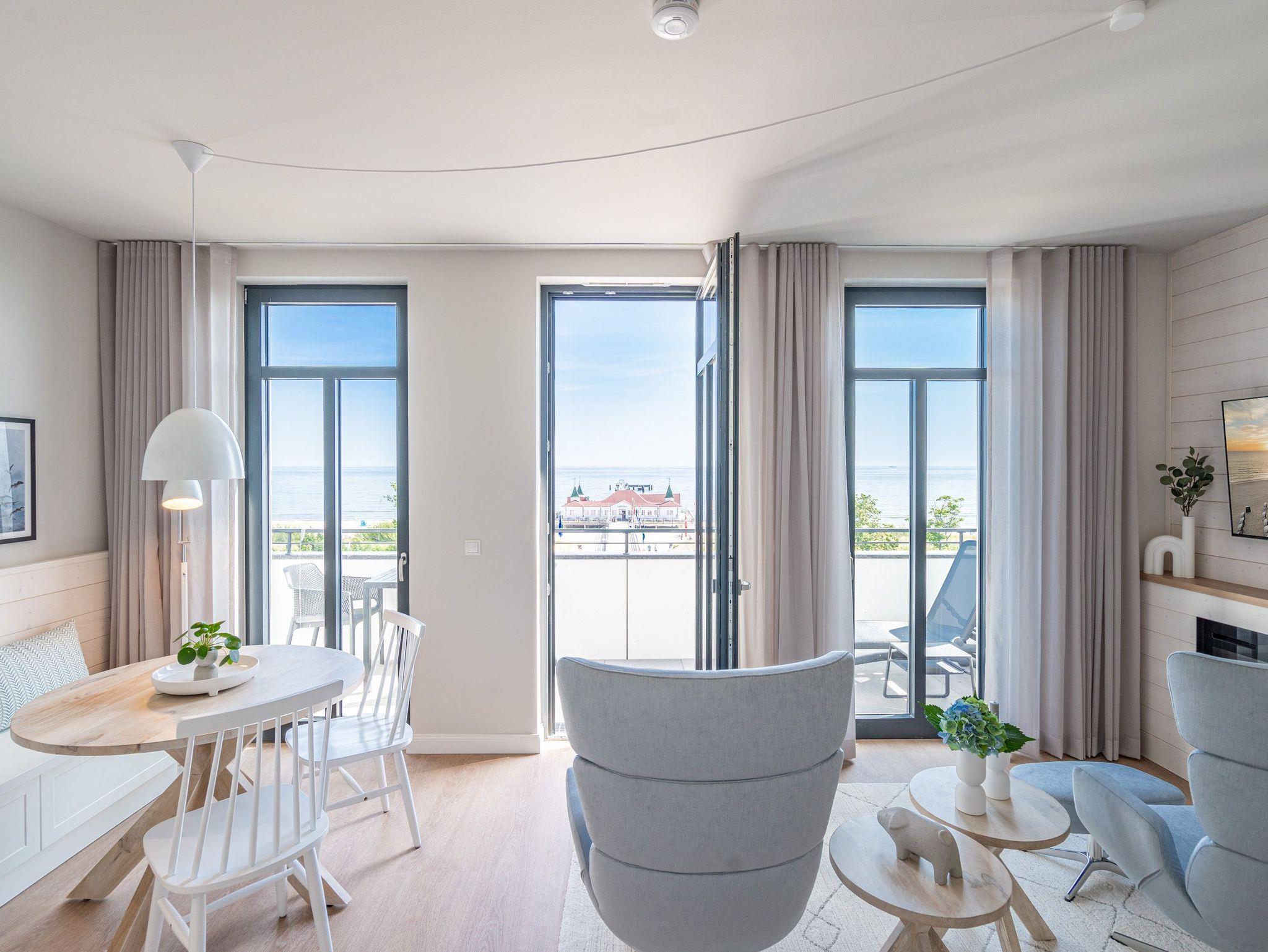 Visasvis der Seebrücke reicht der Blick aus dem exklusiven 2-Raum-Appartement A 3.4 (Haus A) in der 3. Etage von der Heringsdorfer Seebrücke bis nach Swinemünde. An Tagen mit klarer Seeluft sogar bis zu den weißen Klippen von Misdroy. Dieses kleine, aber feine Urlaubsdomizil wartet auf seinen 48 Quadratmetern mit viel Komfort und Finesse auf. Der offene Wohnbereich und das Schlafzimmer sind ideal für zwei Personen und sind ein Traum für alle Ostseeliebhaber. Denn von der werden Sie hier nicht genug bekommen. Nordisches Design gibt beim Interieur den Ton an. Modern und hyggelig zugleich. Genießen sie aus den stylischen, drehbaren Relaxsesseln ? die Füße auf bequeme Hocker ausgestreckt ? den fantastischen Blick aufs Meer. Ein Elektrokamin (ohne Wärmeabgabe) sorgt zudem für eine heimelige Atmosphäre. Sogar im Sommer. Ein 50-Zoll-Flachbildfernseher steht für Ihre Unterhaltung zur Verfügung. Die offene Küchenzeile ist mit einem Backofen, einem 3-Platten-Induktionskochfeld, einer Spülmaschine, einer Nespresso-Kapselmaschine und vielem mehr komplett ausgestattet. Hier fehlt es an nichts, um raffinierte Gerichte zu zaubern und sie anschließend am schönen Esstisch gemeinsam einzunehmen. Nur einen Schritt aus dem bodentiefen Fenster hinaus und Sie stehen auf dem ersten Ost-Balkon mit einem Beistelltisch, zwei Sesseln und einer Gartenliege. Entspannen Sie hier bei Sonnenschein und atmen die energieaufladende Brise, die direkt vom Wasser herüberweht, tief ein. Das Schlafzimmer verspricht im luxuriösen Boxspringdoppelbett (2,00m x 2,00m) wunderbare Stunden der Ruhe. Hier befindet sich ein großer Kleiderschrank und ein weiterer 43-Zoll-Flachbildfernseher. Mit Meerblick aufwachen, das ist doch purer Luxus. In diesem charmanten Appartement gehört er zur Grundausstattung dazu. Kaum aus dem Bett, können Sie vom Schlafzimmer aus auf dem zweiten Balkon (Richtung Ost) die aufgehende Sonne begrüßen. Denn auf Usedom entsteigt sie jeden Morgen der Ostsee. Das innenliegende Bad ist mit einer Dusche, einem Waschtisch und einer Toilette ausgestattet. Zur Wohnung gehört in der Tiefgarage ein PKW-Stellplatz. Genießen Sie in diesem wunderschönen Urlaubsparadies unvergessliche Tage am Meer.