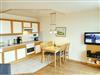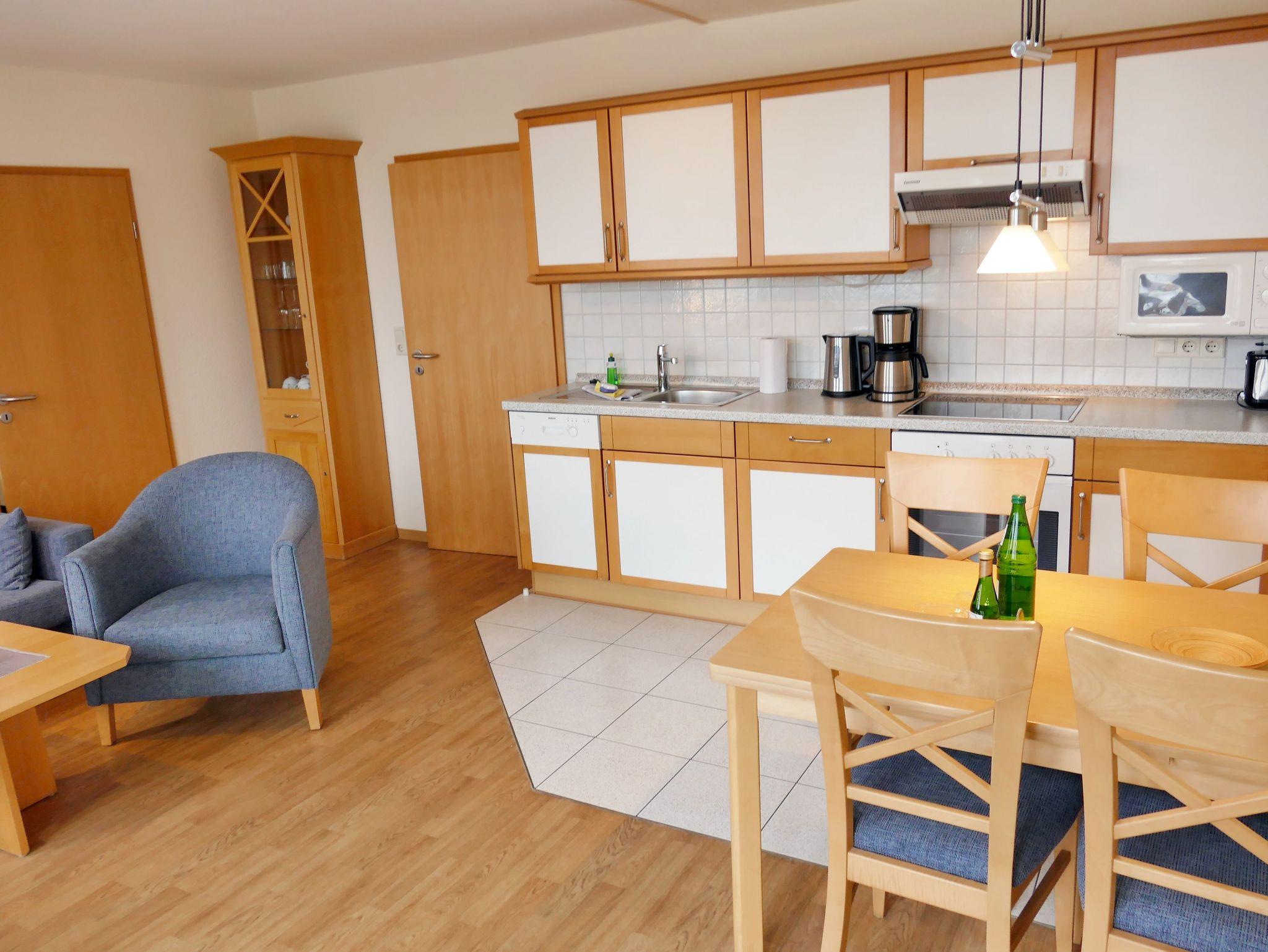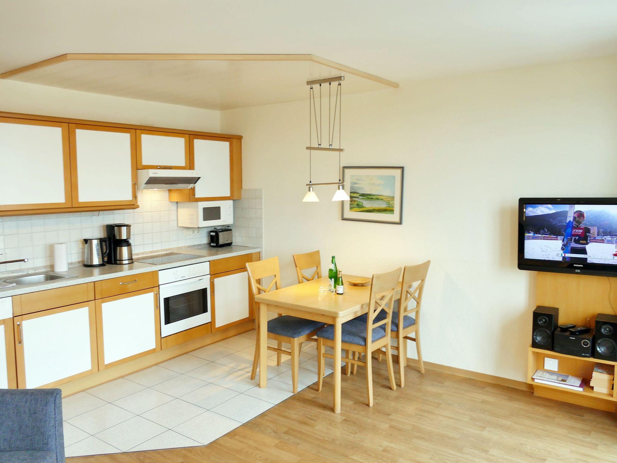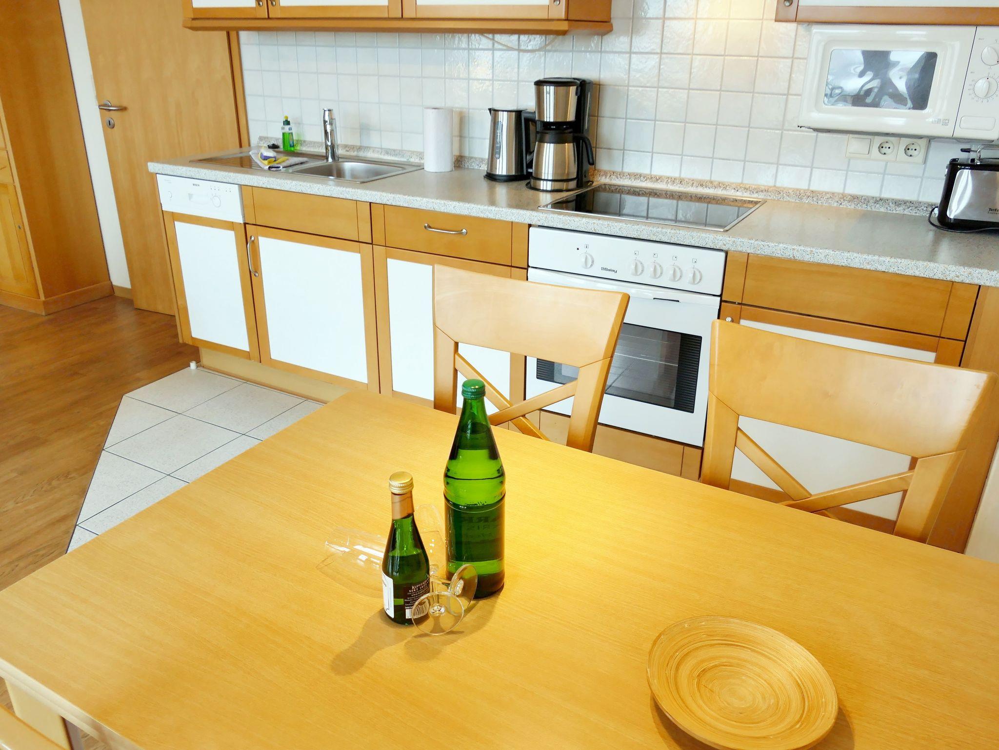 Die Küche ist u.a. mit Ceranfeld, Backofen, Mikrowelle, Spülmaschine, Kaffeemaschine und Toaster voll ausgestattet.