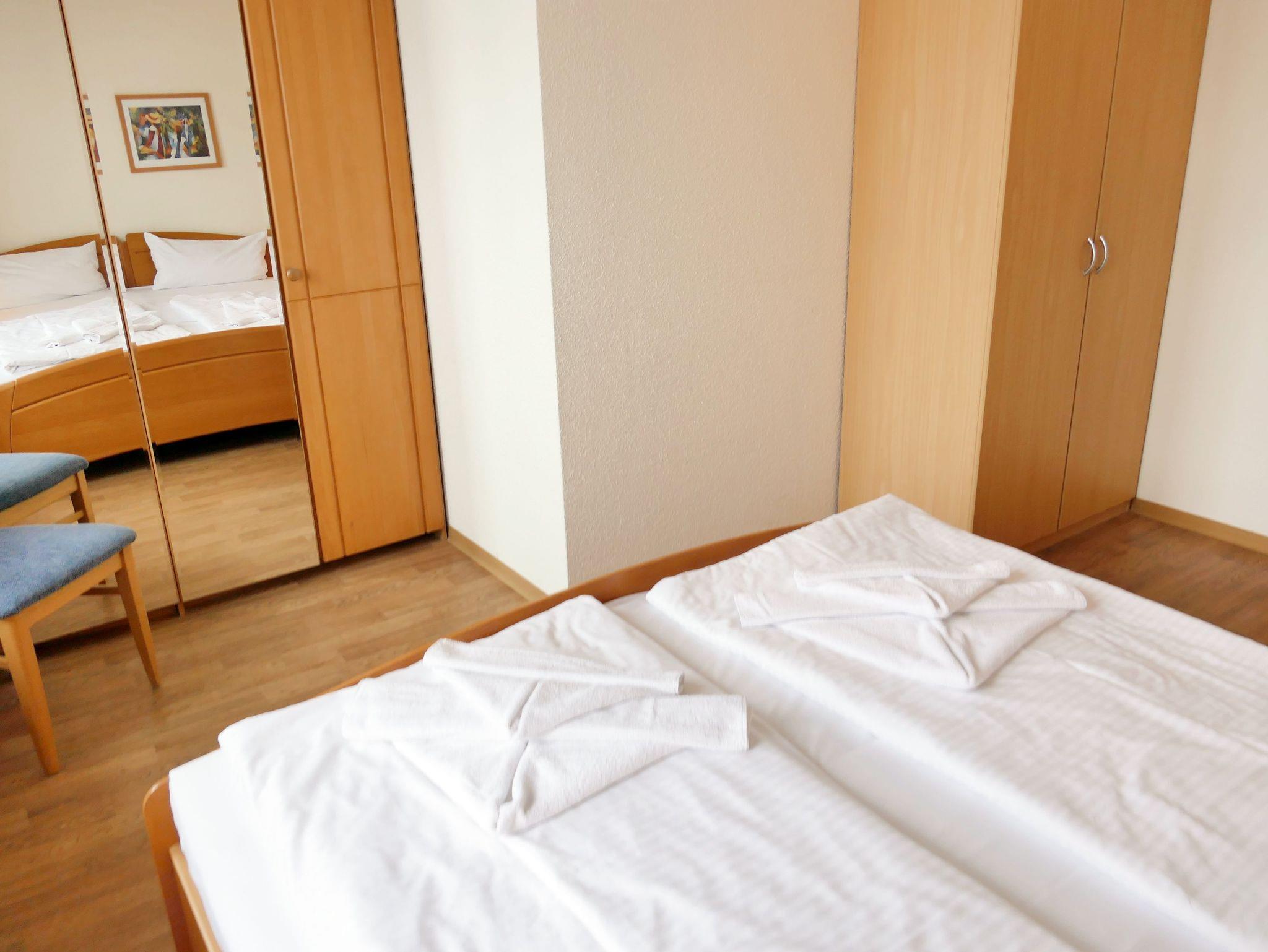 Ein grosses Wohnzimmer mit offener Einbauküche, ein großes Schlafzimmer mit Doppelbett, Kleiderschrank und Platz für ein Baby-Reisebett, ein kleines Schlafzimmer mit (ggf. durch klappbares Schrankbett zum Doppelbett erweiterbarem) Einzelbett, Bad mit Dusche sorgen für eine wohnliche Atmosphäre.