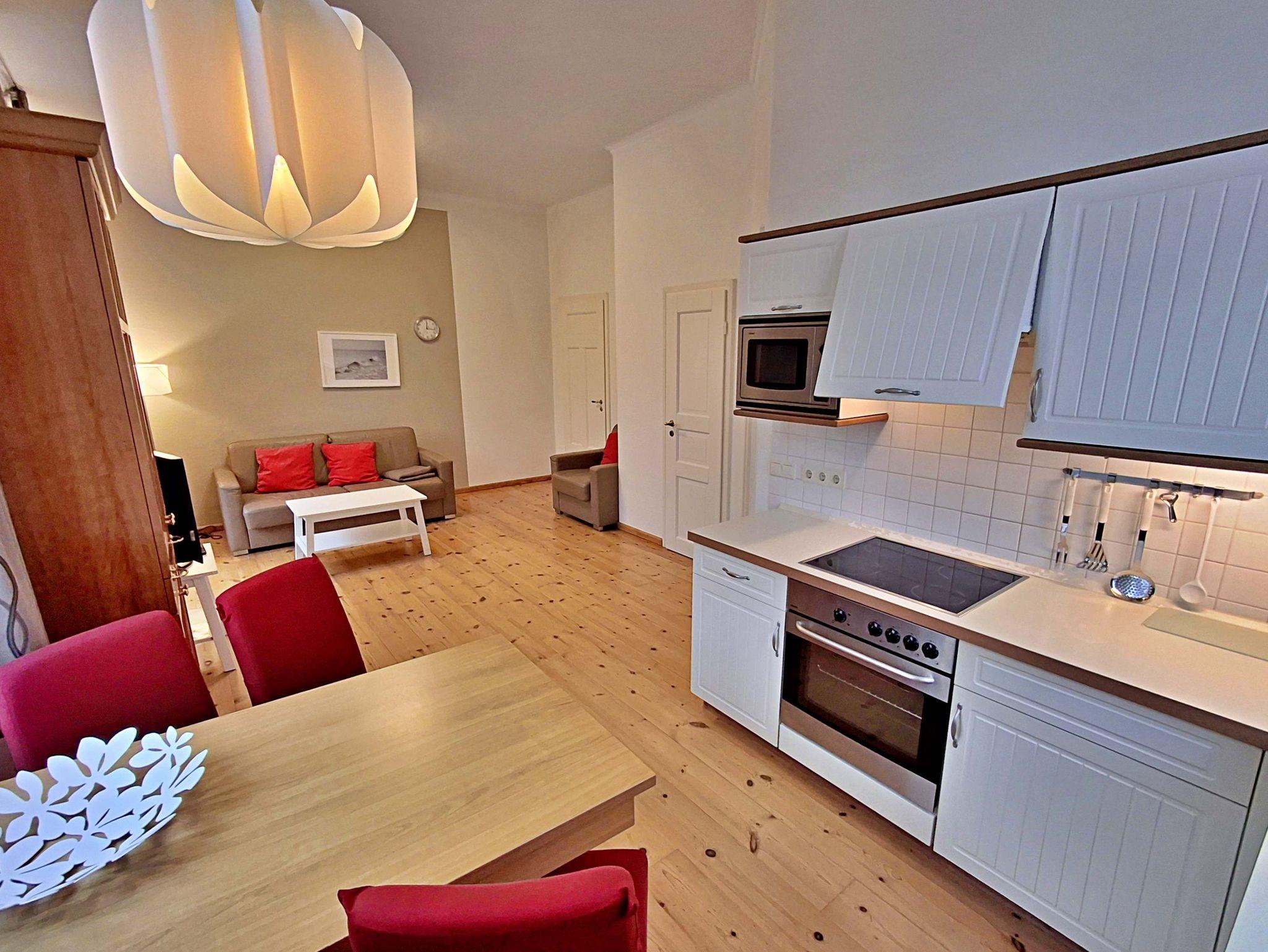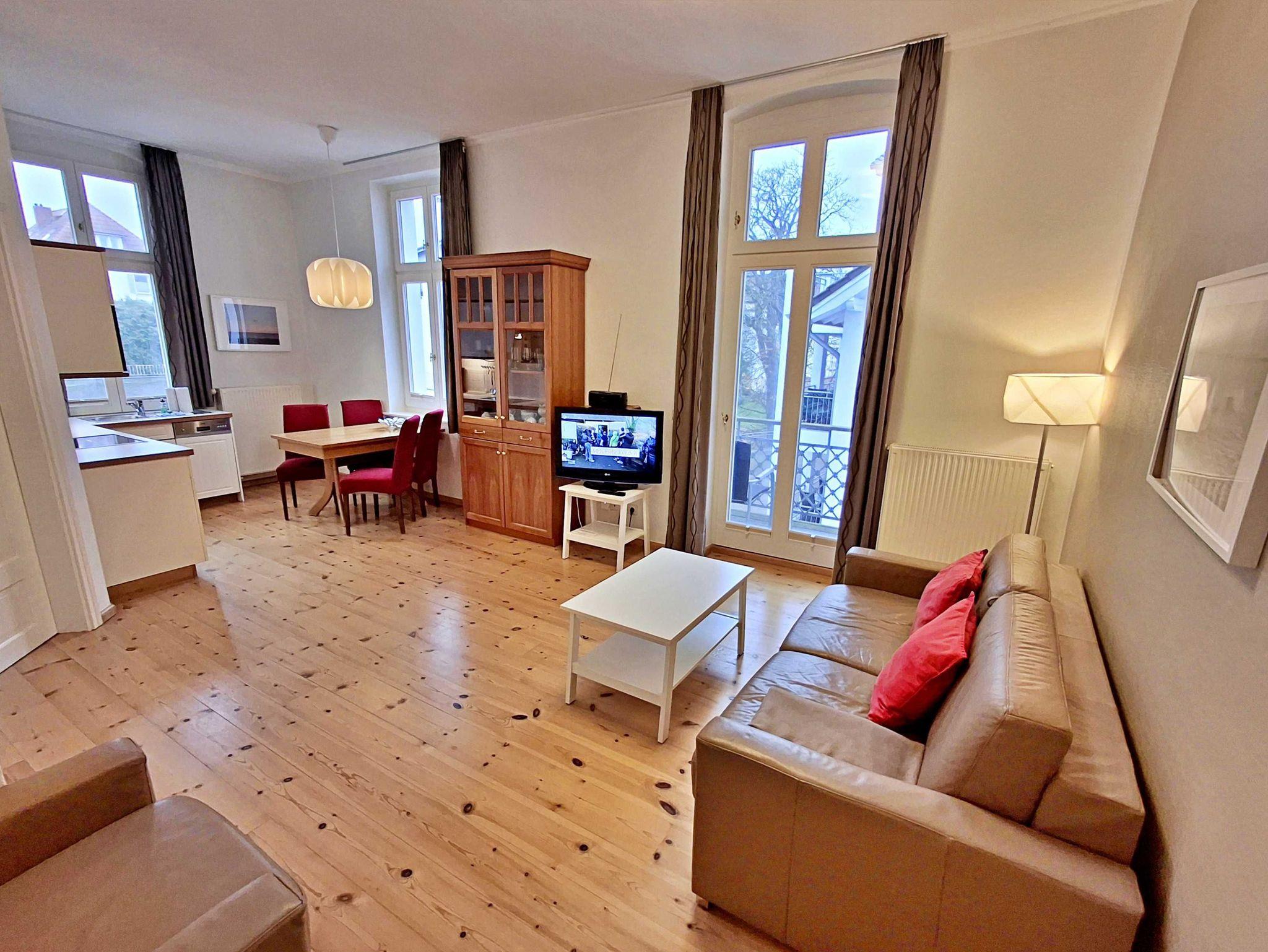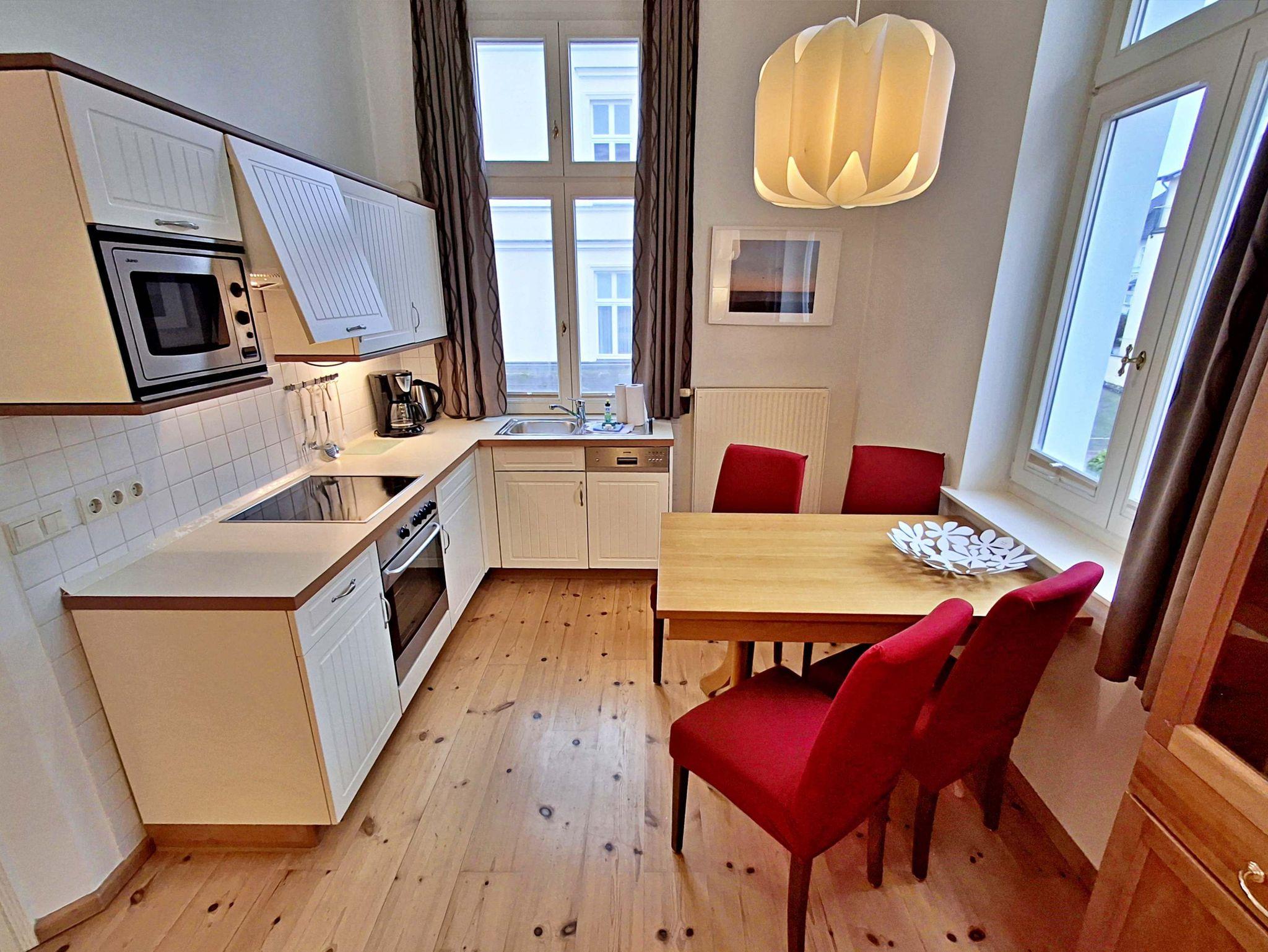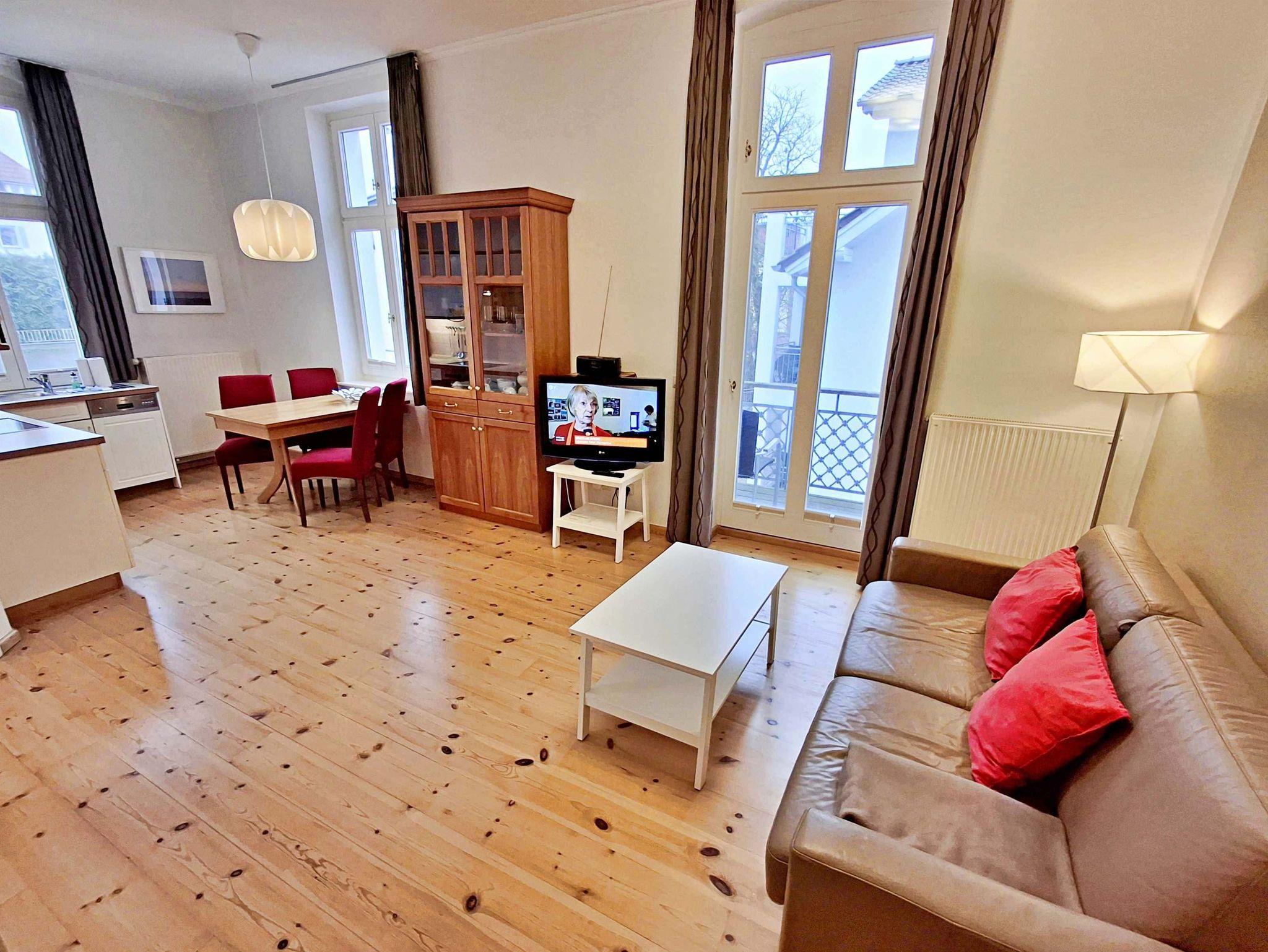 Die schöne 2-Zimmer-Wohnung Dierhagen mit Balkon im 1. Obergeschoss für max. 3 Erwachsene und 1 Kind bis 8 Jahre befindet sich in der stilvoll restaurierten Villa Ahlbeck - nur wenige Schritte von der Promenade und dem Strand entfernt. Im hellen Wohnbereich befinden sich neben einer gemütlichen Couch (Aufbettungsmöglichkeit für 2 Personen) auch ein Esstisch mit 4 Stühlen, der genügend Platz für 4 Personen bietet. Das Highlight der Wohnung ist der Balkon in West-Ausrichtung. Hier können Sie bereits morgens Ihren Kaffee genießen oder den Abend bei einem Glas Wein ausklingen lassen. Die moderne Küchenzeile mit Ceranherd, Backofen, Geschirrspüler, Mikrowelle, Kaffeemaschine, Wasserkocher und Toaster lässt keine Wünsche offen. Für die Unterhaltung sorgen ein Flachbild-TV, Radio-CD-Player und kostenfreies W-LAN. Das Schlafzimmer verfügt über ein Doppelbett und das Badezimmer hat Badewanne/WC.