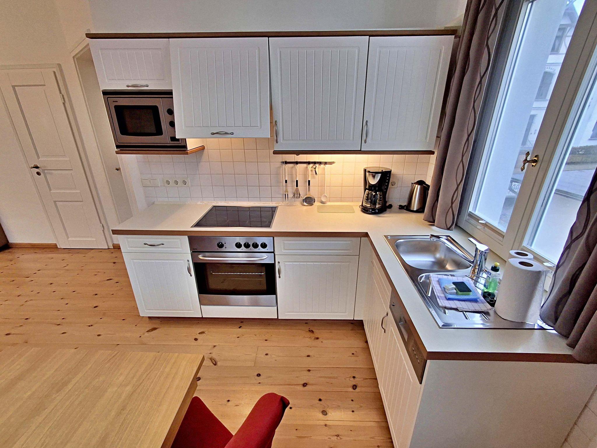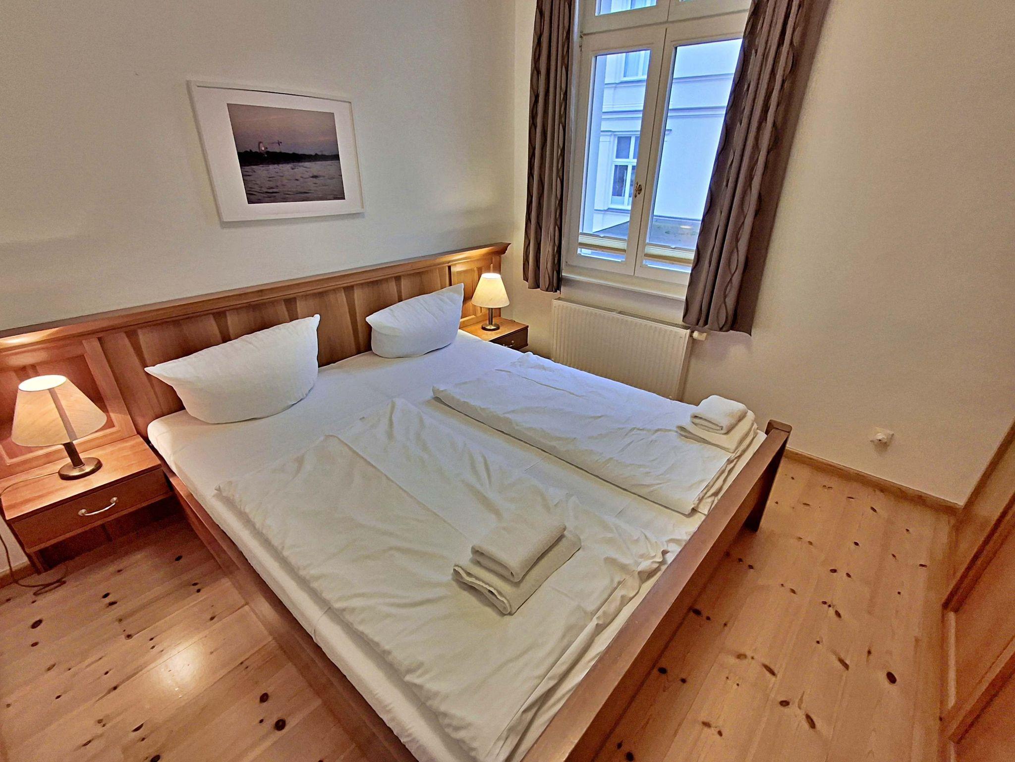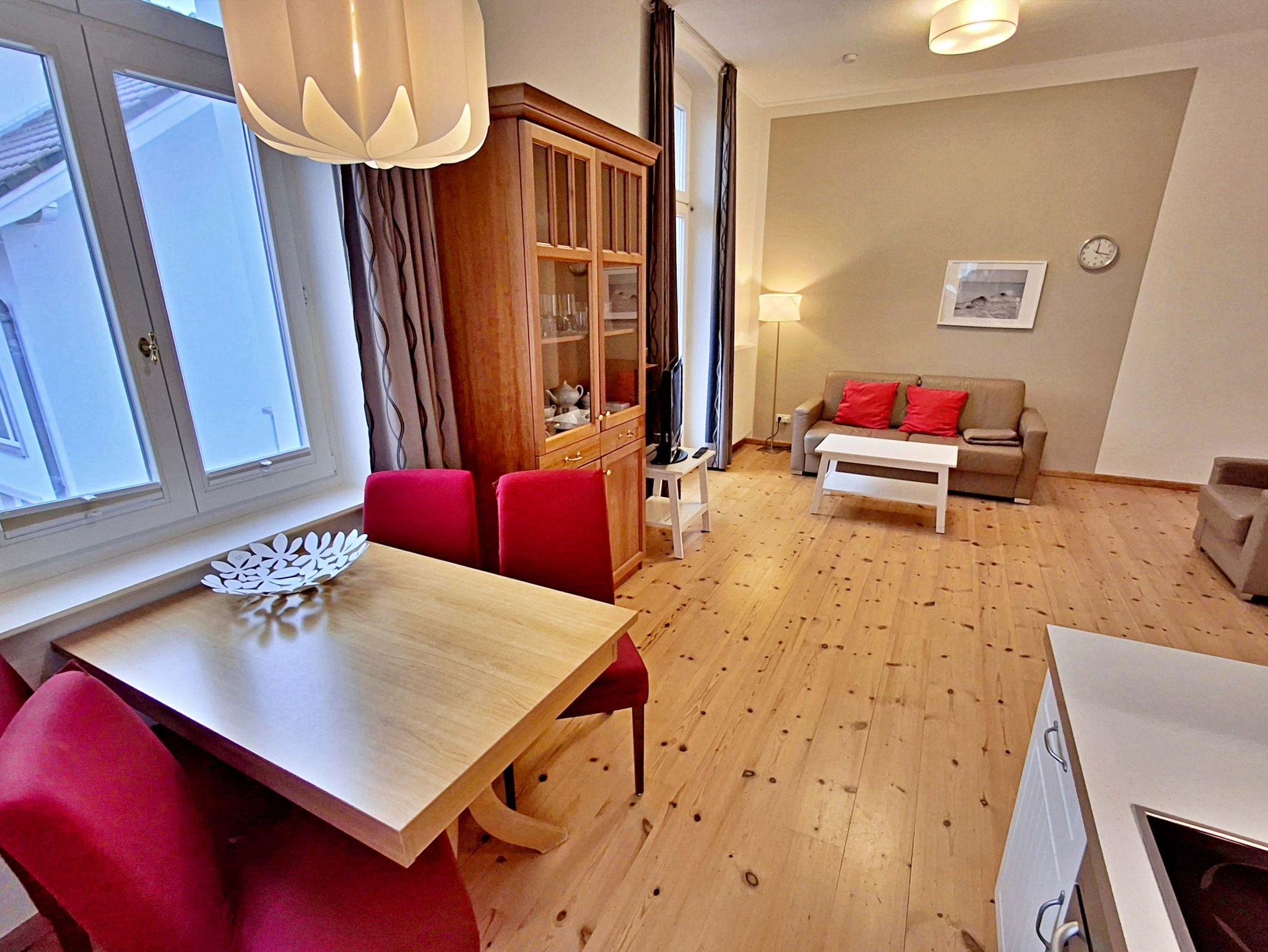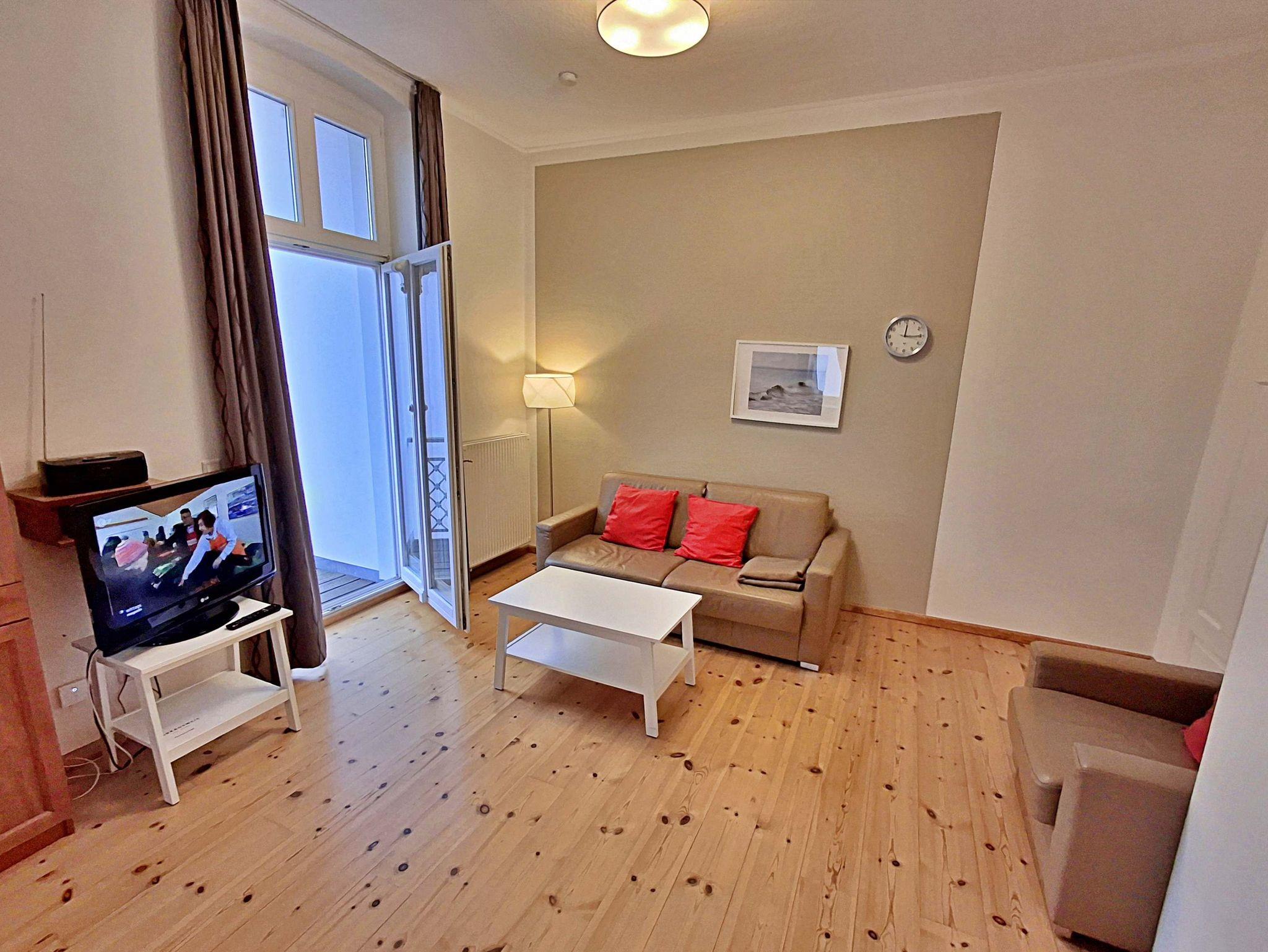 Die schöne 2-Zimmer-Wohnung Dierhagen mit Balkon im 1. Obergeschoss für max. 3 Erwachsene und 1 Kind bis 8 Jahre befindet sich in der stilvoll restaurierten Villa Ahlbeck - nur wenige Schritte von der Promenade und dem Strand entfernt. Im hellen Wohnbereich befinden sich neben einer gemütlichen Couch (Aufbettungsmöglichkeit für 2 Personen) auch ein Esstisch mit 4 Stühlen, der genügend Platz für 4 Personen bietet. Das Highlight der Wohnung ist der Balkon in West-Ausrichtung. Hier können Sie bereits morgens Ihren Kaffee genießen oder den Abend bei einem Glas Wein ausklingen lassen. Die moderne Küchenzeile mit Ceranherd, Backofen, Geschirrspüler, Mikrowelle, Kaffeemaschine, Wasserkocher und Toaster lässt keine Wünsche offen. Für die Unterhaltung sorgen ein Flachbild-TV, Radio-CD-Player und kostenfreies W-LAN. Das Schlafzimmer verfügt über ein Doppelbett und das Badezimmer hat Badewanne/WC.