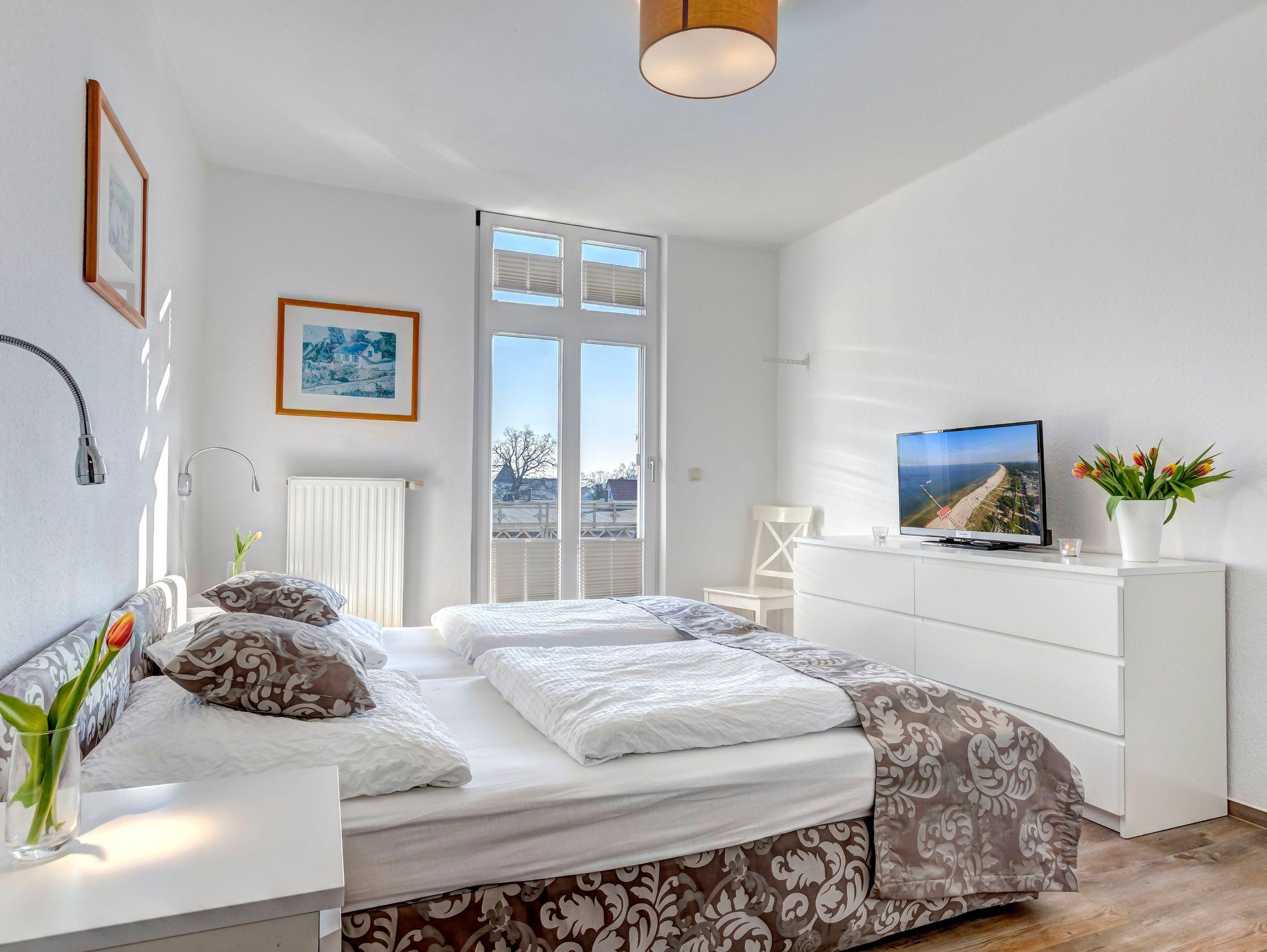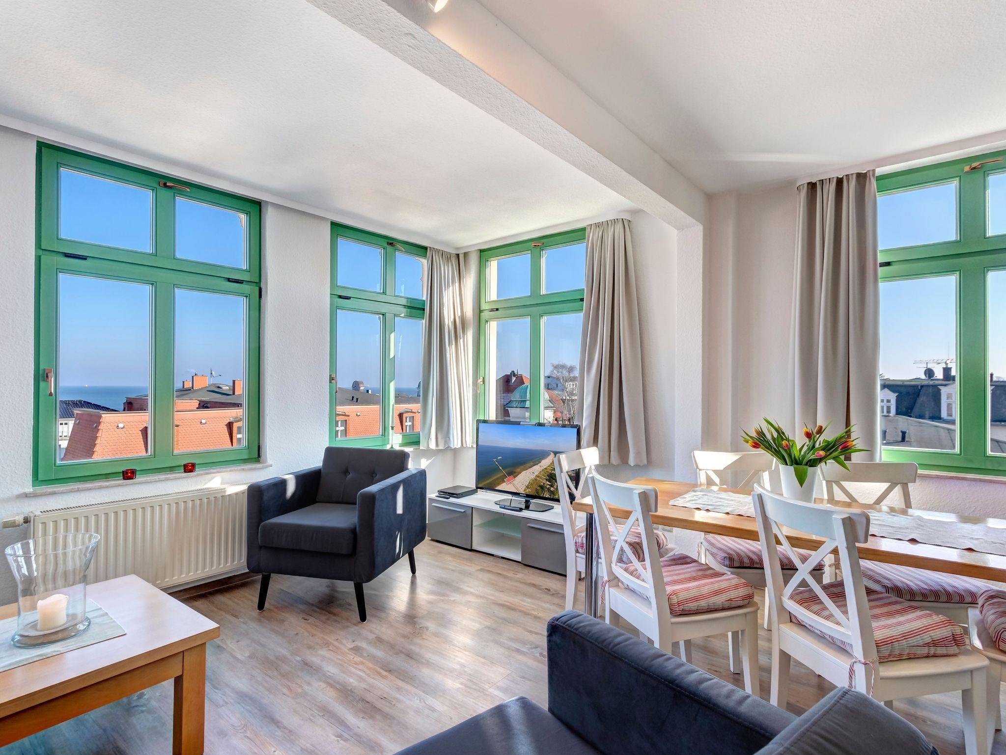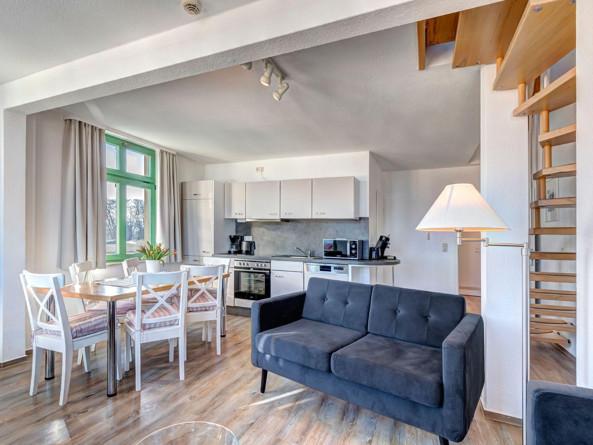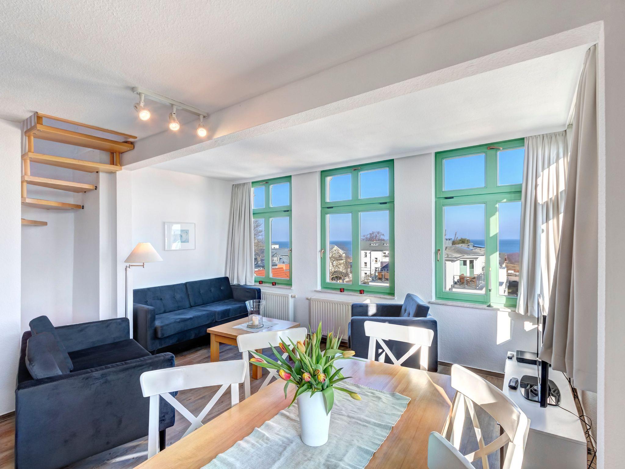 Das große 4-Zimmer-Masionette-Appartement Nr. 17 mit Seeblick und zusätzlichen Schlafraum auf der Empore befindet sich im zweiten und dritten Obergeschoss der Villa Ostseewarte. Auf der unteren Ebene befindet sich ein großer geräumiger Wohnraum mit gemütlicher Sitzgruppe, eine offene, voll ausgestattete Küche mit Kaffeemschine, Wasserkocher, Toaster, Mikrowelle, Backofen und Geschirrspüler sowie einem gemütlichen Essplatz. Das Bad auf der unteren Ebene ist mit Dusche und WC ausgestattet , das separate Schlafzimmer verfügt über ein großes Doppelbett. Ebenfalls auf der unteren Ebene befindet sich der im Sommer möblierte Balkon.