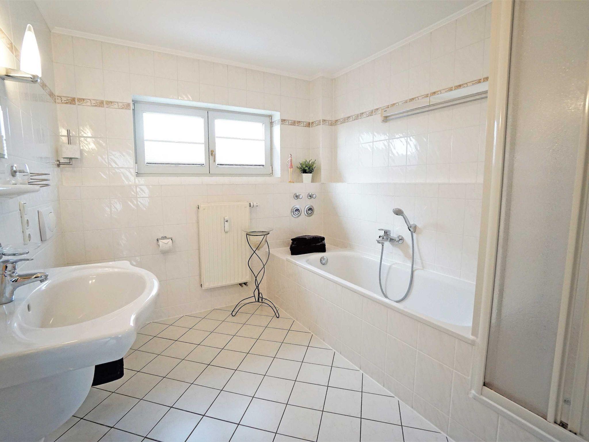 Desweiteren befindet sich im Obergeschoss das Badezimmer mit Dusche, Badewanne und WC.