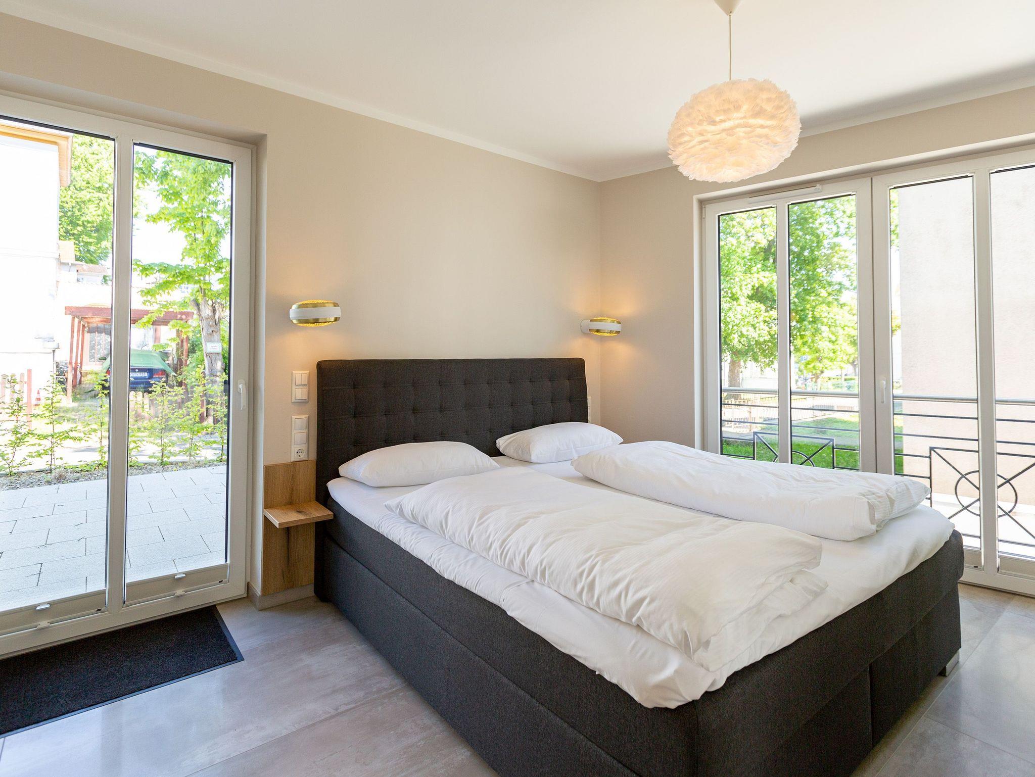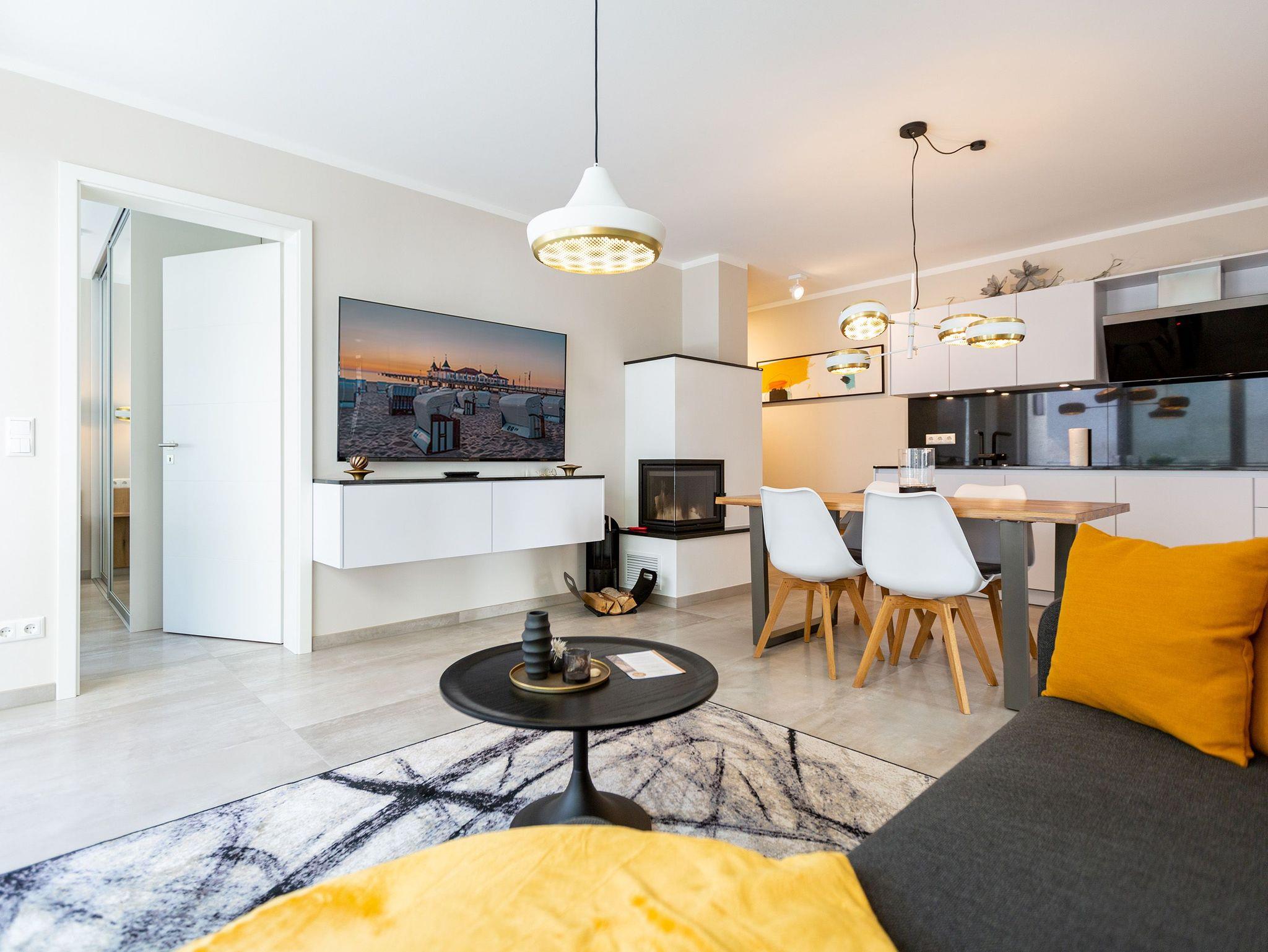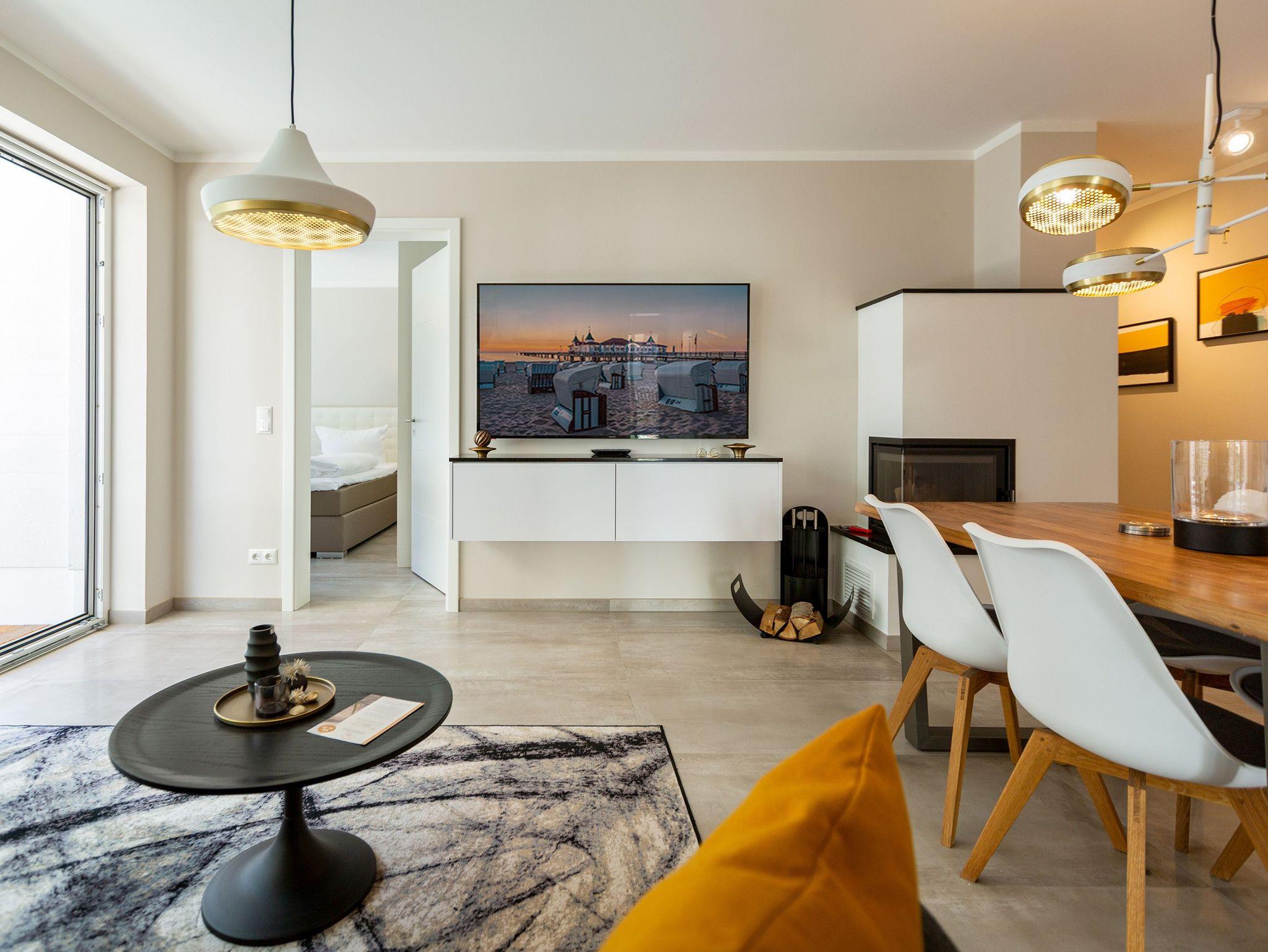 Balkon oder doch lieber Terrasse? Dieses wunderschöne, moderne und helle 3-Zimmer-Appartement im Erdgeschoss vom Quartier Sieben bietet bis zu vier Personen die Qual der Wahl. Denn idyllisch und sonnenüberflutet sind sowohl der Süd-Ost-Balkon (5 Quadratmeter) als auch die großzügige Süd-West-Terrasse mit Gartenmöbeln (22 Quadratmeter). Auch sonst finden Sie in den 69 Quadratmetern Wohnfläche alles vor, was Sie sich für eine entspannte Auszeit an der Ostsee nur vorstellen können. Ein großes, offenes Wohn-Esszimmer ist der Treffpunkt zum Entspannen und Genießen. Ein stylisches, aber überaus gemütliches Sofa wird zusammen mit dem großen Flat-TV zum Home-Kino. Das WLAN-Netz ist kostenfrei nutzbar. An kühlen Abenden schenkt der Kamin eine kuschelige Atmosphäre. Ausgefallen und ein echter Hingucker ist das Design-Lampenkonzept. Die ins Wohnzimmer integrierte Küche ist Highend vom Feinsten. Hochwertige Markengeräte machen das Kochen und Zubereiten der Mahlzeiten zu einem Kinderspiel. Es ist alles vorhanden: Ein Induktionsherd, eine Spülmaschine, eine Mikrowelle und vieles mehr. Edles Geschirr finden Sie in den Schränken. Zum Essen und für gemeinsame Stunden ist der hölzerne Esstisch ideal. Zwei Schlafzimmer mit je einem großen und bequemen Boxspringdoppelbett (1,80 m x 2,00 m), Flat-TV und Kleiderschrank dienen als lauschige Rückzugsorte. Das Appartement verfügt über zwei Bäder. Beide sind mit einer Dusche und einem WC ausgestattet. Darüber hinaus besitzt eines der Bäder sogar eine finnische Sauna und einen Waschtrockner. Bei Anreise sind die Betten bezogen und Handtücher liegen bereit. Die Wohnung hat Fußbodenheizung. In der Tiefgarage ist für Ihren Pkw der Stellplatz Nr. 3 reserviert.