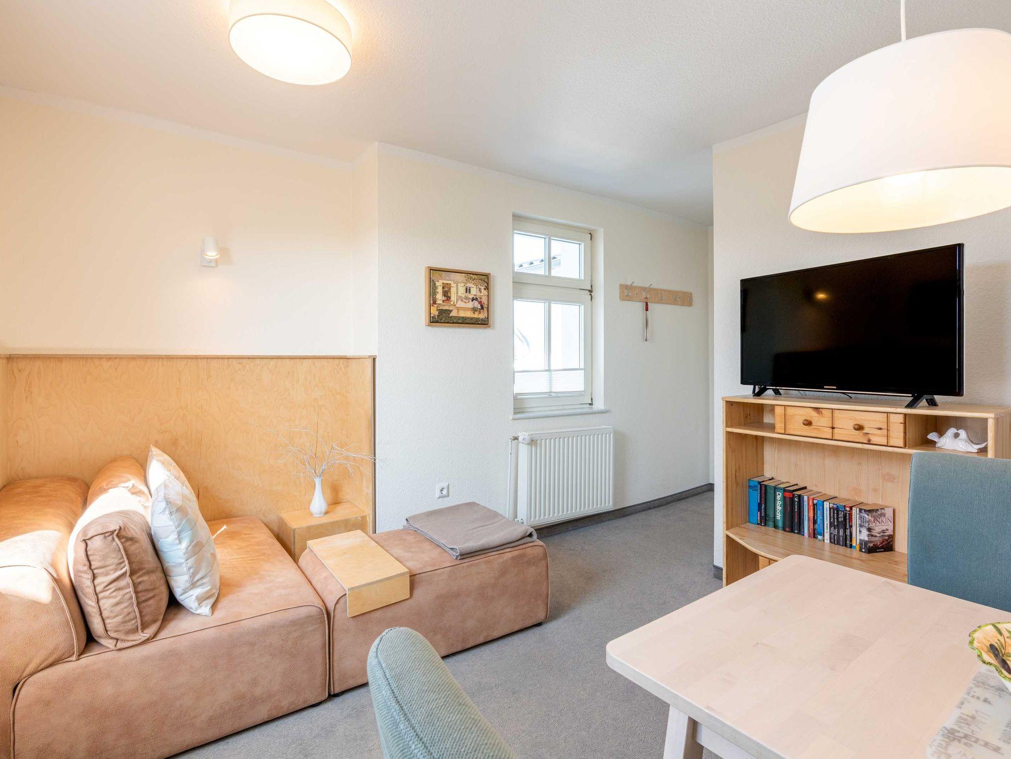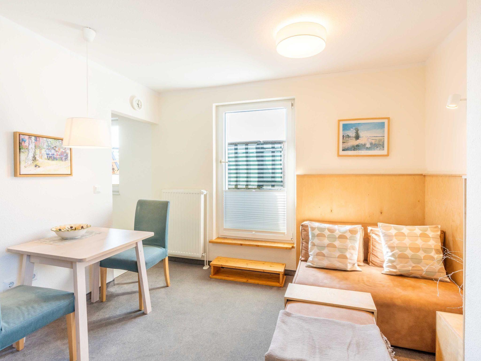 Die 30 m² große gemütliche Ferienwohnung im Dachgeschoss bietet Platz für 2 Personen. Sie verfügt über ein Schlafzimmer, einer Küche und einem Wohn- und Essbereich. Highlight dieser Wohnung ist die Dachterrasse, die einen schönen Ausblick über das Seebad bietet.
