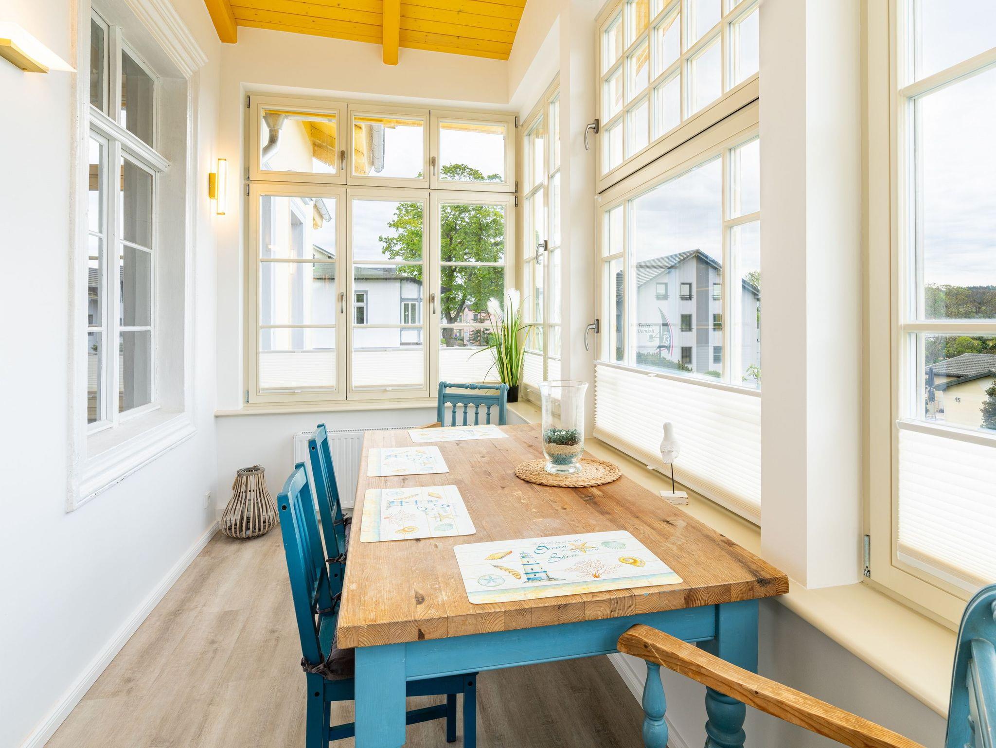 Der gemütliche Wohn- und Essbereich mit bequemen Sofa, Flat TV und separaten Esstisch lädt zu gemeinsamen Fernsehabenden und geselligem Beisammensein ein. Entspannen Sie nach einem erlebnisreichen Tag im angrenzenden Wintergarten mit Blick ins Grüne bei einer schönen Tasse Kaffee. Bereiten Sie gemeinsam in der großen Küche im Landhausstil Ihre Lieblingsspeisen zu. Diese ist komplett eingerichtet: Herd, Backofen, Kühlschrank mit Tiefkühlfach, Geschirrspülmaschine, Mikrowelle, Kaffeemaschine, Toaster und Wasserkocher. Die insgesamt 6 Schlafplätze verteilen sich auf 2 Schlafzimmer und das Sofa im Wohnbereich lässt sich im Handumdrehen zu einer gemütlichen Schlafstätte für 2 Personen verwandeln. Das erste Schlafzimmer ist mit einem bequemen Doppelbett ausgestattet. Im angrenzenden Wintergarten können Sie bei einem schönen Glas Wein den weitläufigen Blick über Ahlbeck genießen. Das zweite Schlafzimmer bietet ein komfortables Doppelbett für einen erholsamen Schlaf. Das Badezimmer ist mit Dusche, WC und einem Haartrockner ausgestattet.