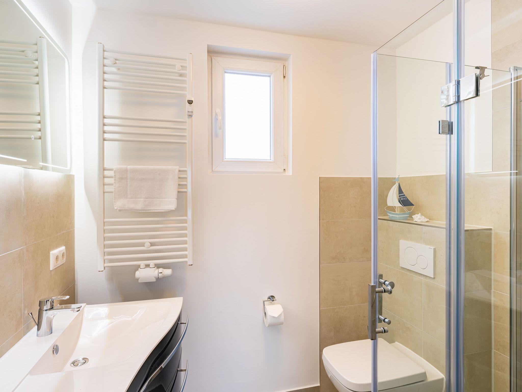 Das helle und freundliche Badezimmer ist mit einer Dusche, WC und einem Haartrockner ausgestattet.