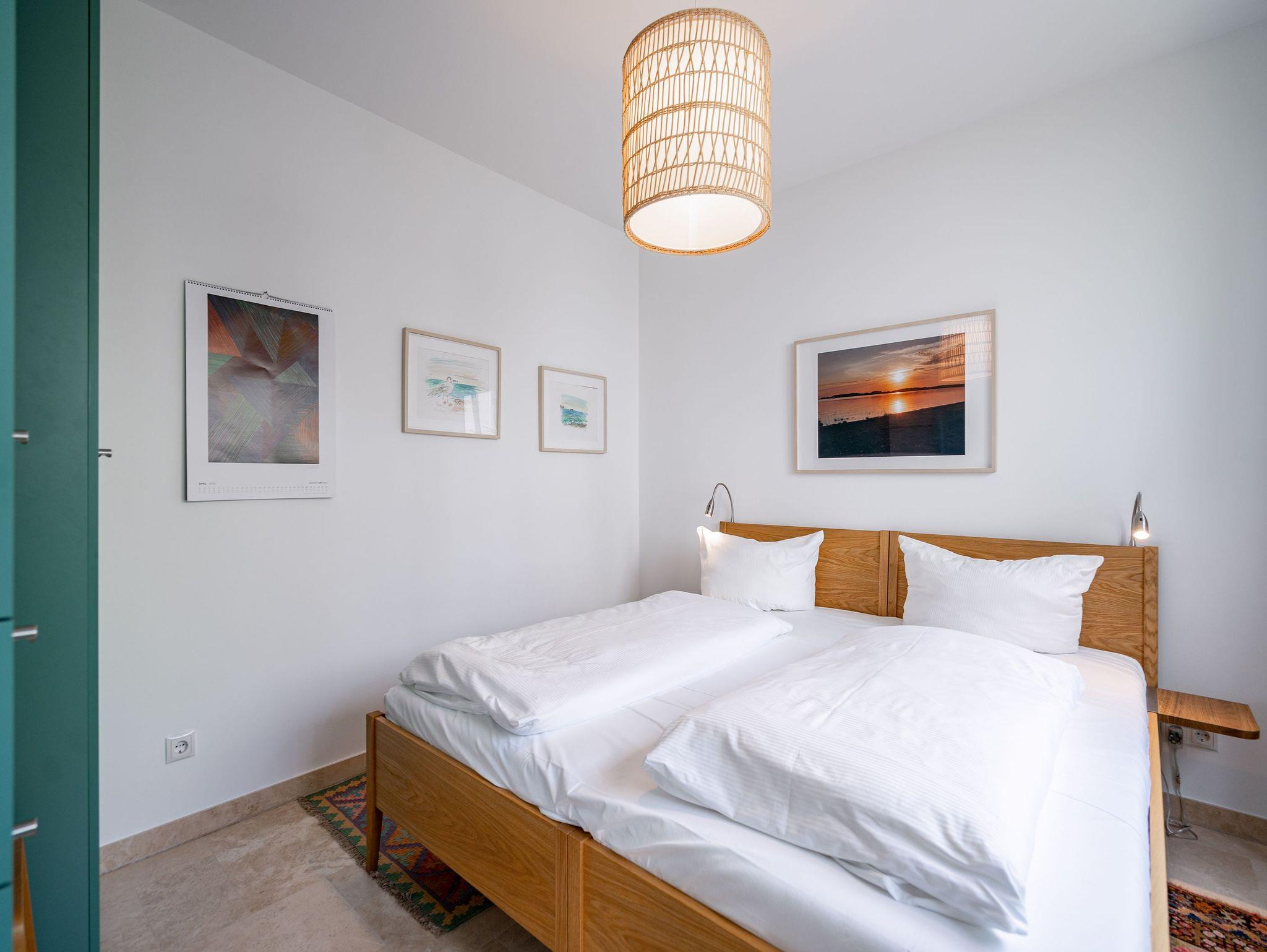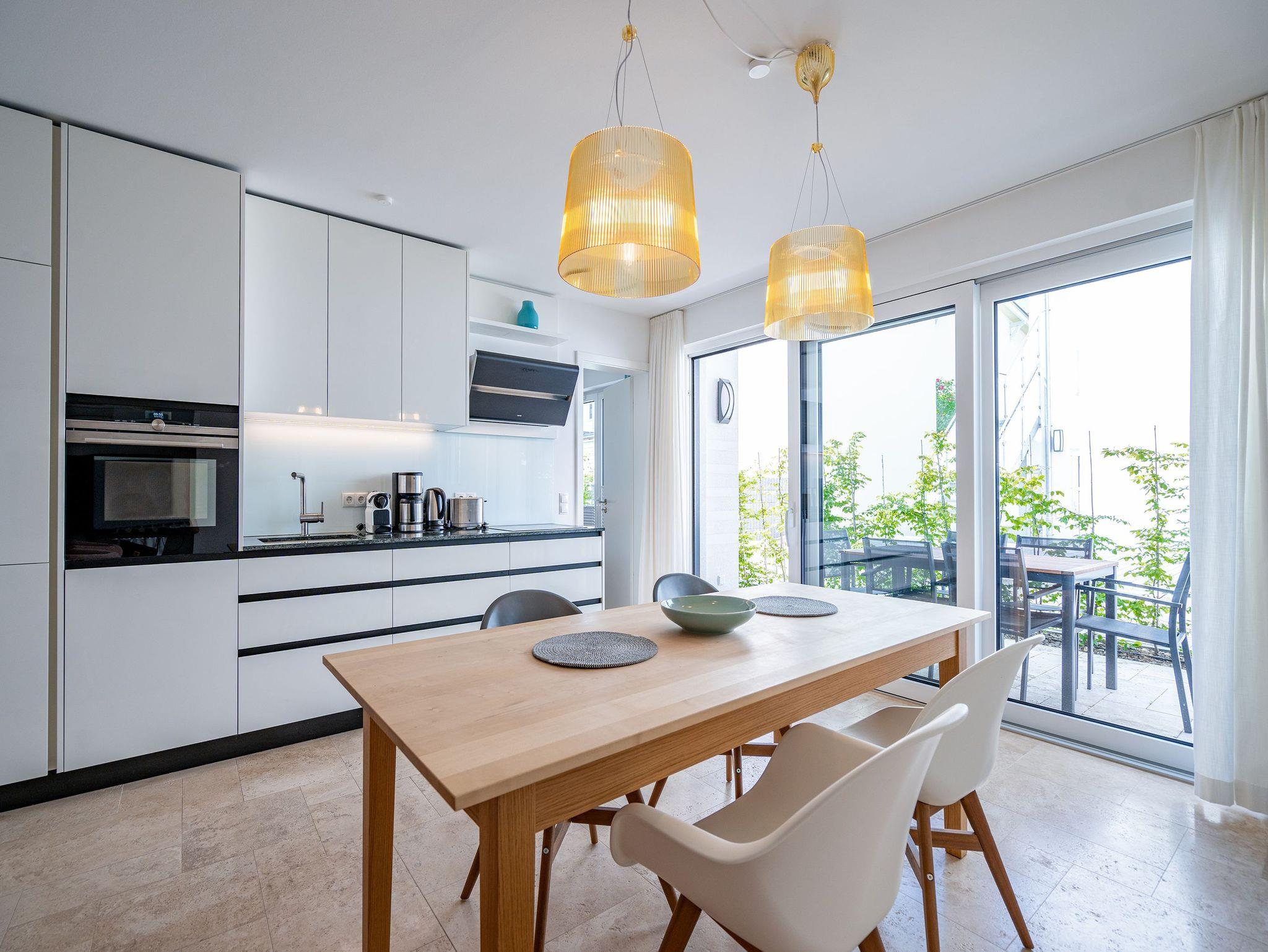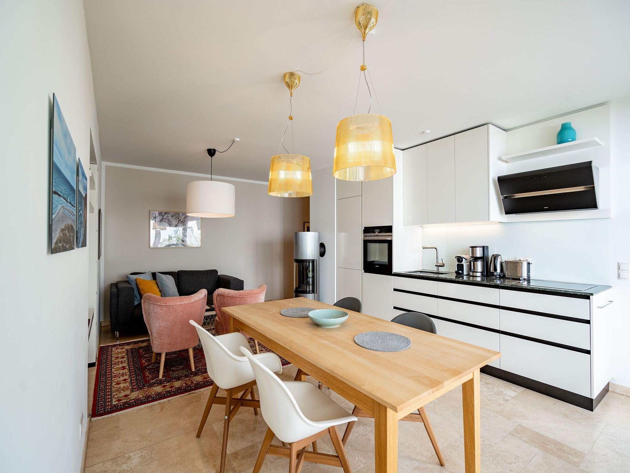 Zu ebener Erde gelegen und mit zwei wunderschönen Sonnen-Terrassen ausgestattet, ist das Appartement Nummer 01 mit seinen 79 Quadratmetern ein ideales Urlaubsdomizil für alle Ostseeliebhaber, die Wert auf Komfort und eine entspannte Atmosphäre legen. Bis zu vier Personen kann das aus drei Zimmern bestehende Wohlfühlreich aufnehmen. Alle drei Räume sowie die beiden Bäder wurden mit viel Liebe und einem Händchen fürs Dekor eingerichtet. Das große, offene Wohn-Esszimmer besitzt bodentiefe Fenster. Das sorgt für eine lichte und leichte Atmosphäre. Die gemütliche Sitzgruppe aus Sofa und Sesseln lädt zum Runterkommen und Entspannen ein. Highlight und Eyecatcher ist der Echtholz-Kamin. Wenn es draußen stürmt und ungemütlich wird, wird es hier drinnen, dank der knisternden Flammen, gemütlich und romantisch. Ein großer Flat-TV beschert das kuschelige Heimkino-Gefühl. Ein schöner Esstisch bietet Platz zum Schlemmen und Beisammensitzen. Von hier aus geht?s hinaus auf die Süd-West-Terrasse (ca. 14 Quadratmeter). Mit Gartenmöbeln bestückt, können Sie bis in die späten Nachmittagsstunden hinein die Sonne genießen. An das Wohnzimmer angeschlossen ist eine offene, moderne Küche. Ob Herd, Geschirrspüler oder Kaffeemaschine ? sämtliche Geräte sind hochwertig und auf dem neuesten Stand. Ein komplettes Geschirr-Set finden Sie in den Schränken. Beide Schlafzimmer verfügen über Doppelbetten (1,80 m x 2,00 m) und einen geräumigen Schrank mit einem kleinen Schreibtisch ( eines mit Flat-TV). Aus einem der Schlafzimmer haben Sie Zugang zu einer zweiten Nord-West-Terrasse mit Gartenmöbeln (ca. 18 Quadratmeter). Die Bäder sind modern, verfügen über Dusche, Waschtisch und WC. Zudem haben beide Bäder Tageslicht. Freuen Sie sich auf kühle Tage oder Abende. Denn dann lädt die wohnungseigene finnische Sauna zum Schwitzen und Relaxen ein. Handtücher liegen bei Anreise bereit. Und auch die Betten sind bezogen. Das WLAN ist kostenfrei. In der Tiefgarage ist der Stellplatz Nummer 1 für Ihr Auto reserviert.