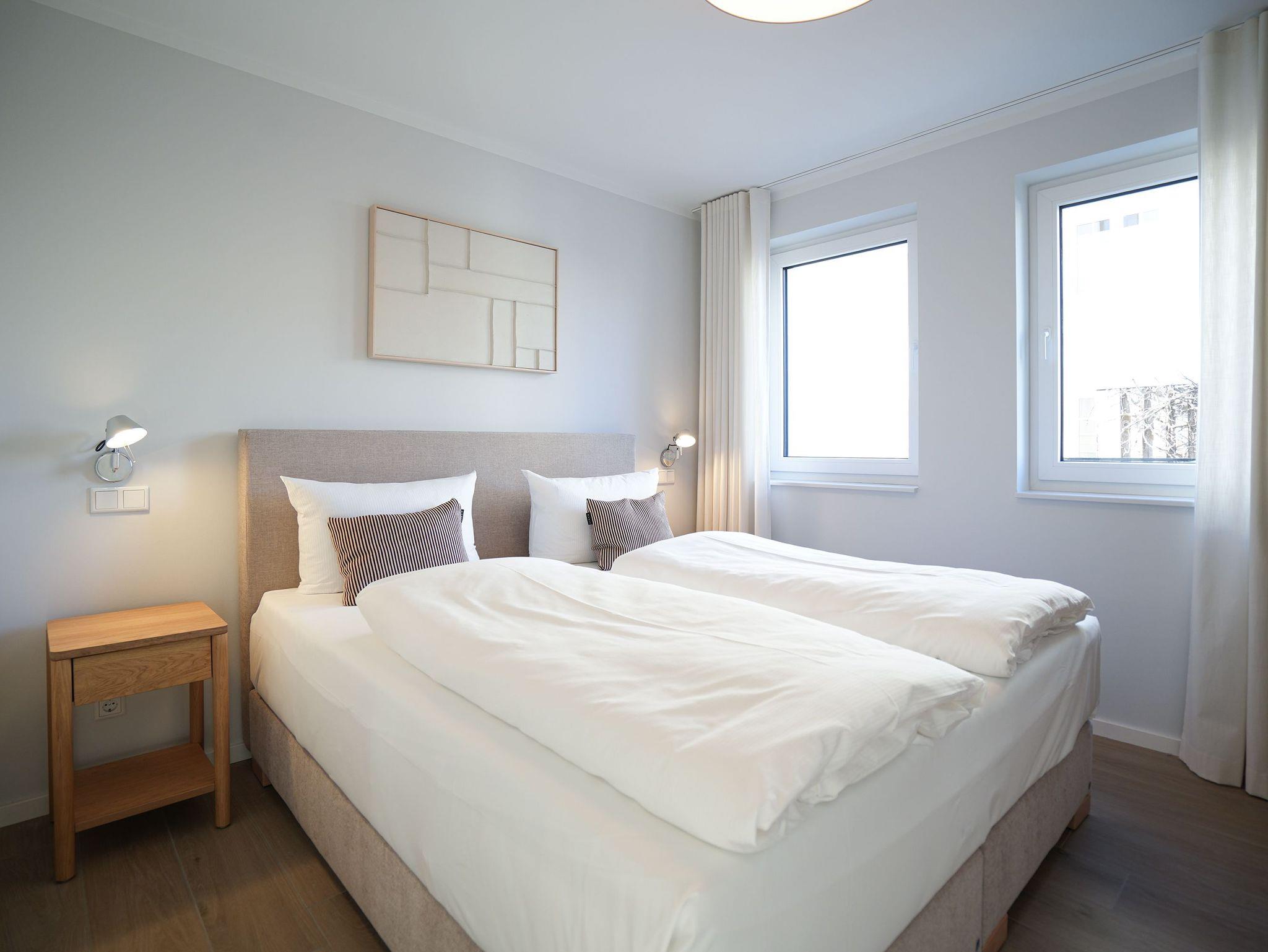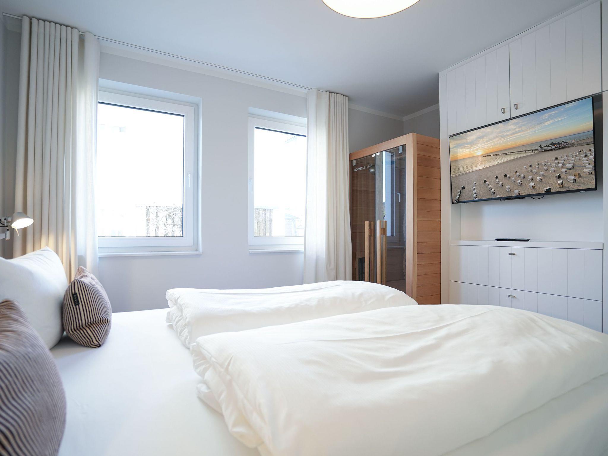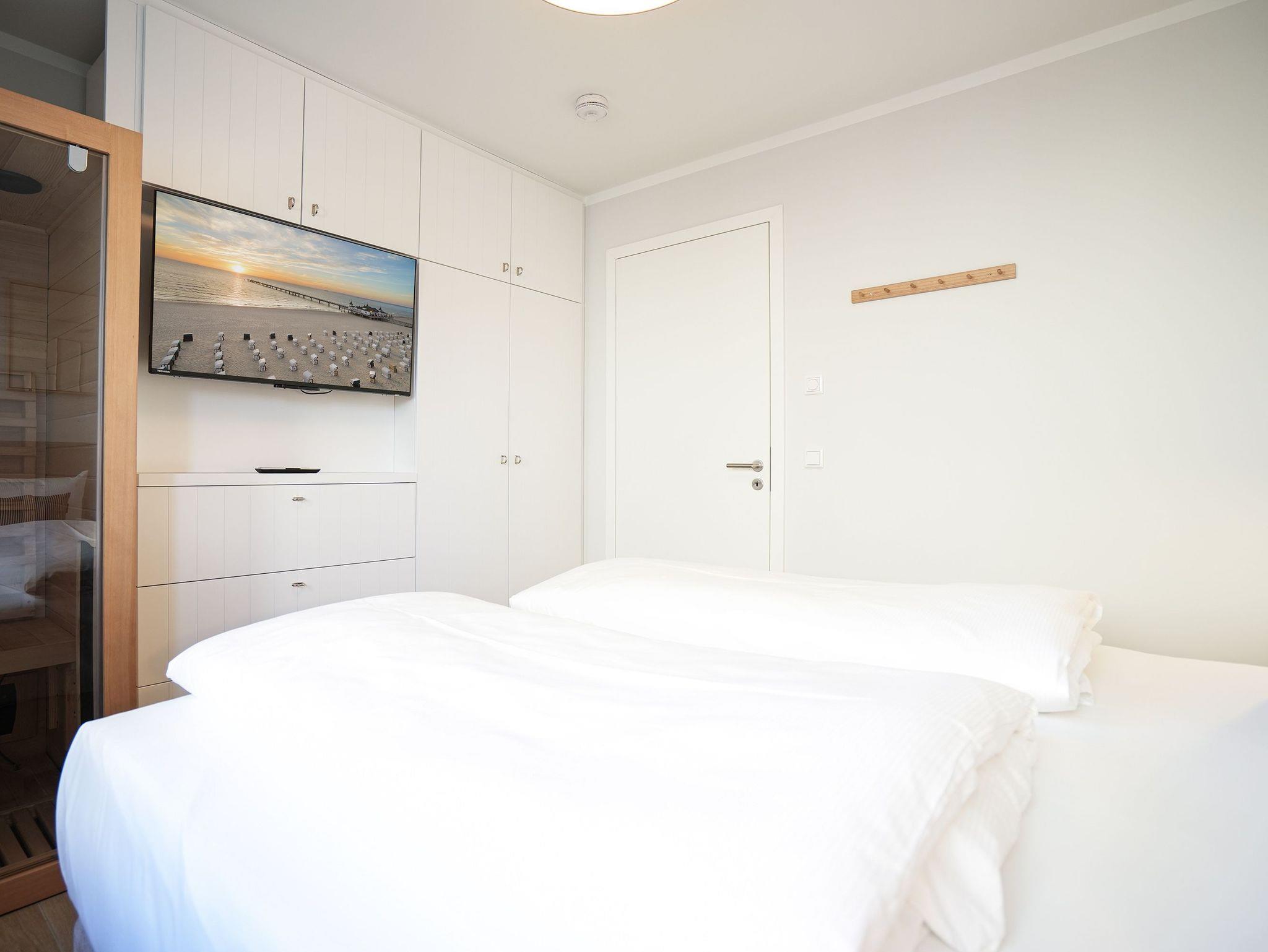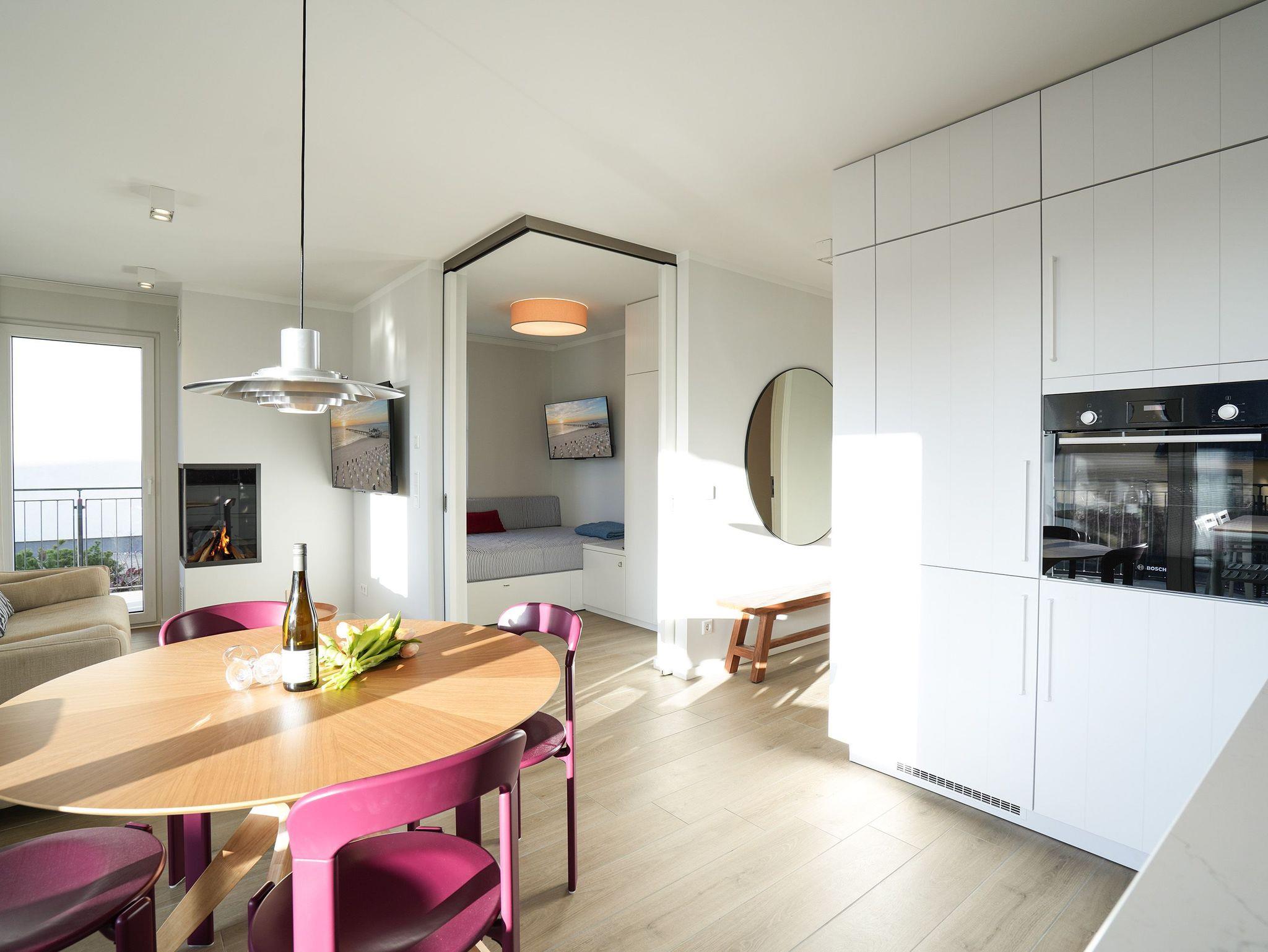 Im Hochparterre der eleganten Villa Kamadori empfängt Sie dieses stilvolle 3-Raum-Appartement mit 54 Quadratmetern Wohnfläche ? perfekt für zwei bis vier Personen sowie ein Kleinkind im Babyreisebett. Der helle, offen gestaltete Wohnbereich mit gemütlicher Sitzgruppe, Gas-Kamin (Fernbedienung) und Flat-TV lädt zu entspannten Stunden ein. Die moderne Küchenzeile ist mit Induktionsherd, Backofen, Spülmaschine, Senseo-Kaffeepadmaschine und Kühlschrank mit Gefrierfach vollständig ausgestattet und wird durch einen integrierten Essplatz harmonisch ergänzt. Von hier aus öffnet sich der Zugang auf den großzügigen Süd-West-Balkon mit etwa 25 Quadratmetern Fläche ? ein herrlicher Ort, um die Sonne bis in die Abendstunden zu genießen oder den Tag bei einem Glas Wein ausklingen zu lassen. Das Hauptschlafzimmer bietet mit einem komfortablen Boxspringbett (180 x 200 cm), Kleiderschrank, Flat-TV und einer privaten Infrarot-Saunakabine den idealen Rückzugsort zum Erholen. Das zweite Schlafzimmer verfügt über ein Doppelbett (140 x 200 cm), Kleiderschrank und Flat-TV; durch Schiebetüren kann es wahlweise offen in den Wohnraum integriert oder abgetrennt werden ? flexibel je nach Bedarf und Stimmung. Das moderne Duschbad mit Waschtisch und WC rundet den gepflegten Gesamteindruck ab. Ein Stellplatz in der Tiefgarage (Durchfahrthöhe 1,85m) steht Ihnen selbstverständlich zur Verfügung.