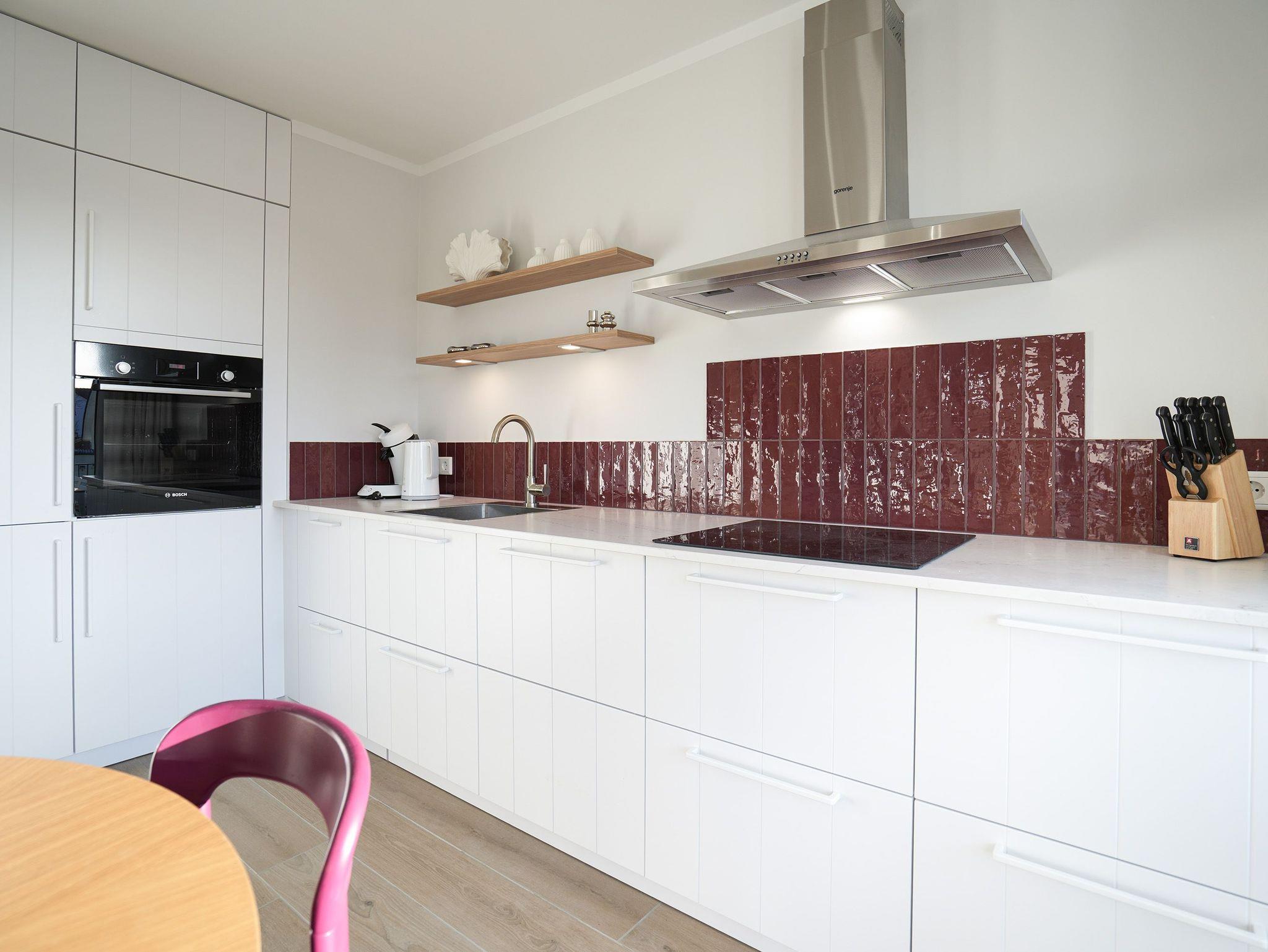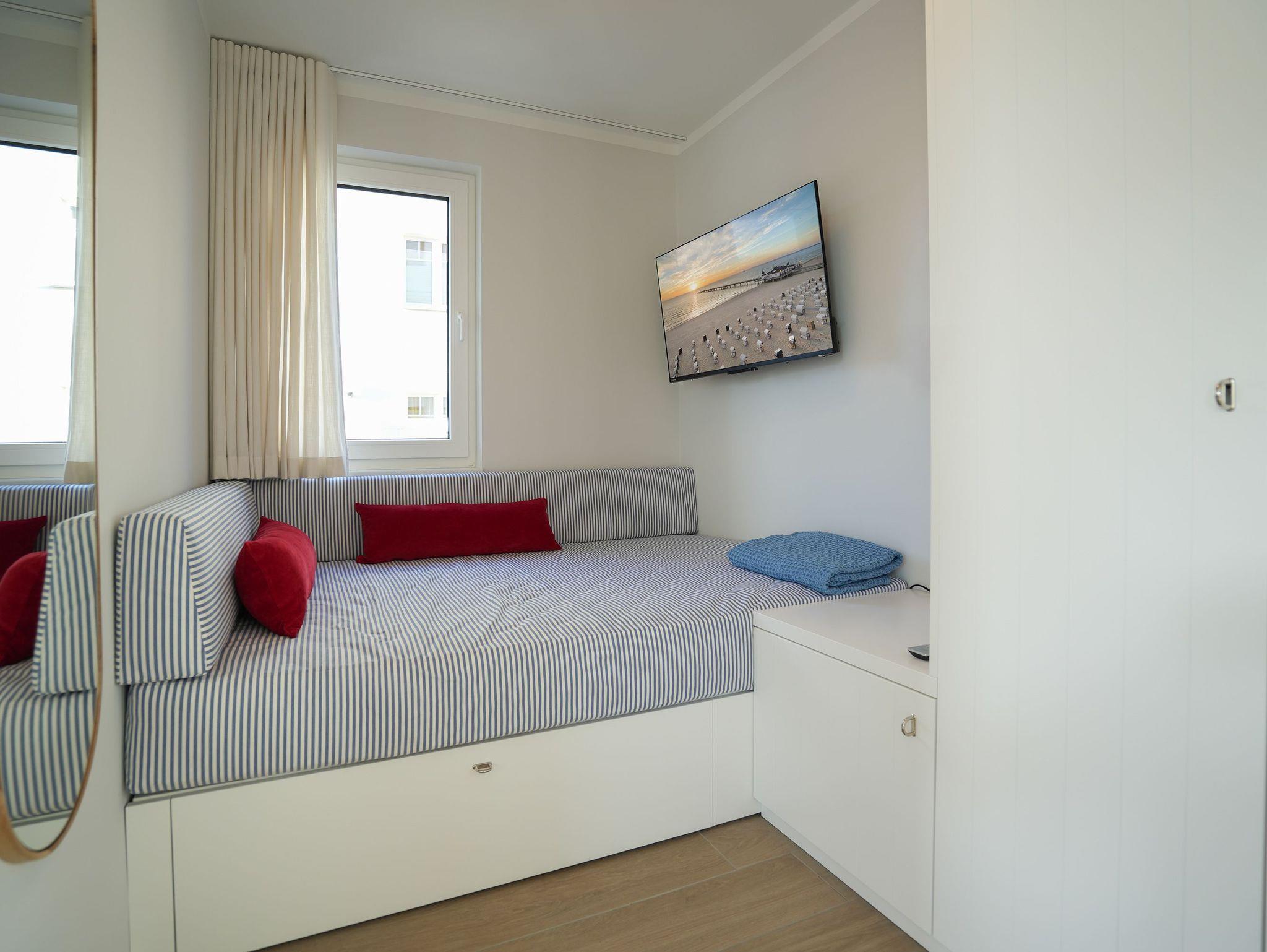 Im Hochparterre der eleganten Villa Kamadori empfängt Sie dieses stilvolle 3-Raum-Appartement mit 54 Quadratmetern Wohnfläche perfekt für zwei bis vier Personen sowie ein Kleinkind im Babyreisebett. Der helle, offen gestaltete Wohnbereich mit gemütlicher Sitzgruppe, Gas-Kamin (Fernbedienung) und Flat-TV lädt zu entspannten Stunden ein. Die moderne Küchenzeile ist mit Induktionsherd, Backofen, Spülmaschine, Senseo-Kaffeepadmaschine und Kühlschrank mit Gefrierfach vollständig ausgestattet und wird durch einen integrierten Essplatz harmonisch ergänzt. Von hier aus öffnet sich der Zugang auf den großzügigen Süd-West-Balkon mit etwa 25 Quadratmetern Fläche ein herrlicher Ort, um die Sonne bis in die Abendstunden zu genießen oder den Tag bei einem Glas Wein ausklingen zu lassen. Das Hauptschlafzimmer bietet mit einem komfortablen Boxspringbett (180 x 200 cm), Kleiderschrank, Flat-TV und einer privaten Infrarot-Saunakabine den idealen Rückzugsort zum Erholen. Das zweite Schlafzimmer verfügt über ein Doppelbett (140 x 200 cm), Kleiderschrank und Flat-TV; durch Schiebetüren kann es wahlweise offen in den Wohnraum integriert oder abgetrennt werden flexibel je nach Bedarf und Stimmung. Das moderne Duschbad mit Waschtisch und WC rundet den gepflegten Gesamteindruck ab. Ein Stellplatz in der Tiefgarage (Durchfahrthöhe 1,85m) steht Ihnen selbstverständlich zur Verfügung.