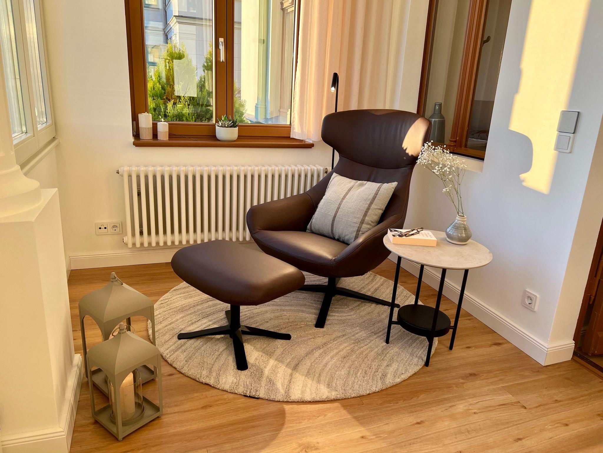 • Loggia & Garten: Die verglaste Loggia bietet einen schönen Blick in den Garten und zur Ostsee. Der Essbereich und ein Relaxsessel laden zum Verweilen ein. Bei Sonnenschein können Sie draußen auf den Gartenmöbeln die frische Seeluft genießen.
