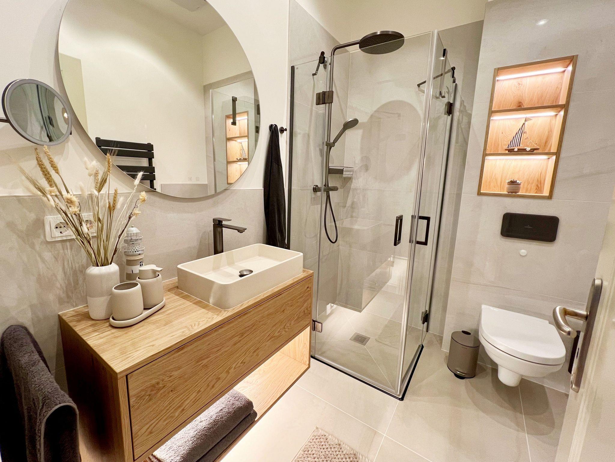 • Bad: Modernes Badezimmer mit stilvollem Design und warmer Wohlfühlatmosphäre. Highlight ist die großzügige, bodentiefe Regendusche mit hochwertigen Armaturen. Der elegante Echtholz-Waschtisch sowie die indirekte Beleuchtung in den Holznischen und am Unterschrank schaffen ? zusammen mit dem großen Rundspiegel ? ein exklusives, maritimes Ambiente.