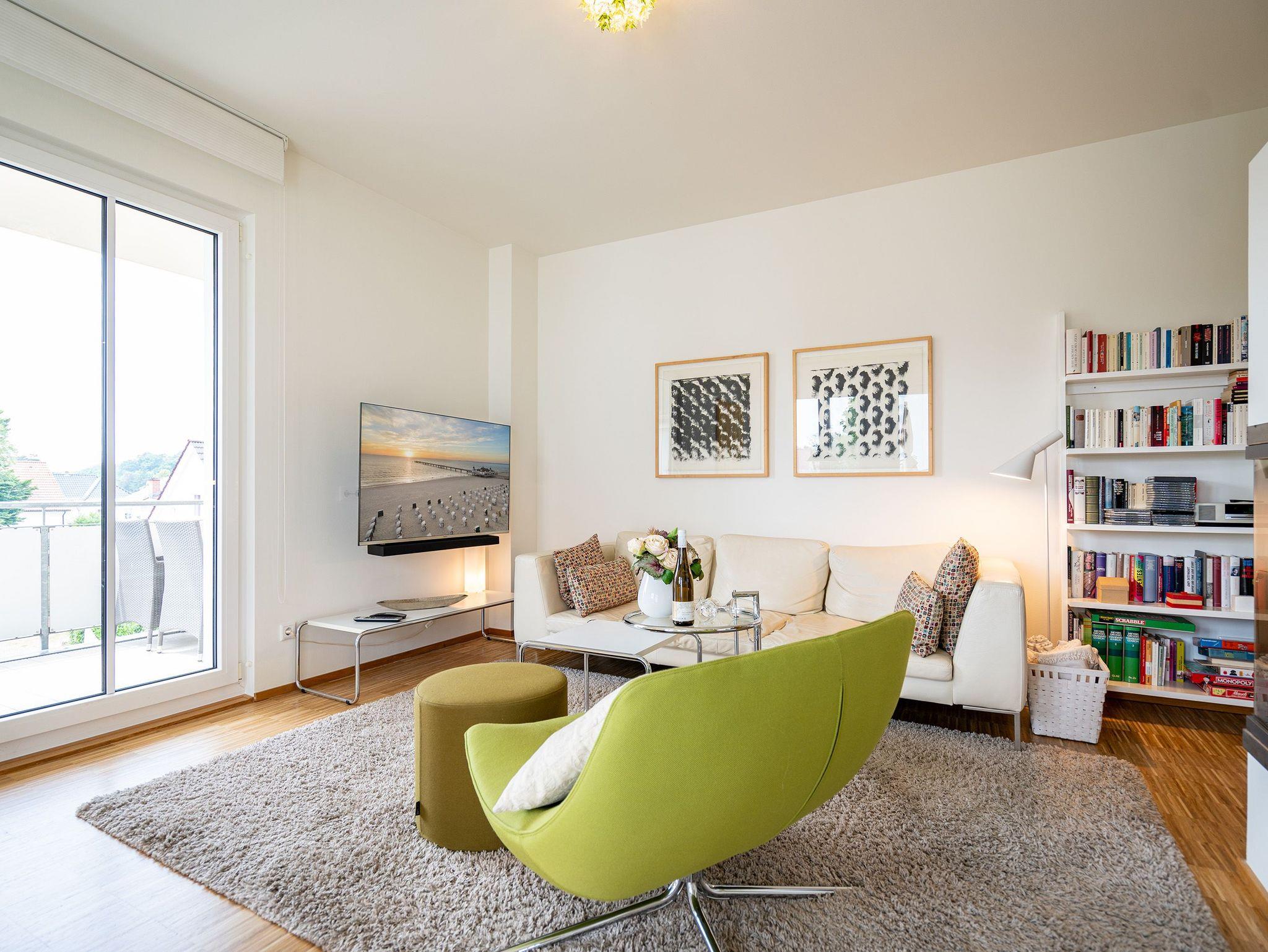 Design at its best: Im Südhaus des Dünenpalais erwartet Sie eine stylische 3-Raum-Ferienwohnung für bis zu 4 Personen (und 1 Kleinkind bis 3 Jahre im Kinderreisebett.) Parkettböden in den Wohnräumen, deckenhohe Einbauten und Türen, Designermöbel, Originalkunst und ein durchdachtes Lichtkonzept machen dieses Domizil zu etwas Besonderem. Schon beim Eintreten begrüßt Sie der farblich gestaltete Eingangsbereich mit großem Spiegel und moderner Bank. Der lichtdurchflutete offene Wohnbereich mit bequemer Ledercouch, großem Esstisch und einer angrenzenden, wohnlich gestalteten Küche mit viel Arbeitsfläche ist wunderschön. An kühlen Abenden und in der kalten Jahreszeit sorgt der mit Fernbedienung zu nutzende Gaskamin für wohlige Wärme. In allen Zimmern hängen Flat-TV und Sie können das WLAN kostenfrei nutzen. Die beiden gemütlichen Schlafzimmer haben Boxspring-Doppelbetten, geräumige Einbauschränke und Verdunkelungsvorhänge. Das komfortable Bad hat eine bodengleiche große Glasdusche mit Schwall- und Handbrause und viel Ablagefläche. Von allen Zimmern aus haben Sie Zugang zu den Balkonen. Wer keine Lust auf Strand hat, macht es sich auf dem großen, sonnigen Südwestbalkon gemütlich. Zum Frühstück in der Morgensonne lädt der zweite geräumige Balkon ein. Für Ihren Komfort sind die Betten bei der Anreise bezogen und Handtücher liegen bereit. (Auf Wunsch stellen wir Ihnen ein Kinderreisebett, ohne Matratze, ohne Bettzeug, und einen Kinderhochstuhl gegen Aufpreis zur Verfügung.) Für das Auto gibt es einen Stellplatz in der Tiefgarage mit direktem Zugang zum Aufzug.