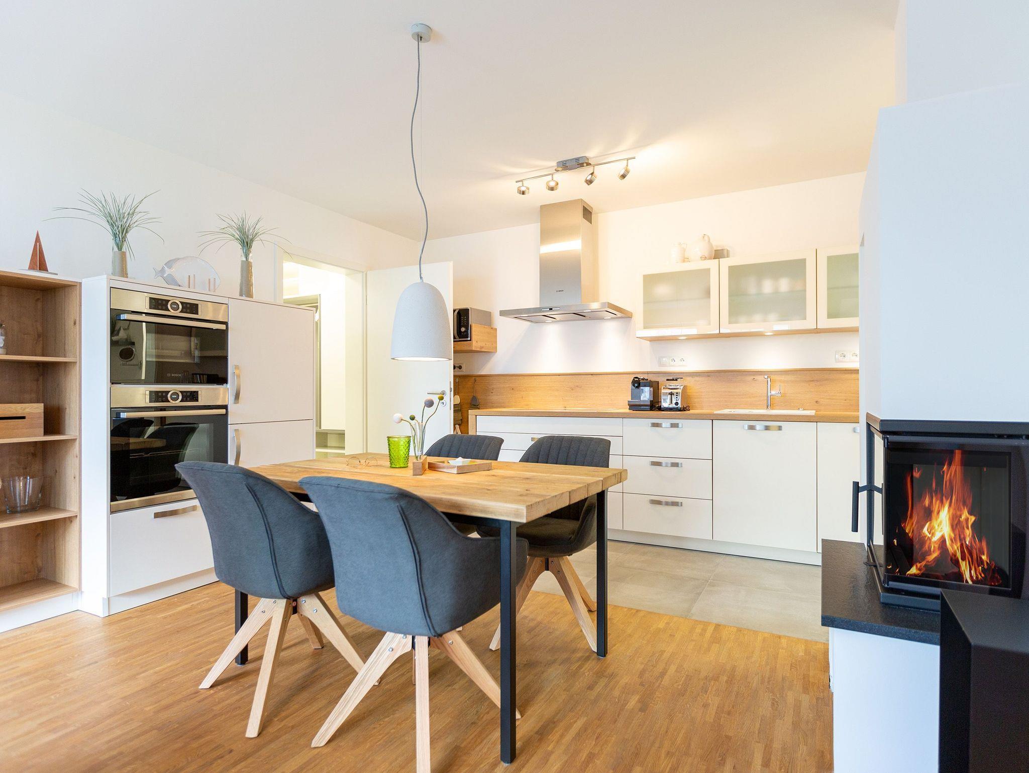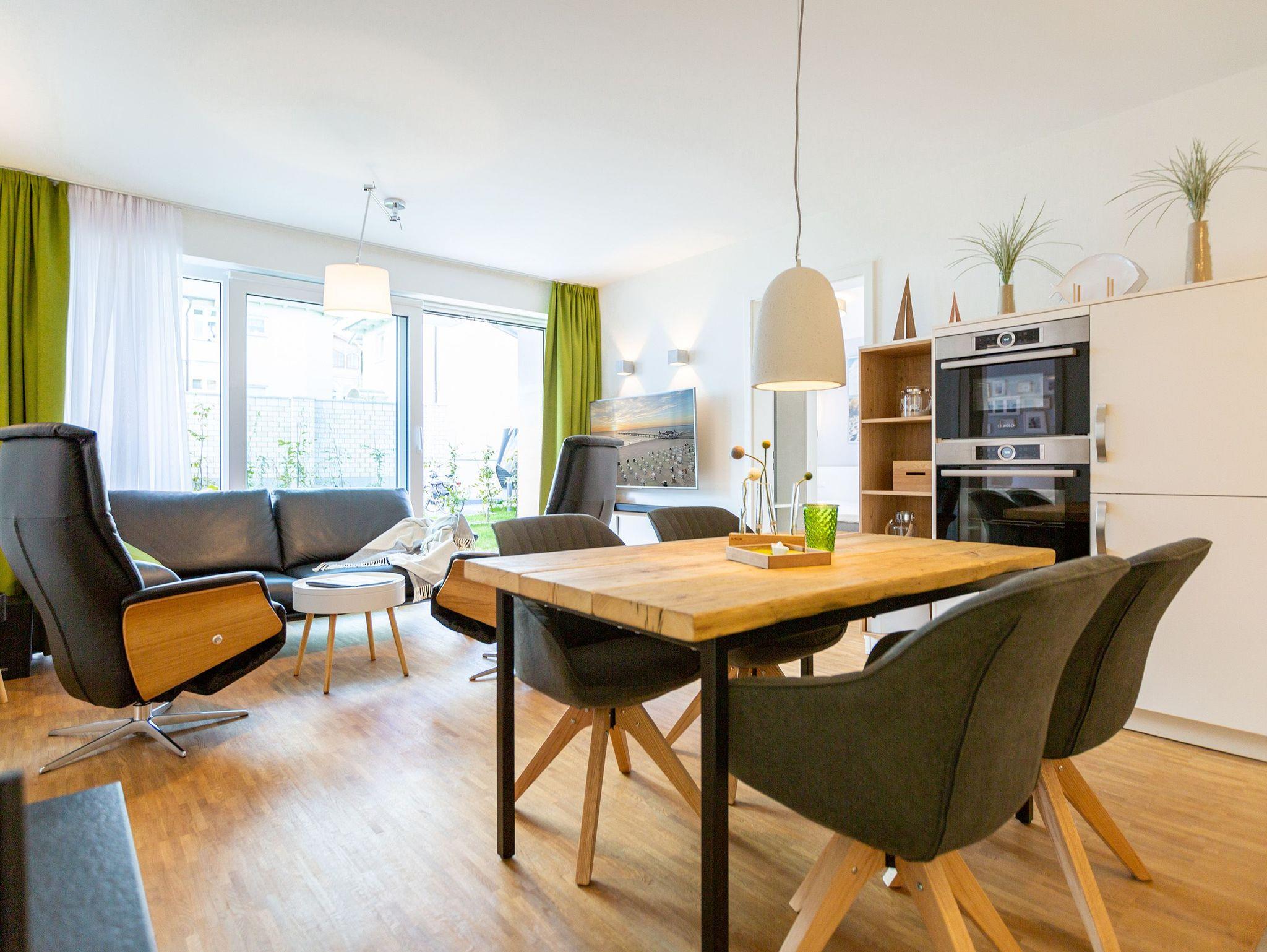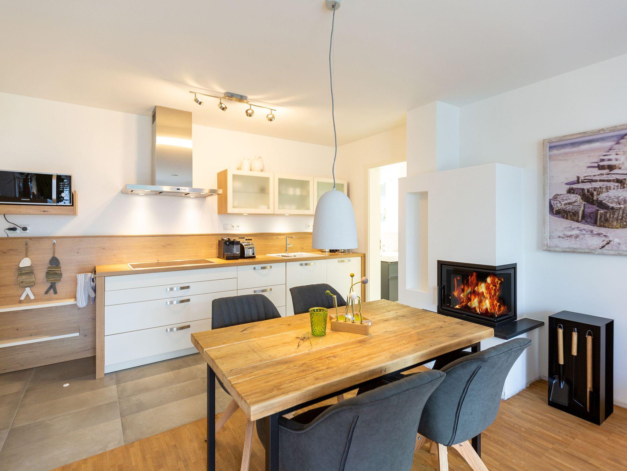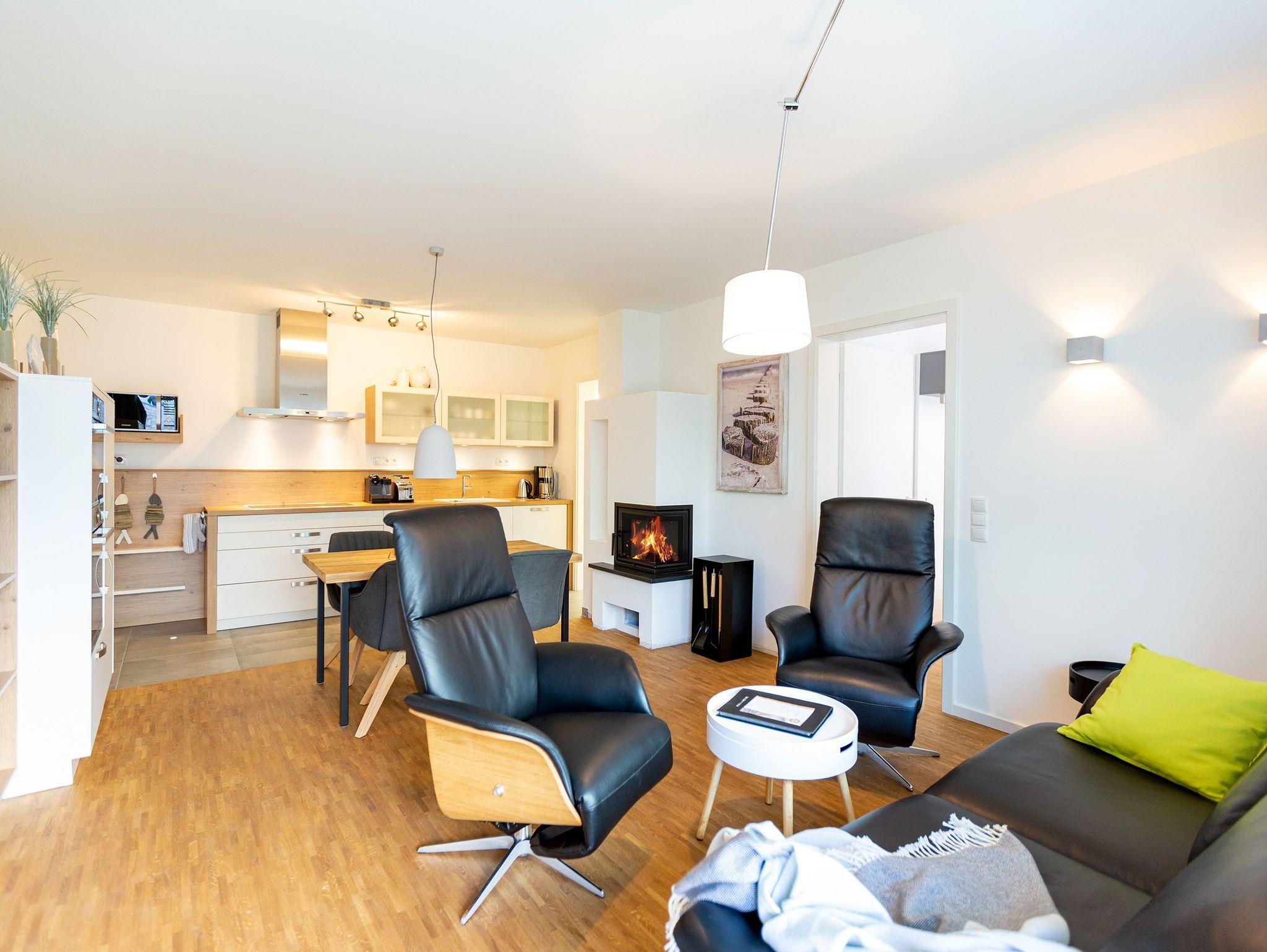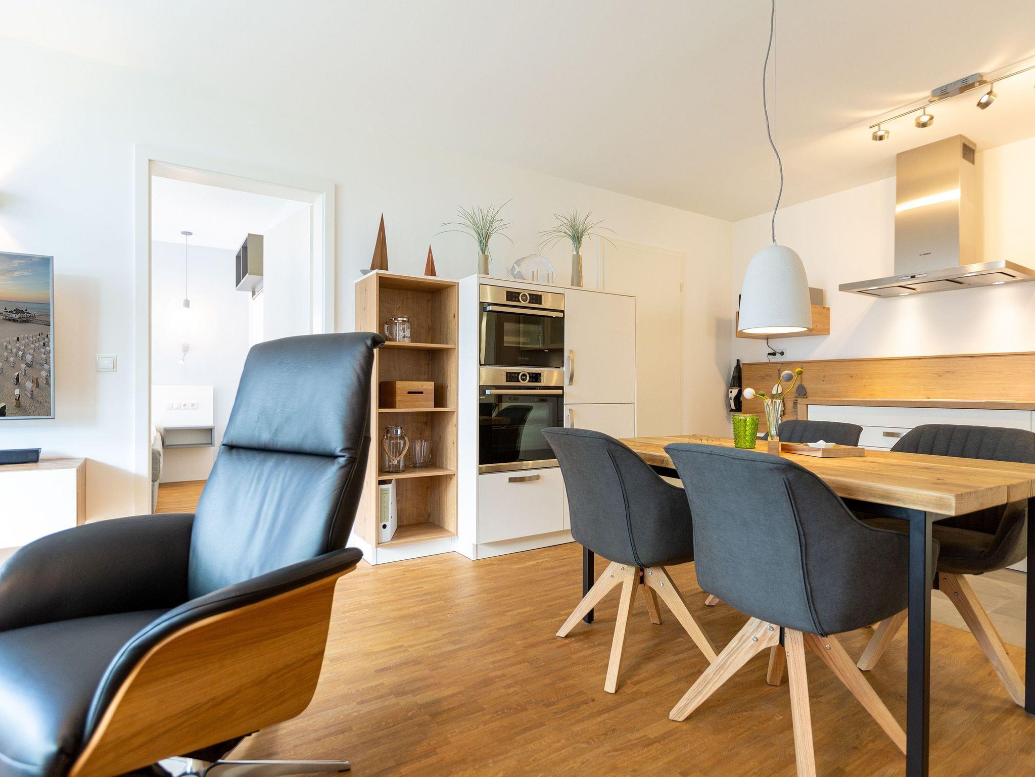 Der Abend senkt sich auf die Insel. Es wird langsam dunkel. In Ihrem Urlaubsdomizil aber wird es kuschelig. Denn im Kamin flackert ein knisterndes Feuer. In diesem Drei-Zimmer-Appartement im Erdgeschoss vom Quartier 7 können es sich bis zu vier Personen gemütlich machen, ausspannen und eine unvergesslich schöne Ostseeauszeit miteinander verbringen. Denn das Rauschen der Wellen ist nur ein paar Gehminuten entfernt. Auf den 68 Quadratmetern finden Sie reichlich Platz, um Zeit für sich und Zeit gemeinsam zu verbringen. Das großzügige, moderne Wohnzimmer mit echtem Holzkamin, Flat-TV und einer gemütlichen Sofalandschaft lädt zum Entspannen und Verweilen ein. Ob Ledersofa oder stylishe Design-Ledersessel ? der Inneneinrichter hatte ein feines Gespür für das gewisse Urlaubsgefühl. Die zum Wohnzimmer hin offene Küche ist voll ausgestattet. Hochwertige Markengeräte wie Herd, Cerankochfeld, Mikrowelle, Geschirrspüler oder Kaffeemaschine gehören ebenso zur Ausstattung wie erlesenes Geschirr. Ein schöner Essplatz lädt zum Verweilen und Genießen ein. Bei schönem Wetter können Sie das Essen aber auch draußen auf der Süd-West-Terrasse (13 Quadratmeter) zu sich nehmen. Sonnenüberflutet eignet sie sich auch bestens zum Sonnenbaden. Das Appartement besitzt zwei Schlafzimmer mit je einem bequemen Boxspringdoppelbett (1,80 m x 2,00 m), einem extra dafür angefertigten Einbauschrank und einem Flat-TV. Kuscheln und träumen werden hier zu Ihren Lieblingsbeschäftigungen. Die Betten sind bei Anreise bezogen. Ebenfalls in doppelter Ausführung ist das Bad mit Dusche, WC und Waschtisch vorhanden. Handtücher liegen bereit. Eines der beiden Bäder können Sie als kleine Wellness-Oase nutzen. Denn es verfügt über eine eigene finnische Sauna. Zur Ferienwohnung gehört in der Tiefagarage ein Pkw-Stellplatz. Das WLAN können Sie kostenfrei nutzen.