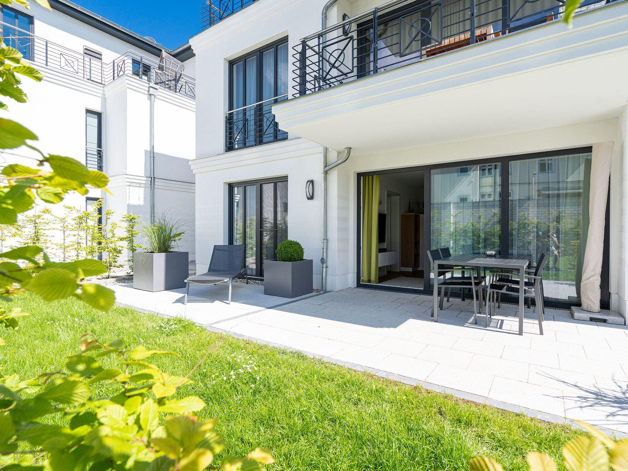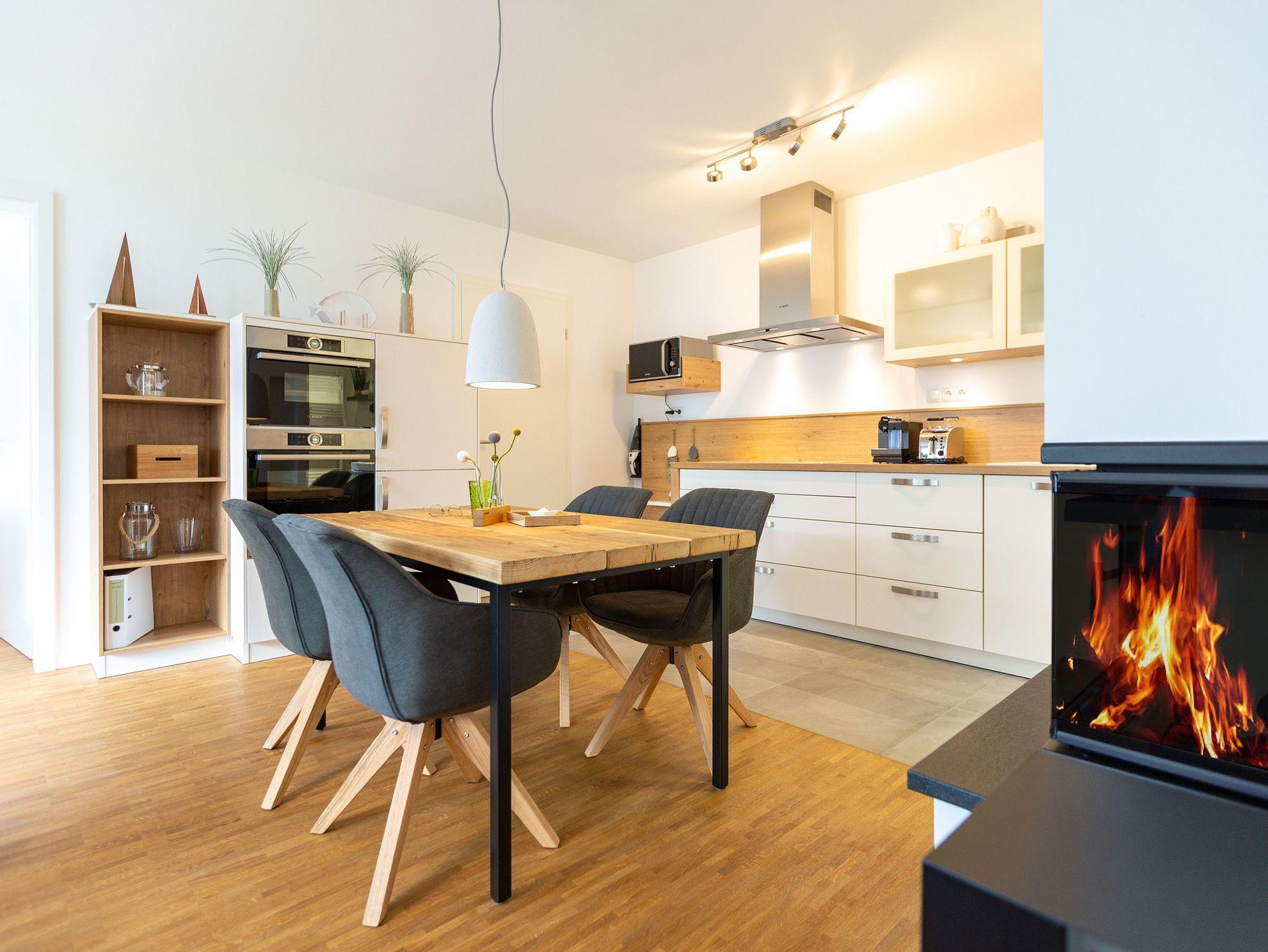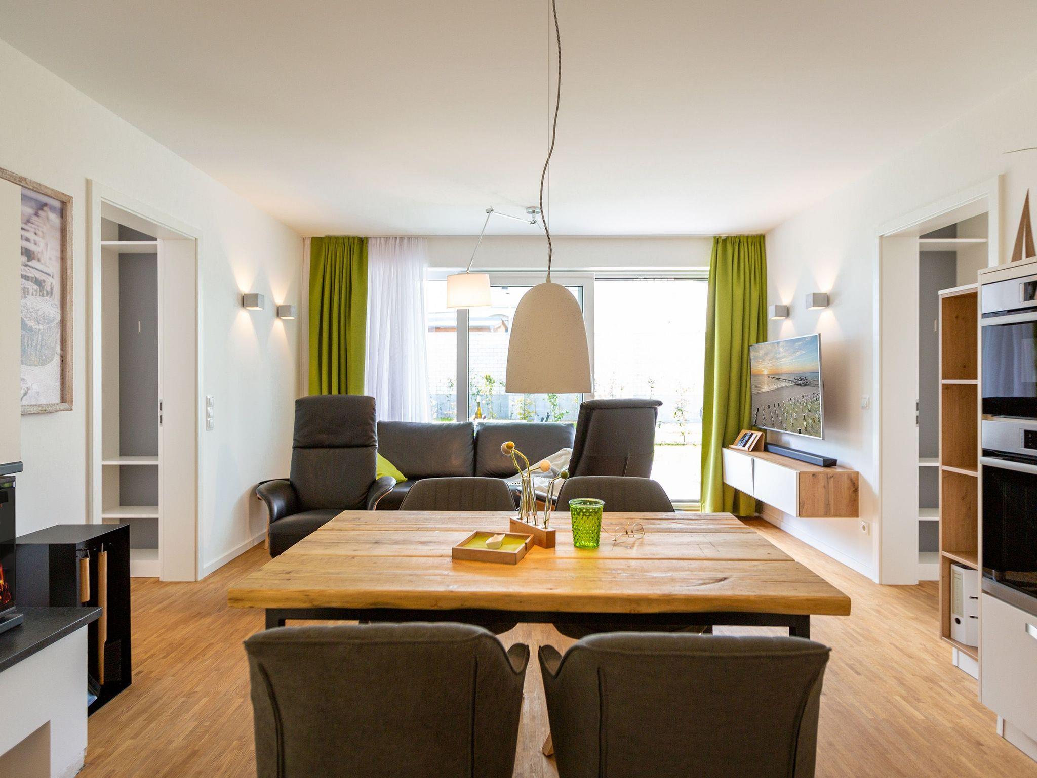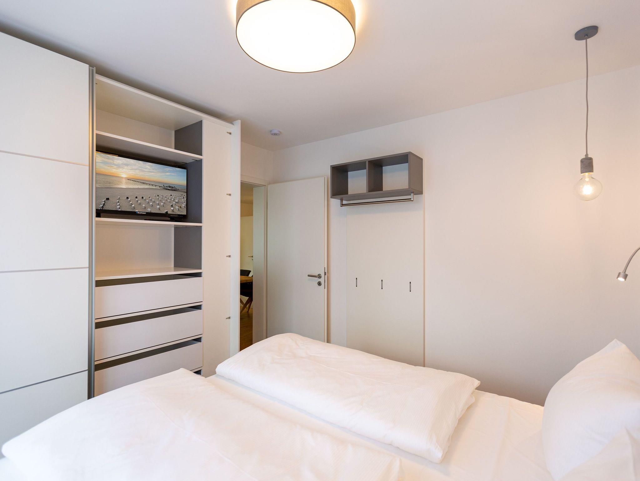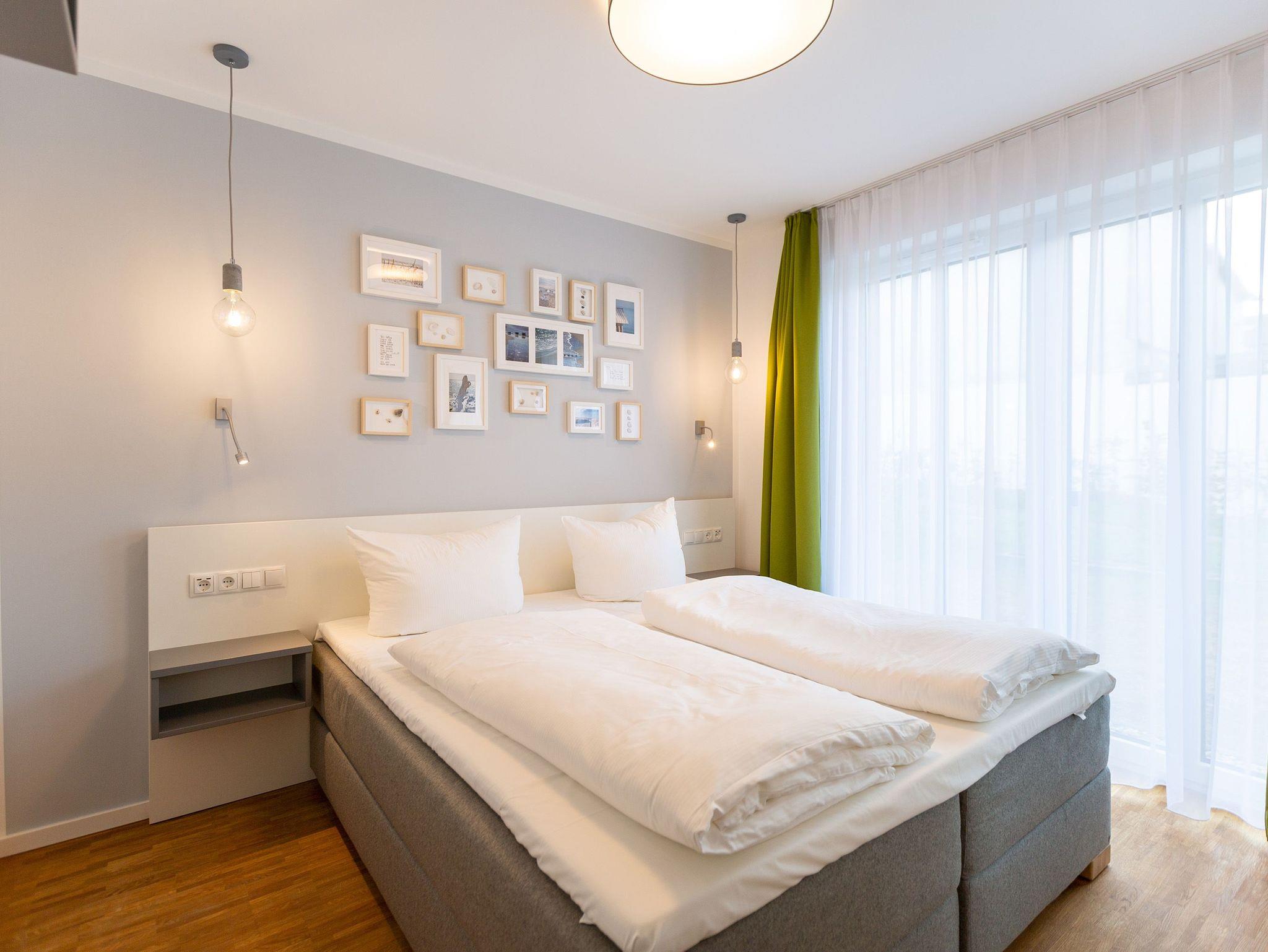 Der Abend senkt sich auf die Insel. Es wird langsam dunkel. In Ihrem Urlaubsdomizil aber wird es kuschelig. Denn im Kamin flackert ein knisterndes Feuer. In diesem Drei-Zimmer-Appartement im Erdgeschoss vom Quartier 7 können es sich bis zu vier Personen gemütlich machen, ausspannen und eine unvergesslich schöne Ostseeauszeit miteinander verbringen. Denn das Rauschen der Wellen ist nur ein paar Gehminuten entfernt. Auf den 68 Quadratmetern finden Sie reichlich Platz, um Zeit für sich und Zeit gemeinsam zu verbringen. Das großzügige, moderne Wohnzimmer mit echtem Holzkamin, Flat-TV und einer gemütlichen Sofalandschaft lädt zum Entspannen und Verweilen ein. Ob Ledersofa oder stylishe Design-Ledersessel ? der Inneneinrichter hatte ein feines Gespür für das gewisse Urlaubsgefühl. Die zum Wohnzimmer hin offene Küche ist voll ausgestattet. Hochwertige Markengeräte wie Herd, Cerankochfeld, Mikrowelle, Geschirrspüler oder Kaffeemaschine gehören ebenso zur Ausstattung wie erlesenes Geschirr. Ein schöner Essplatz lädt zum Verweilen und Genießen ein. Bei schönem Wetter können Sie das Essen aber auch draußen auf der Süd-West-Terrasse (13 Quadratmeter) zu sich nehmen. Sonnenüberflutet eignet sie sich auch bestens zum Sonnenbaden. Das Appartement besitzt zwei Schlafzimmer mit je einem bequemen Boxspringdoppelbett (1,80 m x 2,00 m), einem extra dafür angefertigten Einbauschrank und einem Flat-TV. Kuscheln und träumen werden hier zu Ihren Lieblingsbeschäftigungen. Die Betten sind bei Anreise bezogen. Ebenfalls in doppelter Ausführung ist das Bad mit Dusche, WC und Waschtisch vorhanden. Handtücher liegen bereit. Eines der beiden Bäder können Sie als kleine Wellness-Oase nutzen. Denn es verfügt über eine eigene finnische Sauna. Zur Ferienwohnung gehört in der Tiefagarage ein Pkw-Stellplatz. Das WLAN können Sie kostenfrei nutzen.