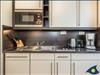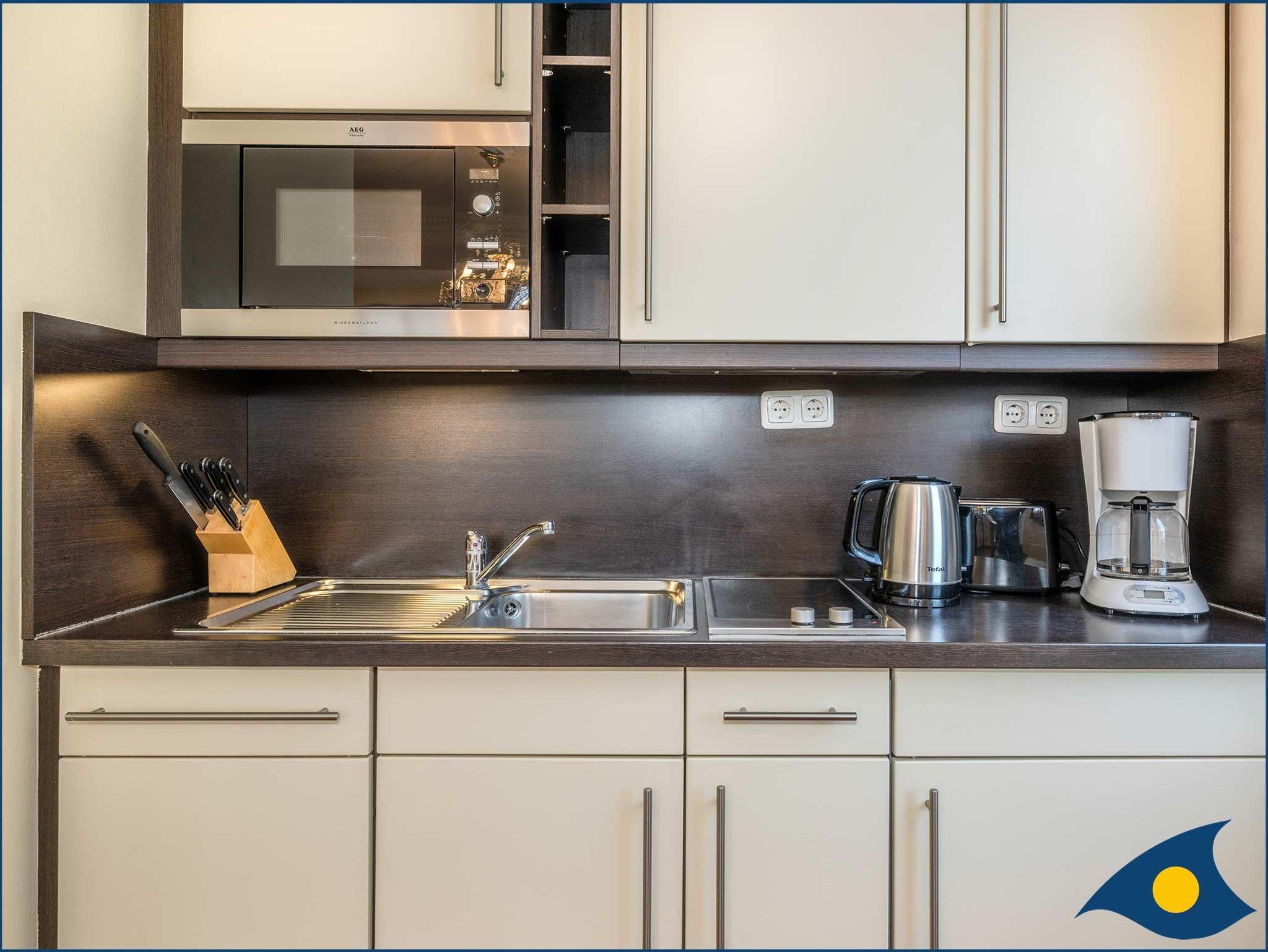 Die helle Wohnung verfügt über einen großzügigen Wohn-/Essbereich mit Zugang zur Terrasse, auf der Sie gemütlich dem bunten Treiben auf der Promenade zuschauen können. Die Aufbettung der 3. Person findet auf der Schlafcouch Platz. Die offene Küche ist mit einer Spülmaschine, einer Mikrowelle, einem 2 Platten-Ceranfeld und Kühlschrank ausgestattet.