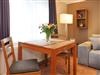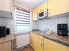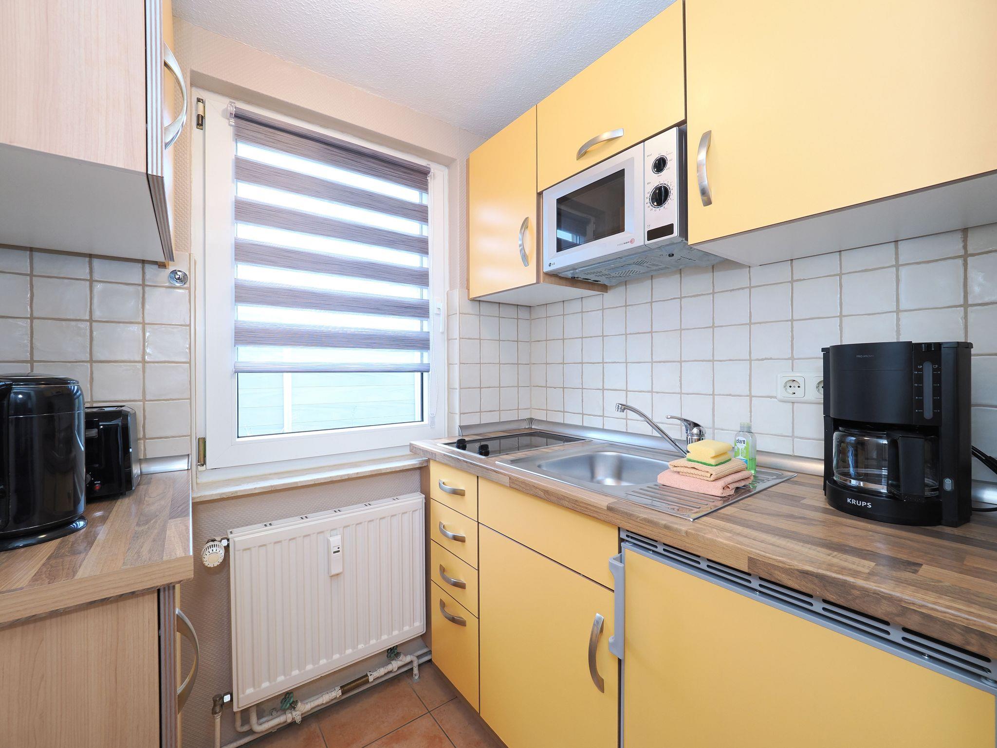 Die kleine separierte Küche ist mit einem 2-Zonen-Cerankochfeld ,einem Kühlschrank und einer Mikrowelle ausgestattet. Eine Kaffeemaschine, Toaster und Wasserkocher gehören ebenfalls zum Repertoire.