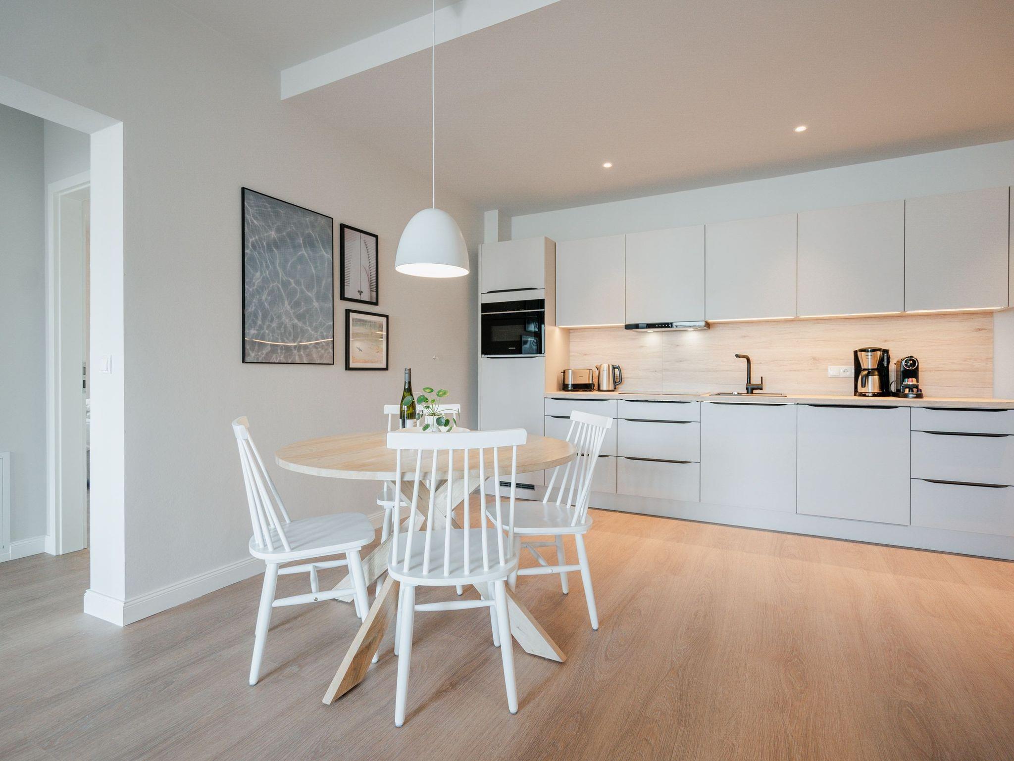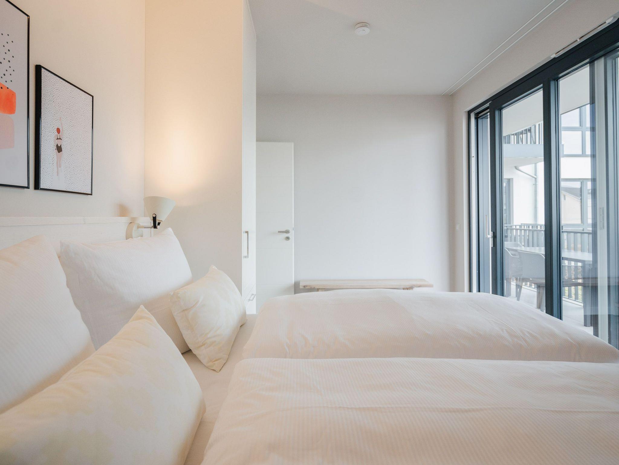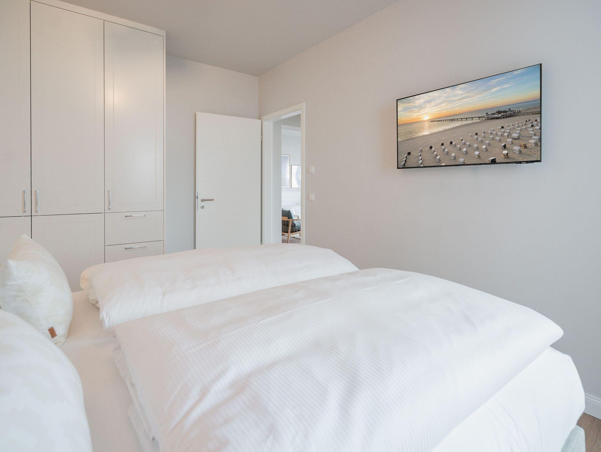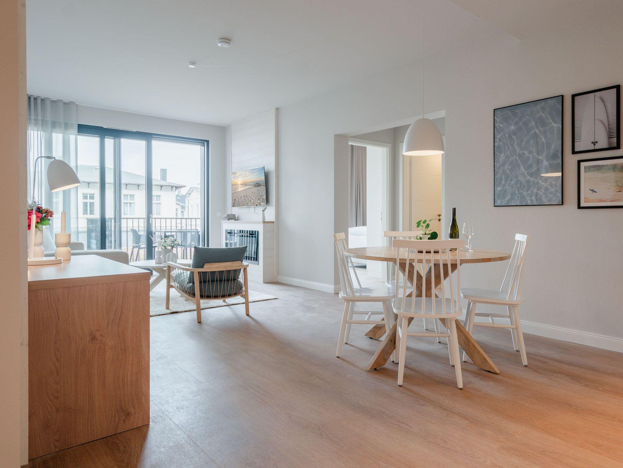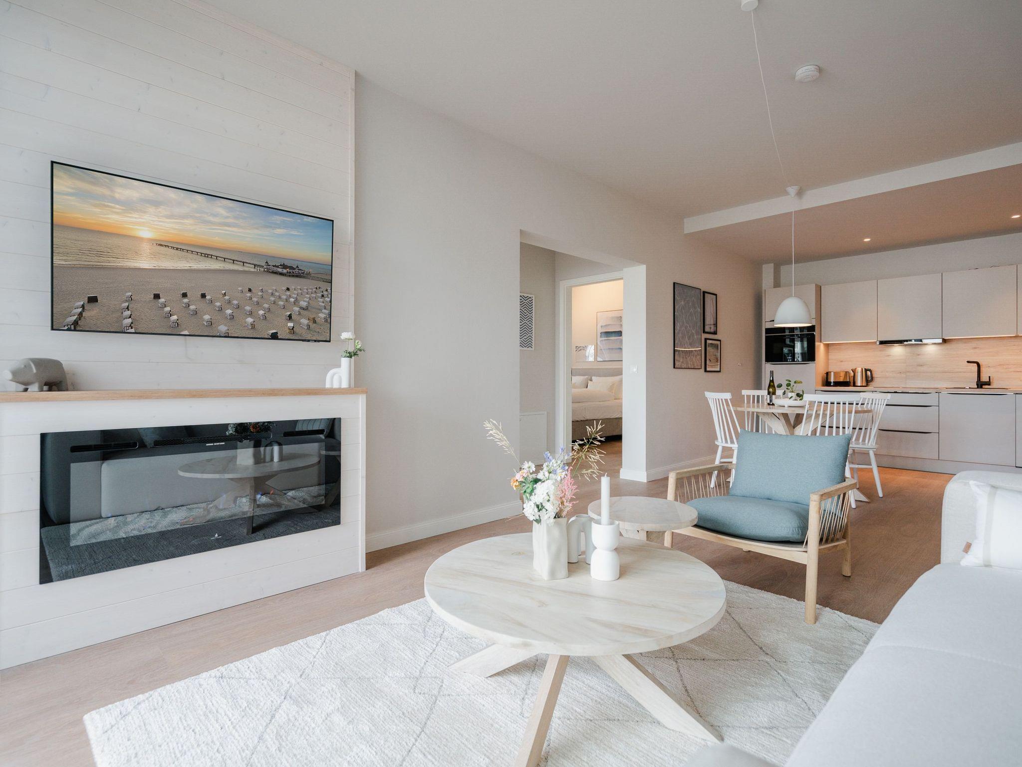 Willkommen im Appartement B1.1 (Haus B) ? Ihrem komfortablen Urlaubsparadies in der 1. Etage der Strandterrasse. Auf 82 Quadratmetern erwartet die bis zu 4 Gäste eine offene und modern eingerichtete 3-Raum-Wohnung, in der sie sich rundum wohl und gut aufgehoben fühlen. Denn Ihr Wohlgefühl steht in diesem liebevoll eingerichteten Appartement an erster Stelle. Ein großer, heller Wohnbereich mit einer vollausgestatteten Küche und einem unglaublich bequemen Entspannungsbereich empfängt Sie schon beim Eintreten. Stylische Möbel in nordischem Design sorgen für eine stilvolle Atmosphäre. Die Küchenzeile bietet mit einem Backofen, einem 4-Platten-Induktionsherd und einer Nespresso-Kapselmaschine alle Annehmlichkeiten für ein modernes Kochvergnügen. Genießen Sie anschließend die selbst gezauberten Gerichte am schönen Esstisch gemeinsam. Teil des Wohnbereiches ist eine gemütliche Sofa-Sitzgruppe, auf der man beim Blick in das Flackern des Elektrokamins (ohne Wärmeabgabe) oder beim Schauen eines Blockbusters auf dem 50 Zoll Flat-TV Raum und Zeit vergessen kann. Und auf jeden Fall die Alltagssorgen auch. Vom Wohnzimmer aus können Sie hinaus auf den Balkon mit Westausrichtung treten. Bestaunen Sie von hier aus die fantastischen Farben, die die Sonne bei ihrem Untergang an den Himmel malt. Genießen Sie die Nachmittagssonne am Gartentisch. Essen unter freiem Himmel und bei frischer Ostseeluft macht doppelt hungrig. Das Appartement verfügt über zwei Schlafzimmer: Beide laden mit komfortablen Boxspringdoppelbetten (1,80m x 2,00m) zu erholsamen Träumen ein. Jeweils ein Kleiderschrank sowie ein weiterer Flat-TV (43 Zoll) gehören zur Ausstattung dazu. Eines der beiden Schlafzimmer hat ebenfalls Zugang zum Balkon. Da muss wohl das Los entscheiden, wer morgens schon an die frische Luft darf. In der Wohnung gibt es zwei moderne Duschbäder mit Waschtisch und WC, eines davon mit einer entspannenden Infrarotsaunakabine. Ein PKW-Stellplatz in der Tiefgarage sorgt für bequemes Parken. Genießen Sie Ihren Aufenthalt in dieser stilvollen Ferienwohnung mit hochwertiger Ausstattung und perfekter Lage für einen erholsamen Urlaub am Meer.