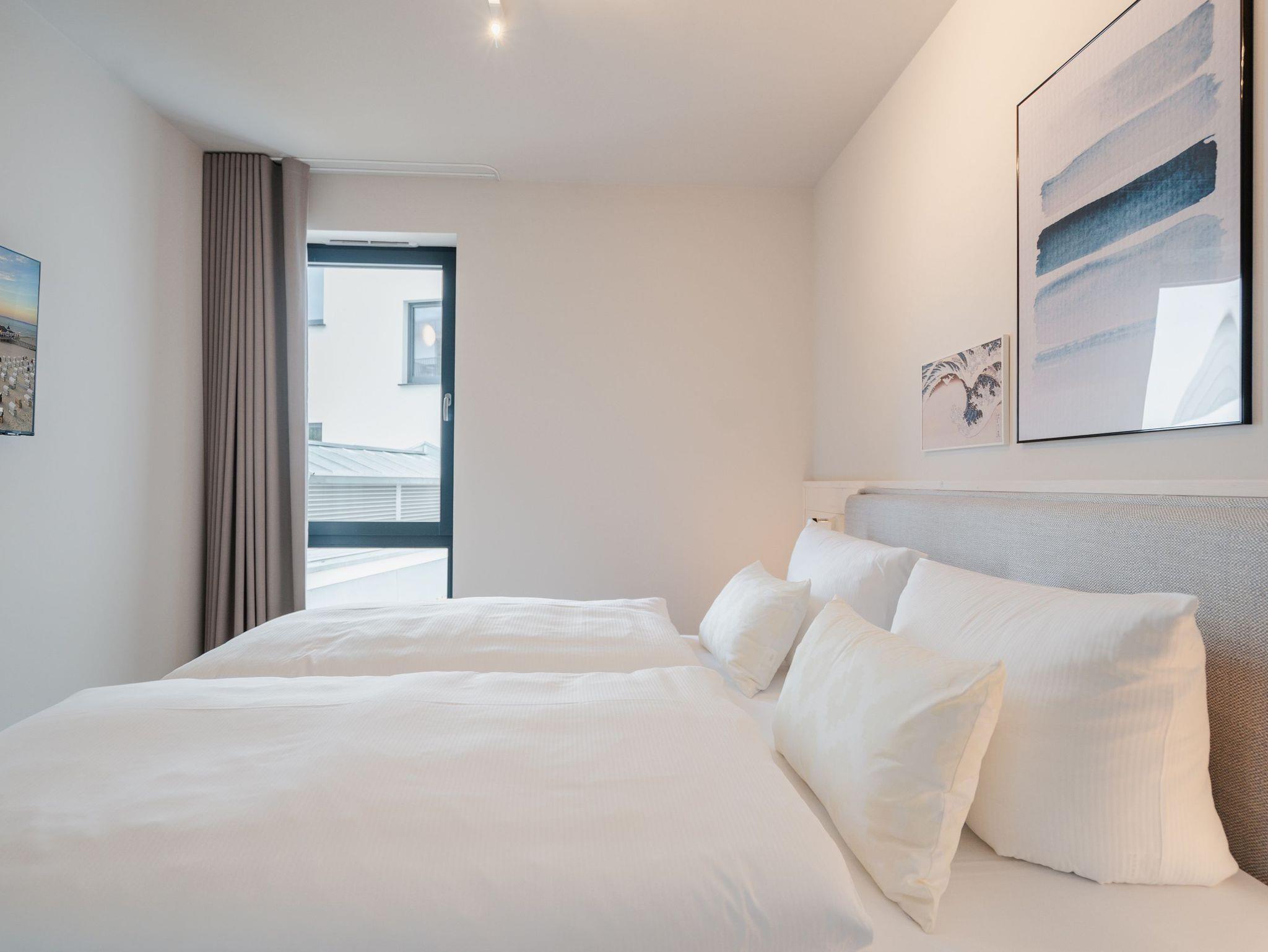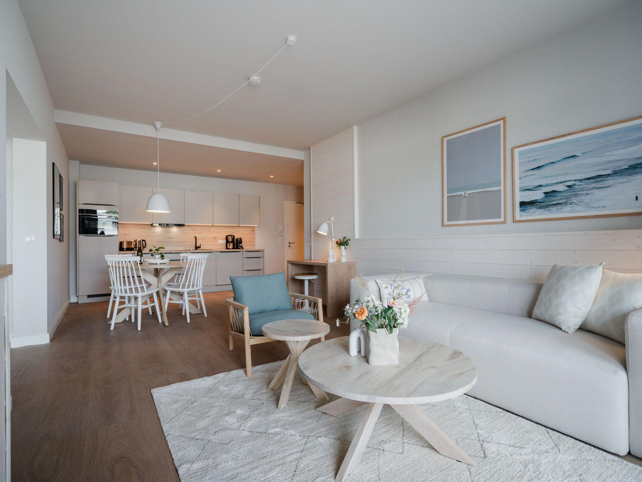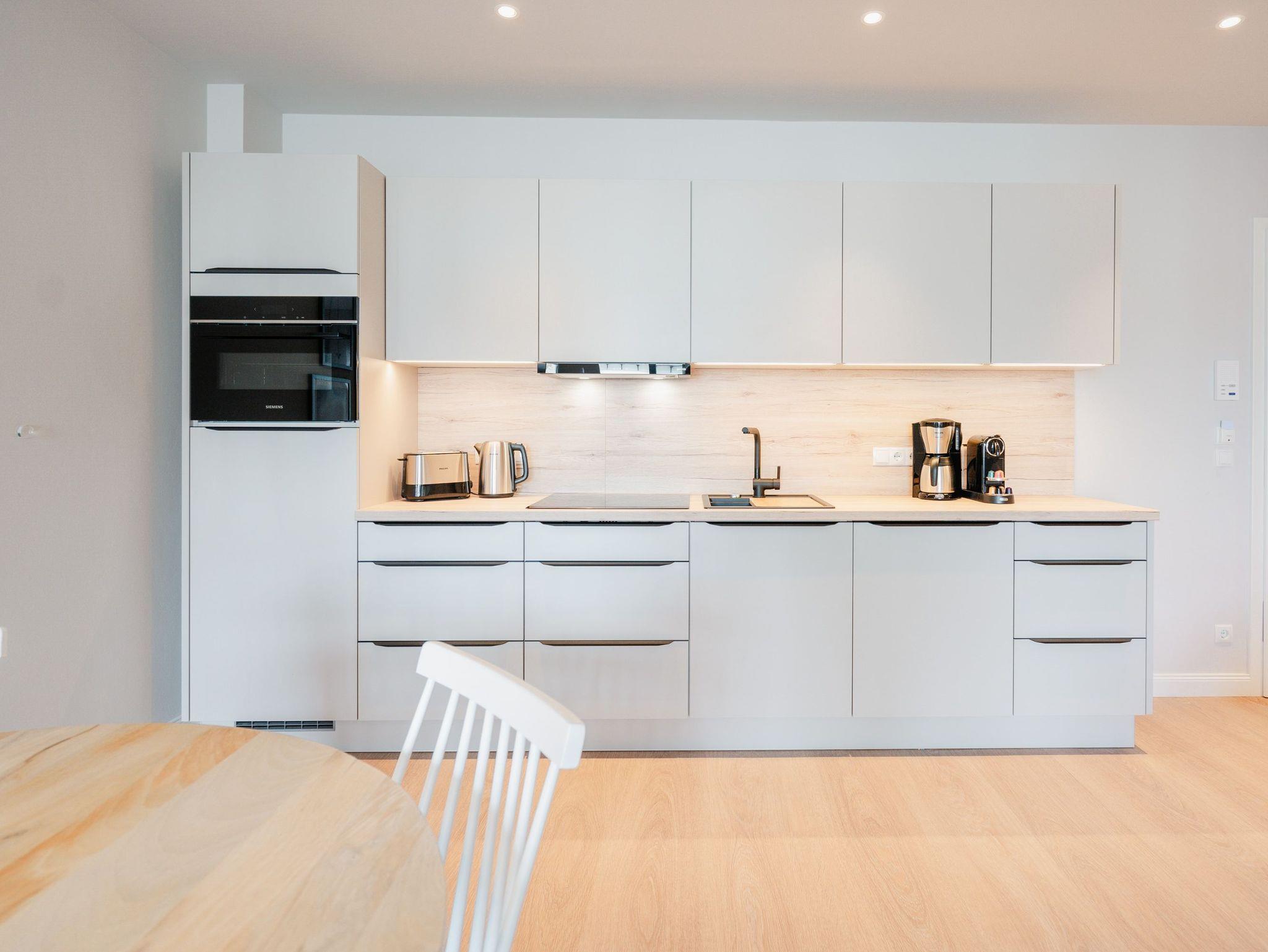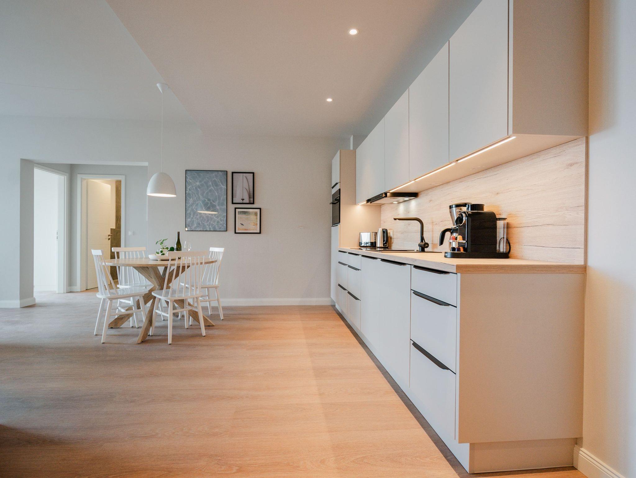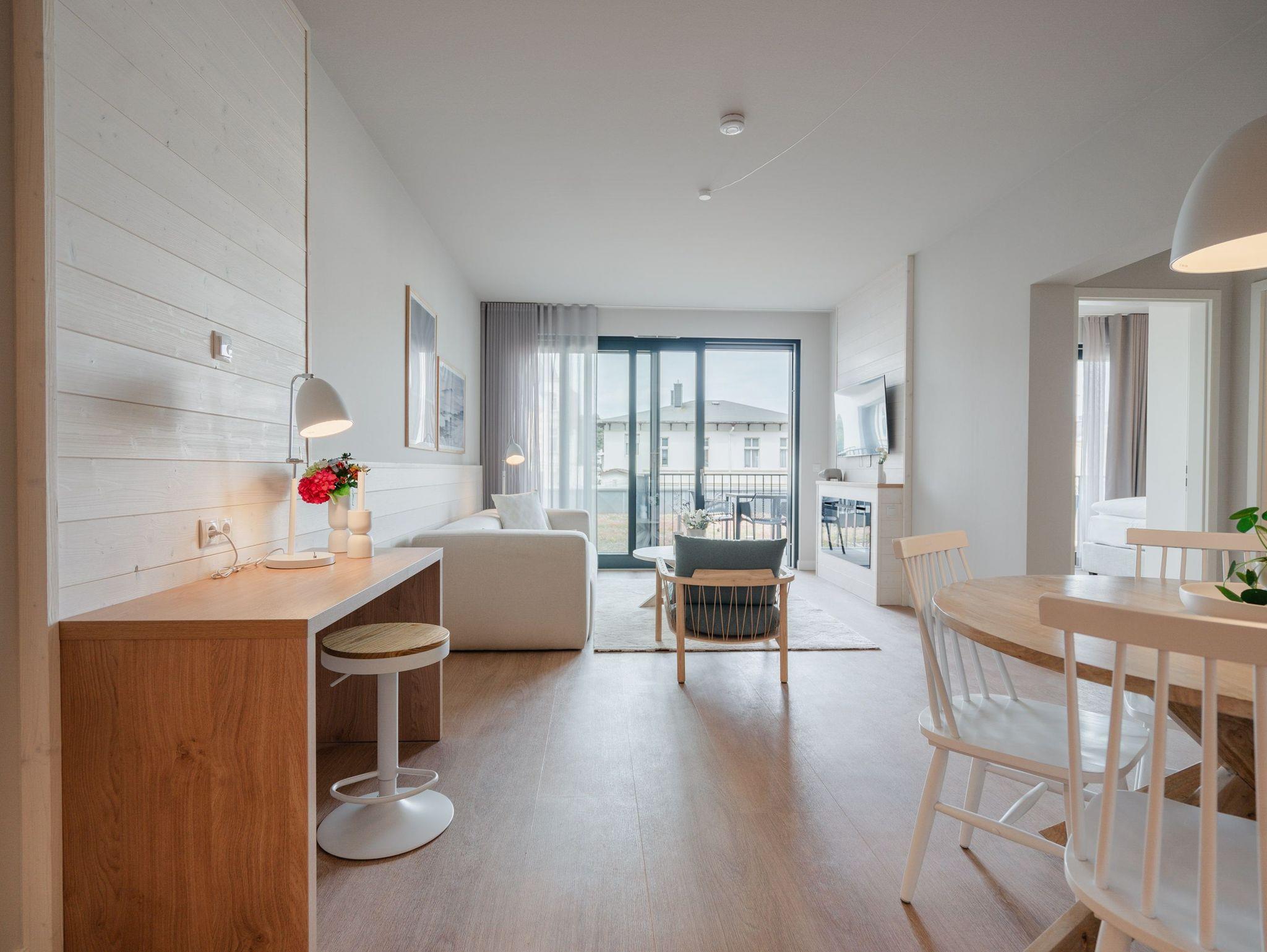 Willkommen im Appartement B1.1 (Haus B) ? Ihrem komfortablen Urlaubsparadies in der 1. Etage der Strandterrasse. Auf 82 Quadratmetern erwartet die bis zu 4 Gäste eine offene und modern eingerichtete 3-Raum-Wohnung, in der sie sich rundum wohl und gut aufgehoben fühlen. Denn Ihr Wohlgefühl steht in diesem liebevoll eingerichteten Appartement an erster Stelle. Ein großer, heller Wohnbereich mit einer vollausgestatteten Küche und einem unglaublich bequemen Entspannungsbereich empfängt Sie schon beim Eintreten. Stylische Möbel in nordischem Design sorgen für eine stilvolle Atmosphäre. Die Küchenzeile bietet mit einem Backofen, einem 4-Platten-Induktionsherd und einer Nespresso-Kapselmaschine alle Annehmlichkeiten für ein modernes Kochvergnügen. Genießen Sie anschließend die selbst gezauberten Gerichte am schönen Esstisch gemeinsam. Teil des Wohnbereiches ist eine gemütliche Sofa-Sitzgruppe, auf der man beim Blick in das Flackern des Elektrokamins (ohne Wärmeabgabe) oder beim Schauen eines Blockbusters auf dem 50 Zoll Flat-TV Raum und Zeit vergessen kann. Und auf jeden Fall die Alltagssorgen auch. Vom Wohnzimmer aus können Sie hinaus auf den Balkon mit Westausrichtung treten. Bestaunen Sie von hier aus die fantastischen Farben, die die Sonne bei ihrem Untergang an den Himmel malt. Genießen Sie die Nachmittagssonne am Gartentisch. Essen unter freiem Himmel und bei frischer Ostseeluft macht doppelt hungrig. Das Appartement verfügt über zwei Schlafzimmer: Beide laden mit komfortablen Boxspringdoppelbetten (1,80m x 2,00m) zu erholsamen Träumen ein. Jeweils ein Kleiderschrank sowie ein weiterer Flat-TV (43 Zoll) gehören zur Ausstattung dazu. Eines der beiden Schlafzimmer hat ebenfalls Zugang zum Balkon. Da muss wohl das Los entscheiden, wer morgens schon an die frische Luft darf. In der Wohnung gibt es zwei moderne Duschbäder mit Waschtisch und WC, eines davon mit einer entspannenden Infrarotsaunakabine. Ein PKW-Stellplatz in der Tiefgarage sorgt für bequemes Parken. Genießen Sie Ihren Aufenthalt in dieser stilvollen Ferienwohnung mit hochwertiger Ausstattung und perfekter Lage für einen erholsamen Urlaub am Meer.