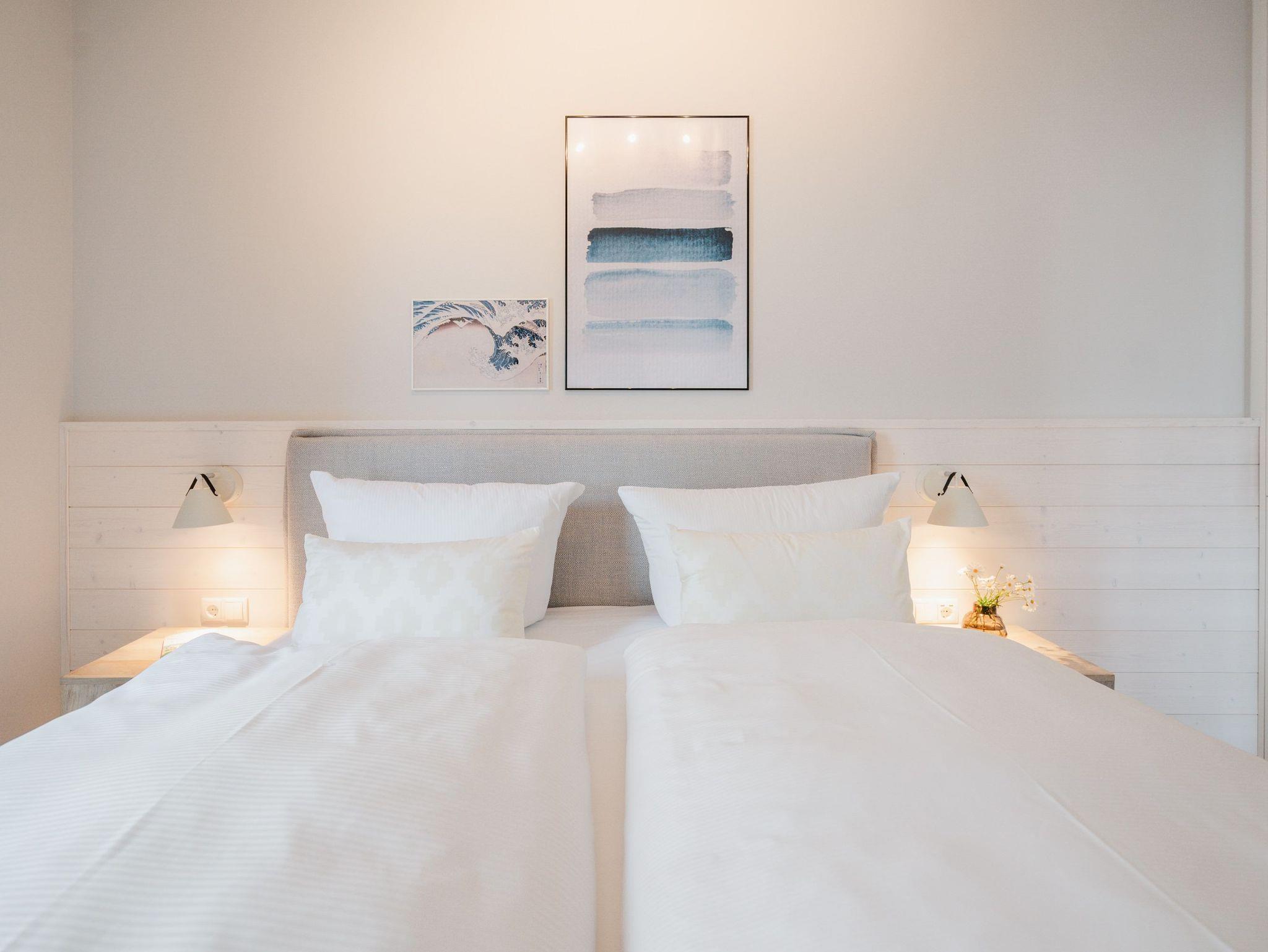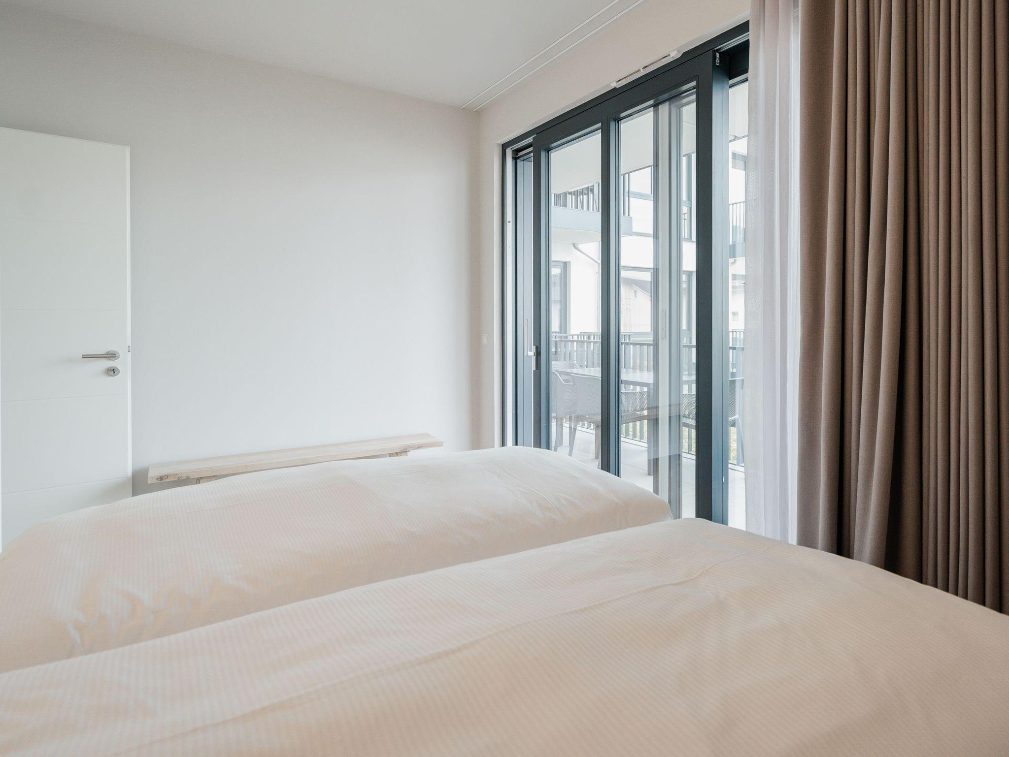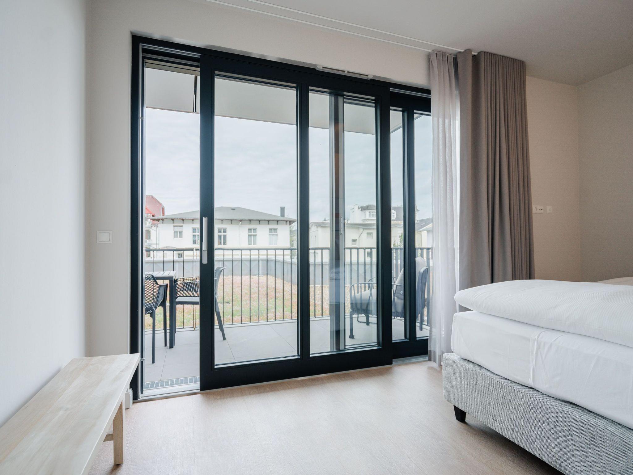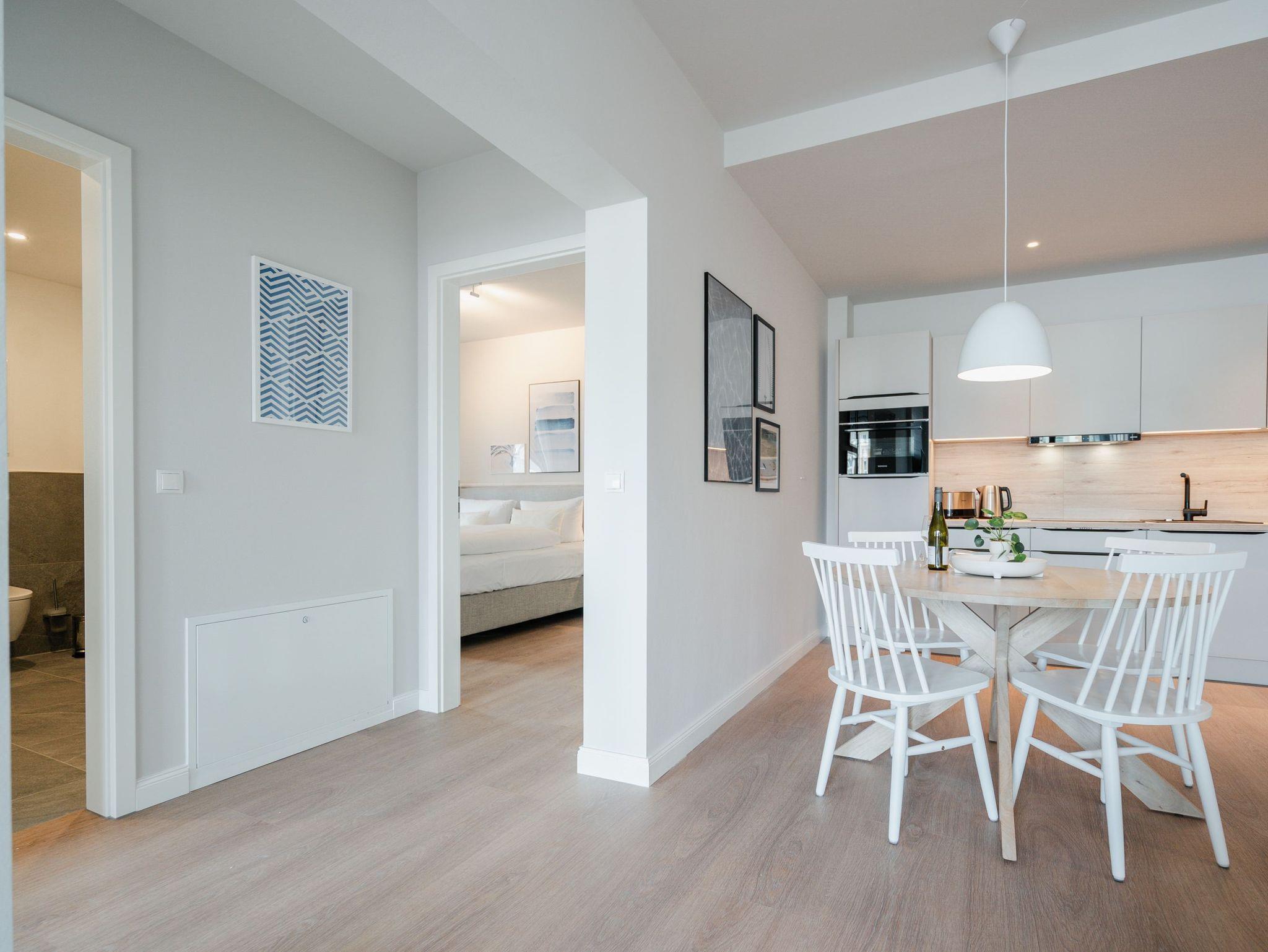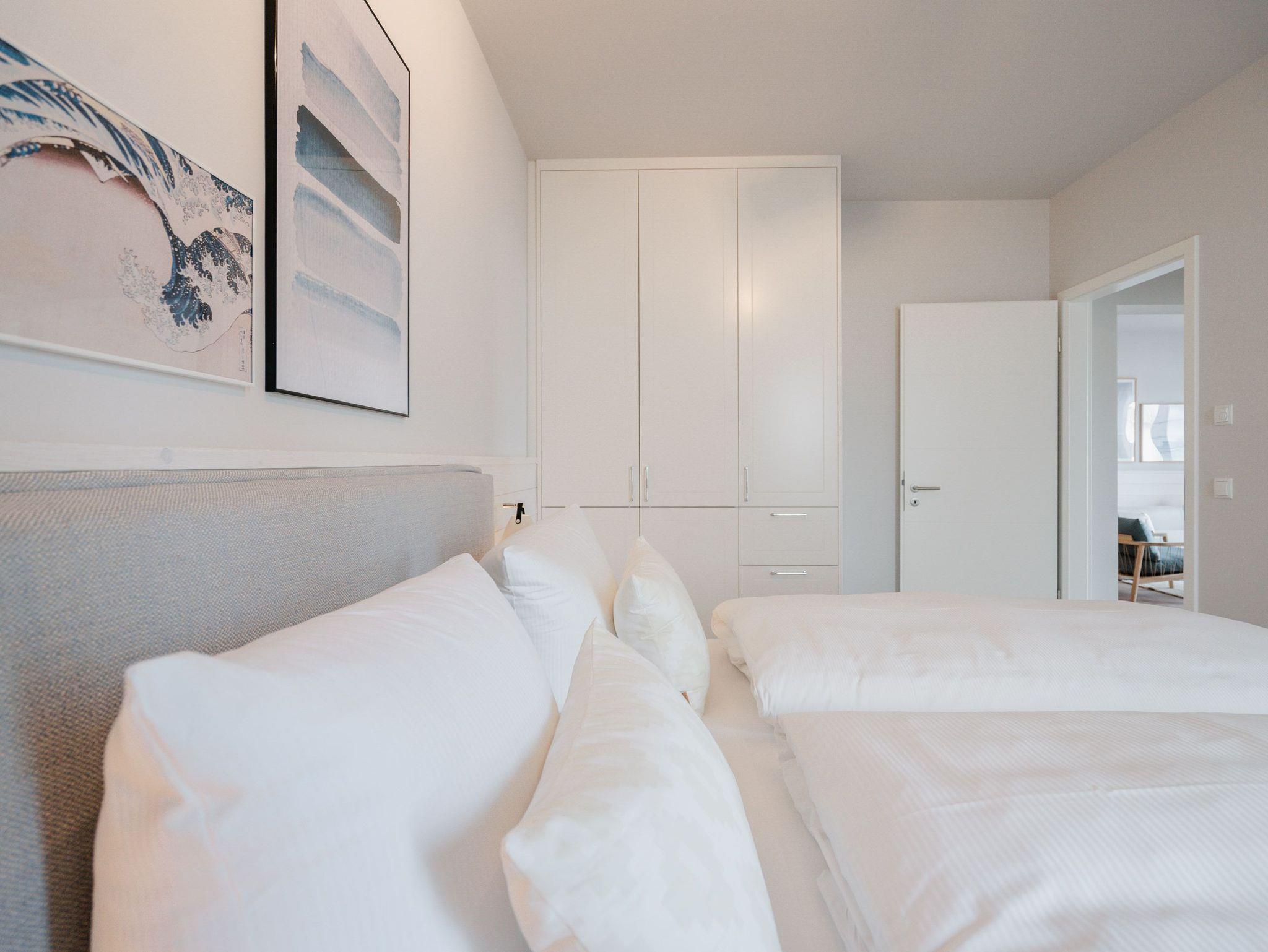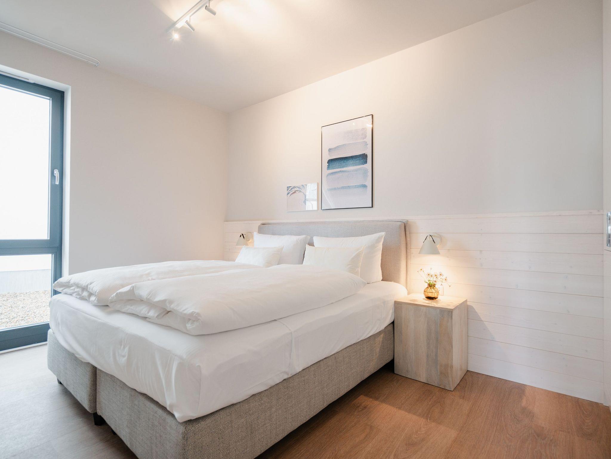 Willkommen im Appartement B1.1 (Haus B) ? Ihrem komfortablen Urlaubsparadies in der 1. Etage der Strandterrasse. Auf 82 Quadratmetern erwartet die bis zu 4 Gäste eine offene und modern eingerichtete 3-Raum-Wohnung, in der sie sich rundum wohl und gut aufgehoben fühlen. Denn Ihr Wohlgefühl steht in diesem liebevoll eingerichteten Appartement an erster Stelle. Ein großer, heller Wohnbereich mit einer vollausgestatteten Küche und einem unglaublich bequemen Entspannungsbereich empfängt Sie schon beim Eintreten. Stylische Möbel in nordischem Design sorgen für eine stilvolle Atmosphäre. Die Küchenzeile bietet mit einem Backofen, einem 4-Platten-Induktionsherd und einer Nespresso-Kapselmaschine alle Annehmlichkeiten für ein modernes Kochvergnügen. Genießen Sie anschließend die selbst gezauberten Gerichte am schönen Esstisch gemeinsam. Teil des Wohnbereiches ist eine gemütliche Sofa-Sitzgruppe, auf der man beim Blick in das Flackern des Elektrokamins (ohne Wärmeabgabe) oder beim Schauen eines Blockbusters auf dem 50 Zoll Flat-TV Raum und Zeit vergessen kann. Und auf jeden Fall die Alltagssorgen auch. Vom Wohnzimmer aus können Sie hinaus auf den Balkon mit Westausrichtung treten. Bestaunen Sie von hier aus die fantastischen Farben, die die Sonne bei ihrem Untergang an den Himmel malt. Genießen Sie die Nachmittagssonne am Gartentisch. Essen unter freiem Himmel und bei frischer Ostseeluft macht doppelt hungrig. Das Appartement verfügt über zwei Schlafzimmer: Beide laden mit komfortablen Boxspringdoppelbetten (1,80m x 2,00m) zu erholsamen Träumen ein. Jeweils ein Kleiderschrank sowie ein weiterer Flat-TV (43 Zoll) gehören zur Ausstattung dazu. Eines der beiden Schlafzimmer hat ebenfalls Zugang zum Balkon. Da muss wohl das Los entscheiden, wer morgens schon an die frische Luft darf. In der Wohnung gibt es zwei moderne Duschbäder mit Waschtisch und WC, eines davon mit einer entspannenden Infrarotsaunakabine. Ein PKW-Stellplatz in der Tiefgarage sorgt für bequemes Parken. Genießen Sie Ihren Aufenthalt in dieser stilvollen Ferienwohnung mit hochwertiger Ausstattung und perfekter Lage für einen erholsamen Urlaub am Meer.