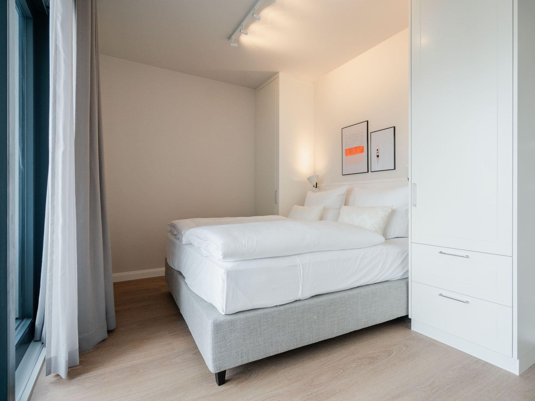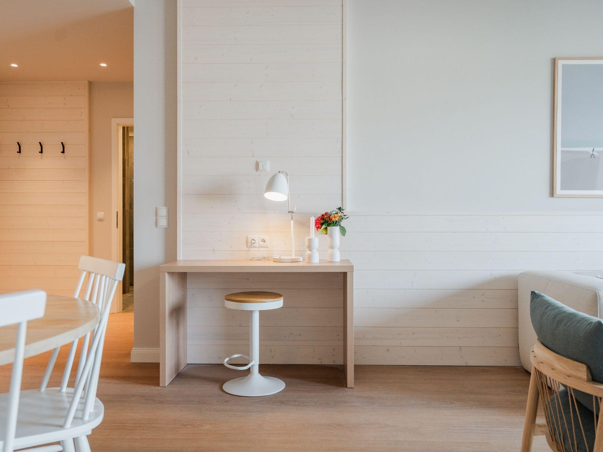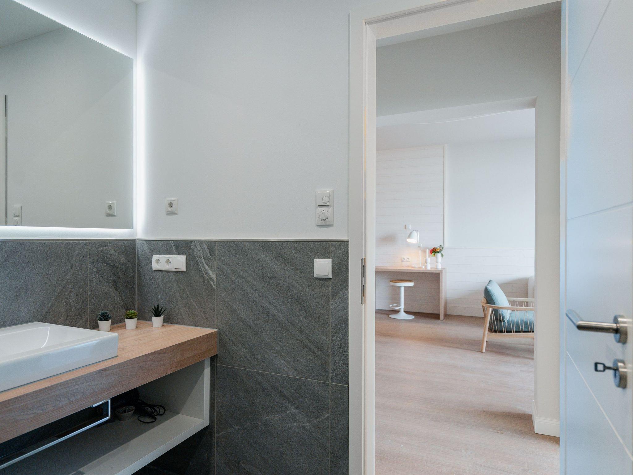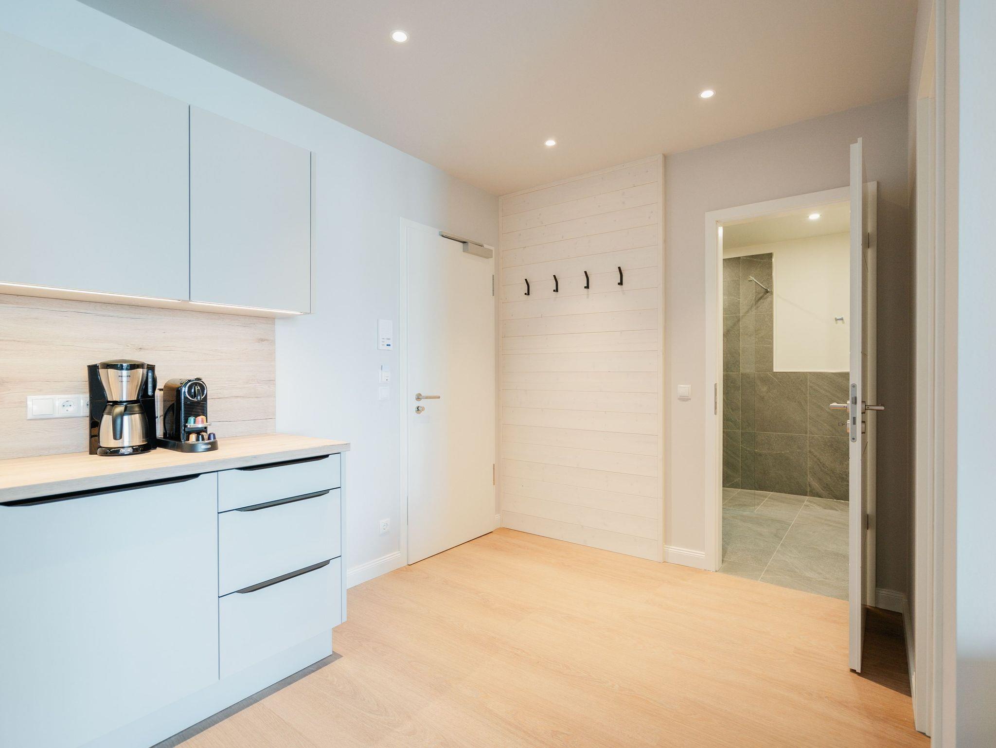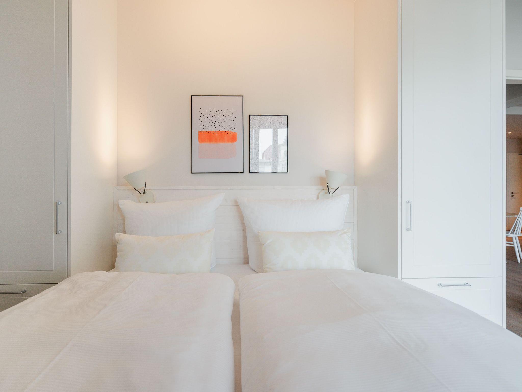 Willkommen im Appartement B1.1 (Haus B) ? Ihrem komfortablen Urlaubsparadies in der 1. Etage der Strandterrasse. Auf 82 Quadratmetern erwartet die bis zu 4 Gäste eine offene und modern eingerichtete 3-Raum-Wohnung, in der sie sich rundum wohl und gut aufgehoben fühlen. Denn Ihr Wohlgefühl steht in diesem liebevoll eingerichteten Appartement an erster Stelle. Ein großer, heller Wohnbereich mit einer vollausgestatteten Küche und einem unglaublich bequemen Entspannungsbereich empfängt Sie schon beim Eintreten. Stylische Möbel in nordischem Design sorgen für eine stilvolle Atmosphäre. Die Küchenzeile bietet mit einem Backofen, einem 4-Platten-Induktionsherd und einer Nespresso-Kapselmaschine alle Annehmlichkeiten für ein modernes Kochvergnügen. Genießen Sie anschließend die selbst gezauberten Gerichte am schönen Esstisch gemeinsam. Teil des Wohnbereiches ist eine gemütliche Sofa-Sitzgruppe, auf der man beim Blick in das Flackern des Elektrokamins (ohne Wärmeabgabe) oder beim Schauen eines Blockbusters auf dem 50 Zoll Flat-TV Raum und Zeit vergessen kann. Und auf jeden Fall die Alltagssorgen auch. Vom Wohnzimmer aus können Sie hinaus auf den Balkon mit Westausrichtung treten. Bestaunen Sie von hier aus die fantastischen Farben, die die Sonne bei ihrem Untergang an den Himmel malt. Genießen Sie die Nachmittagssonne am Gartentisch. Essen unter freiem Himmel und bei frischer Ostseeluft macht doppelt hungrig. Das Appartement verfügt über zwei Schlafzimmer: Beide laden mit komfortablen Boxspringdoppelbetten (1,80m x 2,00m) zu erholsamen Träumen ein. Jeweils ein Kleiderschrank sowie ein weiterer Flat-TV (43 Zoll) gehören zur Ausstattung dazu. Eines der beiden Schlafzimmer hat ebenfalls Zugang zum Balkon. Da muss wohl das Los entscheiden, wer morgens schon an die frische Luft darf. In der Wohnung gibt es zwei moderne Duschbäder mit Waschtisch und WC, eines davon mit einer entspannenden Infrarotsaunakabine. Ein PKW-Stellplatz in der Tiefgarage sorgt für bequemes Parken. Genießen Sie Ihren Aufenthalt in dieser stilvollen Ferienwohnung mit hochwertiger Ausstattung und perfekter Lage für einen erholsamen Urlaub am Meer.