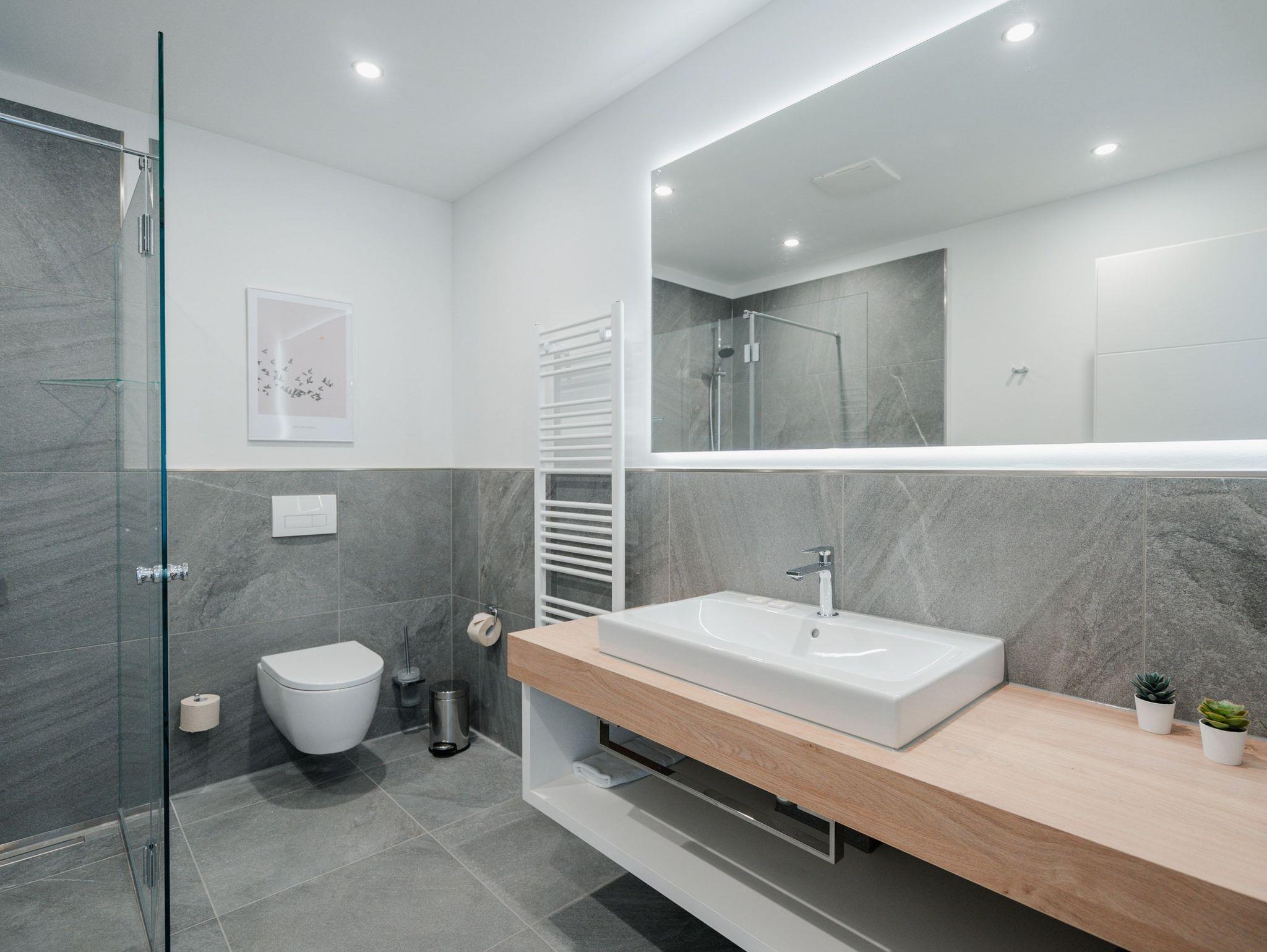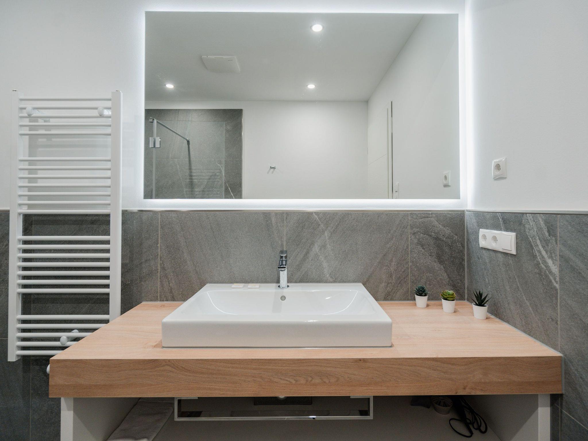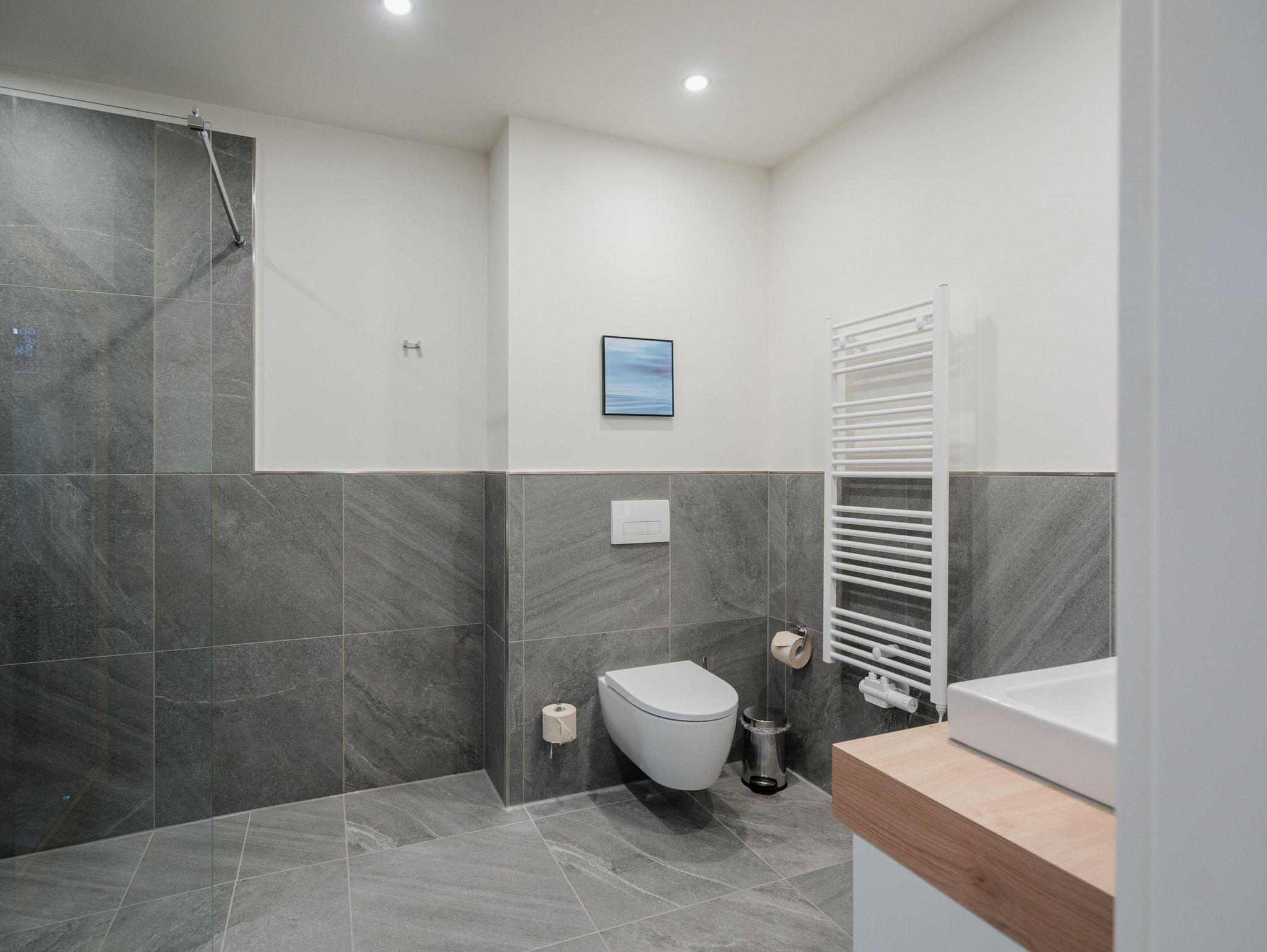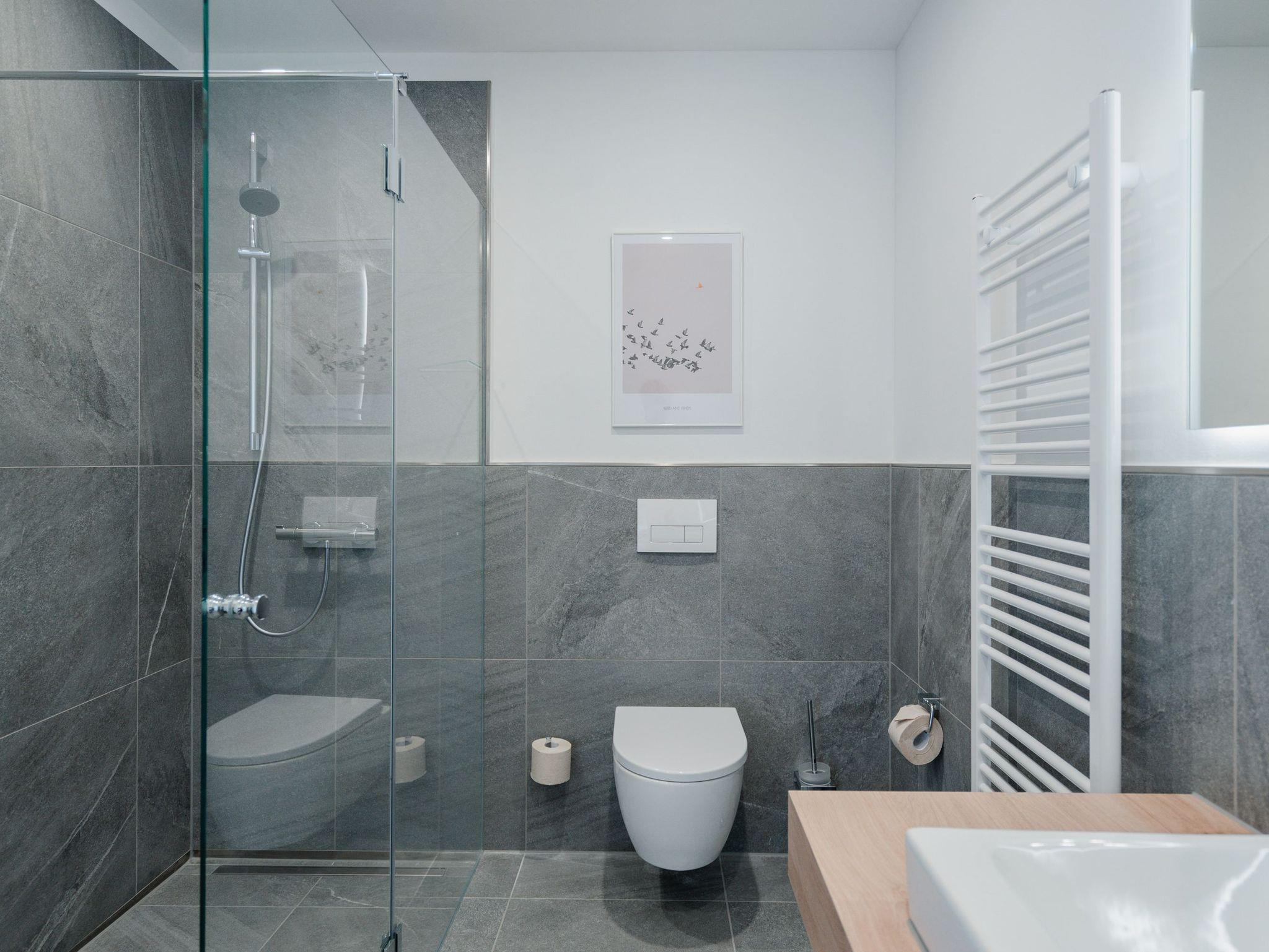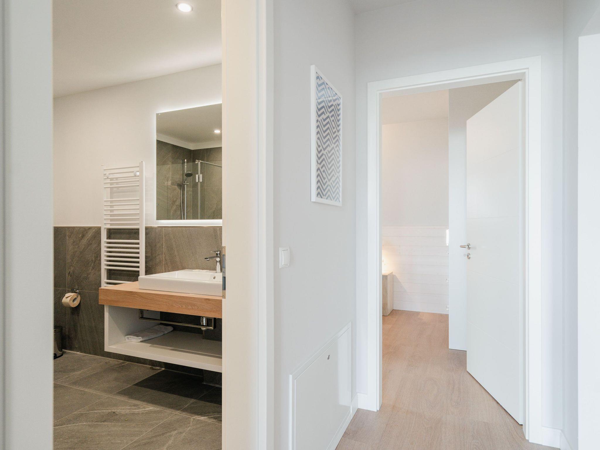 Willkommen im Appartement B1.1 (Haus B) ? Ihrem komfortablen Urlaubsparadies in der 1. Etage der Strandterrasse. Auf 82 Quadratmetern erwartet die bis zu 4 Gäste eine offene und modern eingerichtete 3-Raum-Wohnung, in der sie sich rundum wohl und gut aufgehoben fühlen. Denn Ihr Wohlgefühl steht in diesem liebevoll eingerichteten Appartement an erster Stelle. Ein großer, heller Wohnbereich mit einer vollausgestatteten Küche und einem unglaublich bequemen Entspannungsbereich empfängt Sie schon beim Eintreten. Stylische Möbel in nordischem Design sorgen für eine stilvolle Atmosphäre. Die Küchenzeile bietet mit einem Backofen, einem 4-Platten-Induktionsherd und einer Nespresso-Kapselmaschine alle Annehmlichkeiten für ein modernes Kochvergnügen. Genießen Sie anschließend die selbst gezauberten Gerichte am schönen Esstisch gemeinsam. Teil des Wohnbereiches ist eine gemütliche Sofa-Sitzgruppe, auf der man beim Blick in das Flackern des Elektrokamins (ohne Wärmeabgabe) oder beim Schauen eines Blockbusters auf dem 50 Zoll Flat-TV Raum und Zeit vergessen kann. Und auf jeden Fall die Alltagssorgen auch. Vom Wohnzimmer aus können Sie hinaus auf den Balkon mit Westausrichtung treten. Bestaunen Sie von hier aus die fantastischen Farben, die die Sonne bei ihrem Untergang an den Himmel malt. Genießen Sie die Nachmittagssonne am Gartentisch. Essen unter freiem Himmel und bei frischer Ostseeluft macht doppelt hungrig. Das Appartement verfügt über zwei Schlafzimmer: Beide laden mit komfortablen Boxspringdoppelbetten (1,80m x 2,00m) zu erholsamen Träumen ein. Jeweils ein Kleiderschrank sowie ein weiterer Flat-TV (43 Zoll) gehören zur Ausstattung dazu. Eines der beiden Schlafzimmer hat ebenfalls Zugang zum Balkon. Da muss wohl das Los entscheiden, wer morgens schon an die frische Luft darf. In der Wohnung gibt es zwei moderne Duschbäder mit Waschtisch und WC, eines davon mit einer entspannenden Infrarotsaunakabine. Ein PKW-Stellplatz in der Tiefgarage sorgt für bequemes Parken. Genießen Sie Ihren Aufenthalt in dieser stilvollen Ferienwohnung mit hochwertiger Ausstattung und perfekter Lage für einen erholsamen Urlaub am Meer.