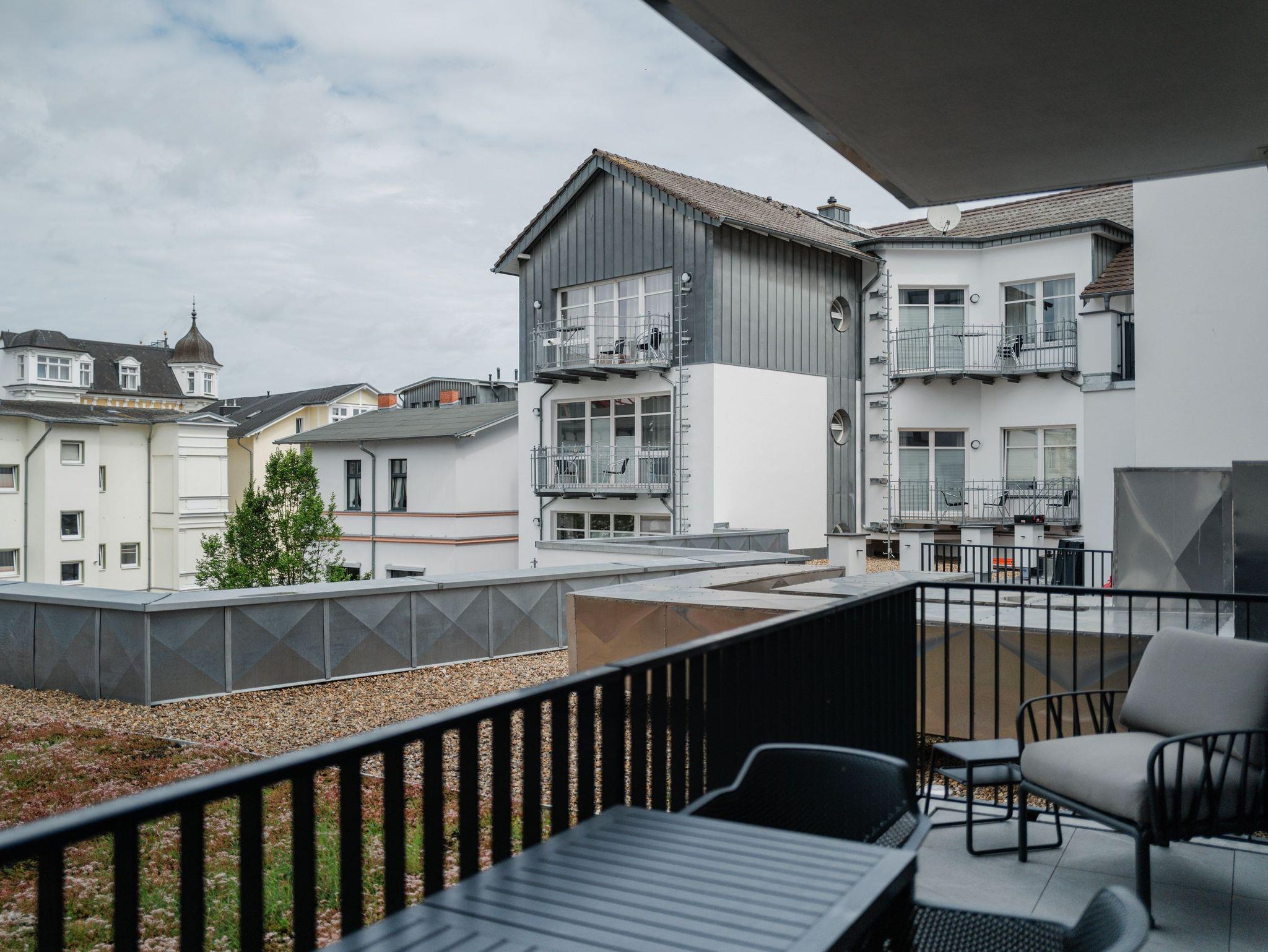 Die 2024 fertig gestellte Strandterrasse liegt direkt an der belebten Strandpromenade und bietet einen einzigartigen Ausblick auf die Grand Dame der historischen Seebrücken sowie die historische Konzertmuschel, einem beliebten Treffpunkt für Kunst und Kultur. Dahinter liegt die Ostsee ? ein Panorama, das zu den schönsten in den Kaiserbädern gehört. Es ist wie das Abtauchen in eine andere Zeit. In eine Zeit, in der man mit Stock, Sonnenschirm und Hut fürs ?Sehen und gesehen werden? über die Promenade schlenderte; aber auch in eine Zeit, in der ? damals wie heute ? Zeit einmal für eine kurze Weile keine Rolle spielt. Weil man angekommen ist im Loslassen, Entspannen und Genießen. Es ist dieser besondere Geruch nach Meeresluft und Freiheit, der in Erinnerung bleibt. Dazu die Bilder, die man mitnimmt. Von langen Strandspaziergängen, vom Lachen in fröhlich schäumenden Ostseewellen, von der Zeit in einem wunderschönen Urlaubsdomizil. Denn genau das ist die Strandterrasse mit ihren 56 modernen und exklusiven Ferienappartements direkt gegenüber der Ahlbecker Seebrücke. Die Ein-, Zwei- oder Dreizimmerwohnungen ? zwischen 40 und 70 Quadratmeter groß ? sind von einer Innenarchitektin gemeinsam mit unserem Erfahrungsschatz an Gästewünschen mit viel Liebe zum Detail und ganz individuell konzipiert worden. Entspannung und Wohlfühlen stehen an erster Stelle. Alles ist aufeinander abgestimmt und sorgt für eine gemütliche Atmosphäre. Wählen Sie zwischen einem Domizil in einem hellen, sandfarbenen Designkonzept oder einem Appartement mit anthrazitfarbenen Farbakzenten. Alle Appartements verfügen gleichermaßen über eine stilvolle und komfortable Einrichtung, die passgenau angefertigt worden ist, sowie über moderne Küchen und Bäder. Jedem Schlafzimmer ist ein eigenes Bad mit Dusche zugeordnet (außer App. B4.5). Die Appartements besitzen fast alle einen Balkon ? viele schauen sogar zur Ostsee hinaus. Die meisten Feriendomizile haben einen Elektrokamin und Infrarotsaunen. Im Erdgeschoss befindet sich ein separater Gemeinschaftsraum für Fahrräder. Außerdem besteht die Möglichkeit, im Gemeinschaftswaschraum 2 Waschmaschinen [&] Trockner zu nutzen. Ergänzt wird das Angebot durch eine Gemeinschaftssauna, die täglich von 11:00 bis 22:00 Uhr nutzbar ist. In der Tiefgarage (Einfahrtshöhe 2,03 Meter) steht für jede Wohnung 1 Pkw-Stellplatz zur Verfügung. Ist alles zur Zufriedenheit untergebracht? Dann kann der Urlaub ja beginnen. Und beim Blick vom Balkon über die Ostsee treffen sich zum Sonnenaufgang das Heute und das Damals. Gelassenheit legt sich beim Gang hinunter an den Strand auf die Seele. Jetzt darf die Zeit stehenbleiben.