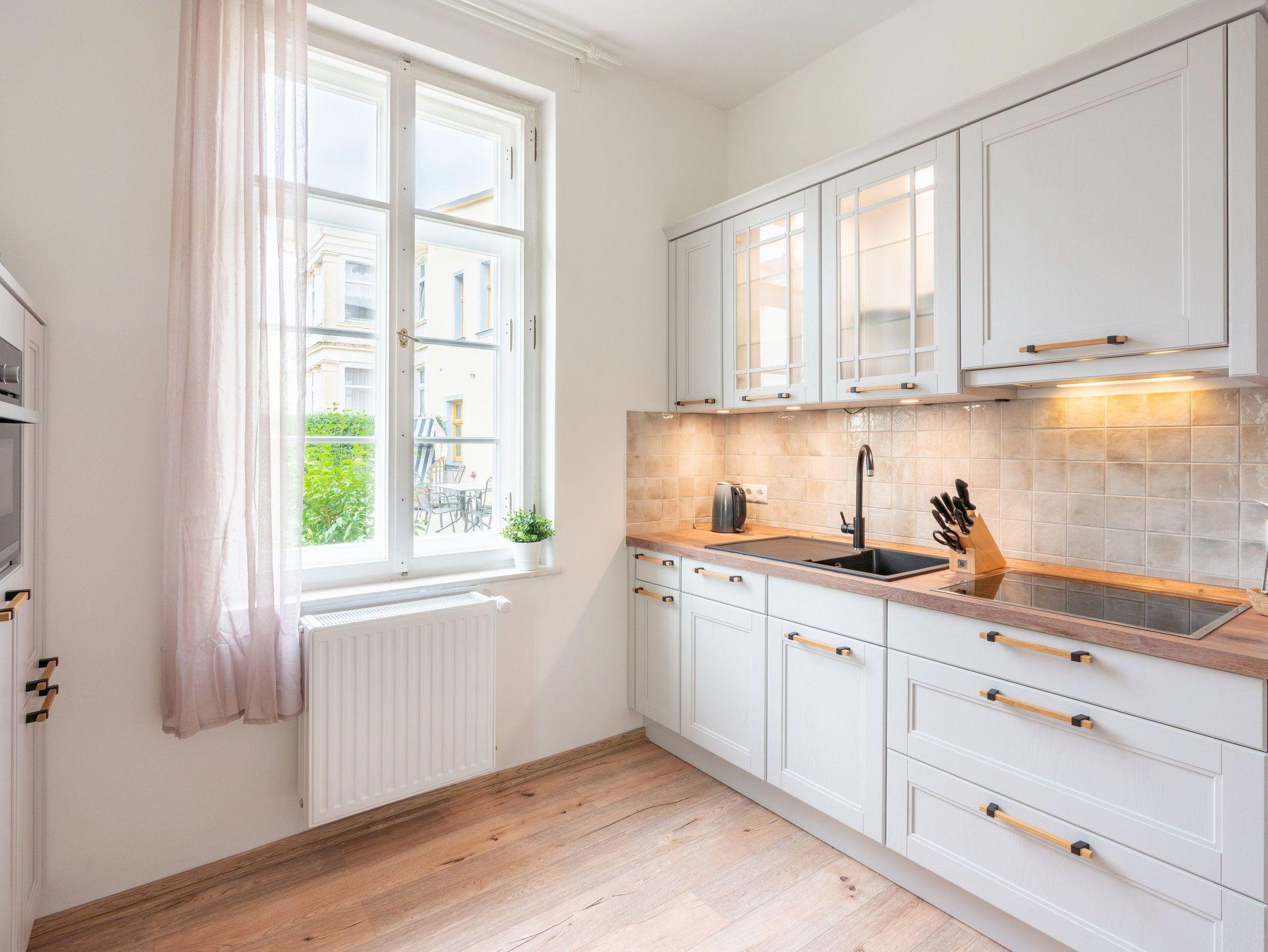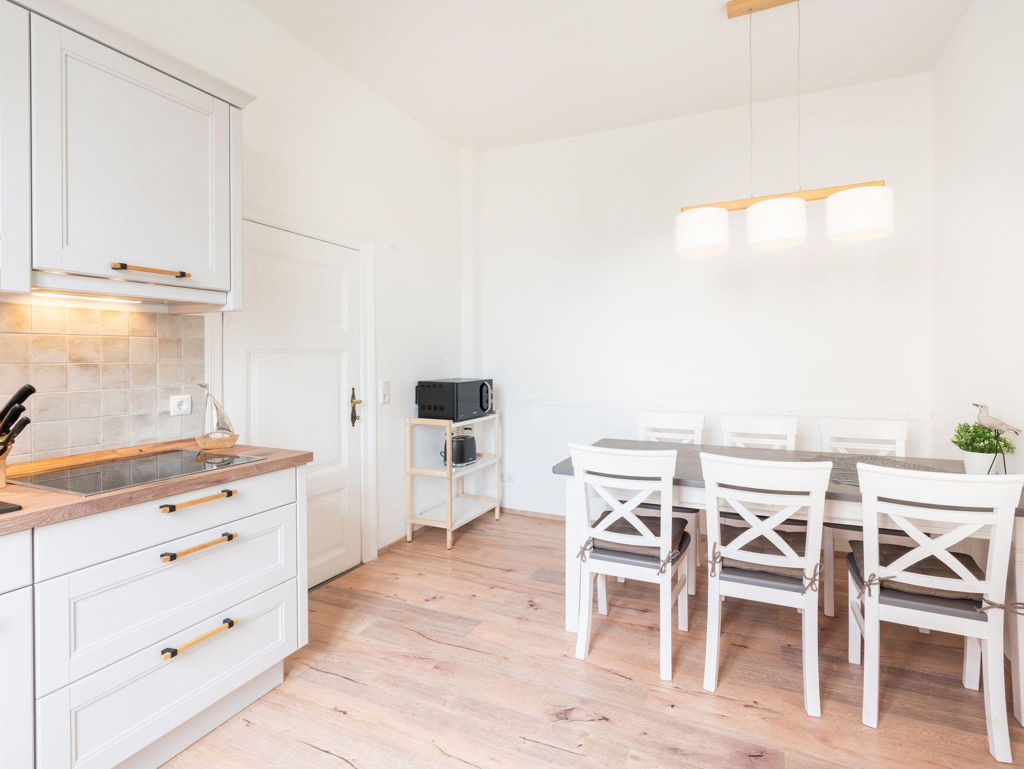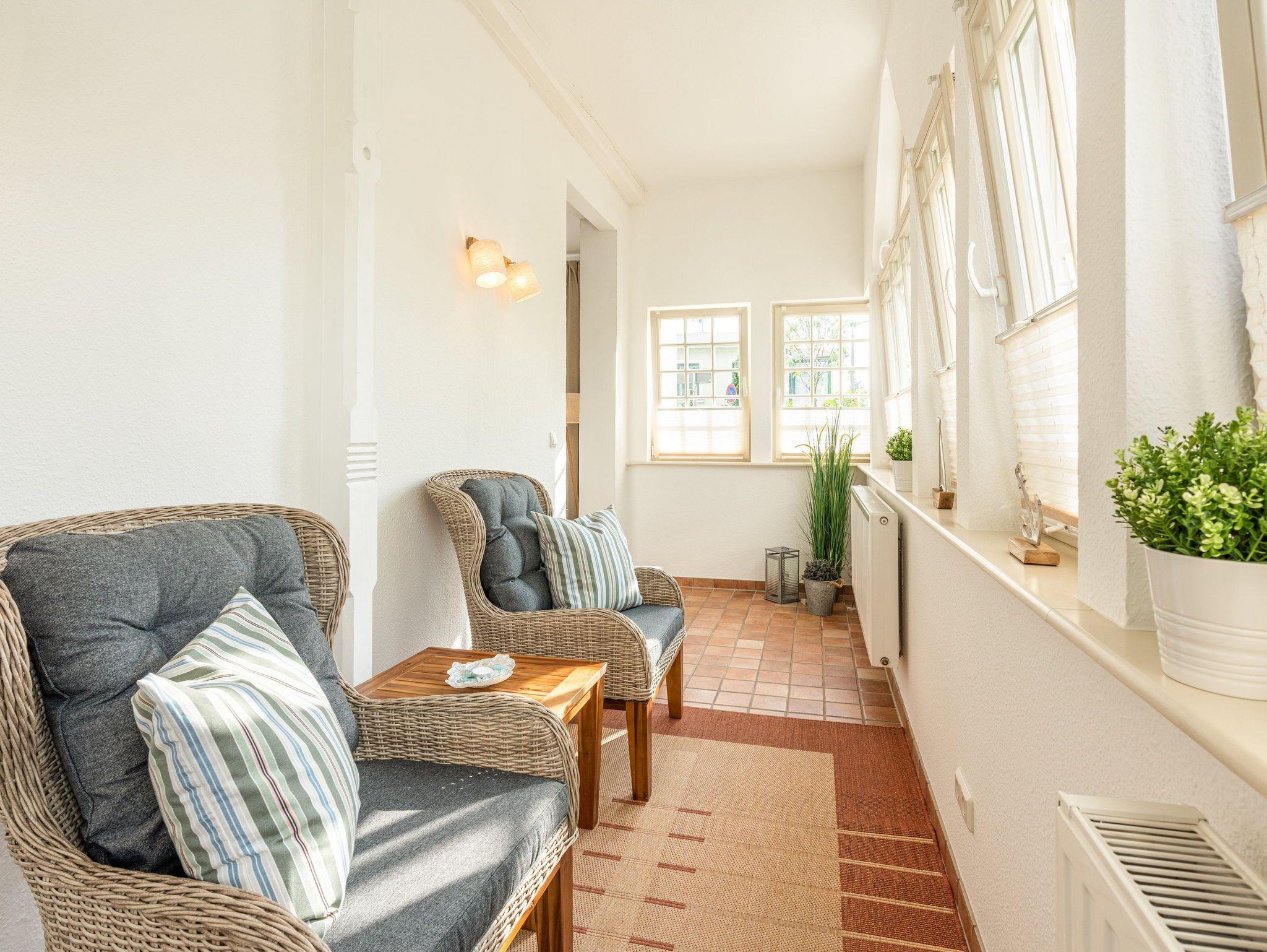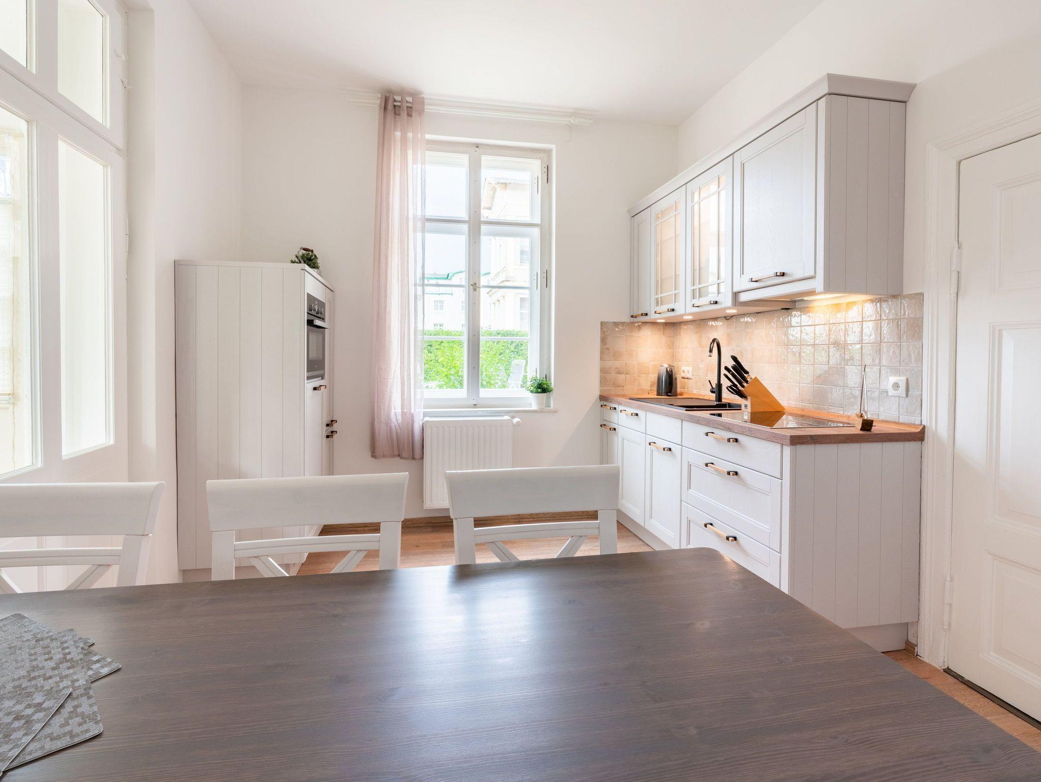 Das neu möblierte 2-Raum-Appartement mit dem Charme der alten Bäderarchitektur mitten im Herzen von Ahlbeck befindet sich im Erdgeschoss. Die 78 Quadratmeter Wohnfläche bieten ausreichend Platz für einen erholsamen Urlaub mit bis zu vier Personen. Der helle Wohnbereich ist mit Flat-TV und bequemen Polstermöbeln ausgestattet. Verbringen Sie hier Ihre familiären und geselligen Stunden. Das Sofa kann auch als Schlafstätte für zwei weitere Personen umfunktioniert werden. Der lichtdurchflutete, angrenzende Wintergarten lädt zum gemütlichen Verweilen bei einer schönen Tasse Tee ein. Die hochwertig ausgestattete Küche (Herd mit Backofen, Kühlschrank mit Tiefkühlfach, Geschirrspülmaschine, Mikrowelle, 3-in-1-Kaffeemaschine für Pads, Kapseln und Kaffeepulver, Toaster und Wasserkocher) im Landhausstil lässt keine Wünsche offen. Bereiten Sie gemeinsam Ihre Lieblingsspeisen zu und genießen Sie diese an dem großzügigen Esstisch.