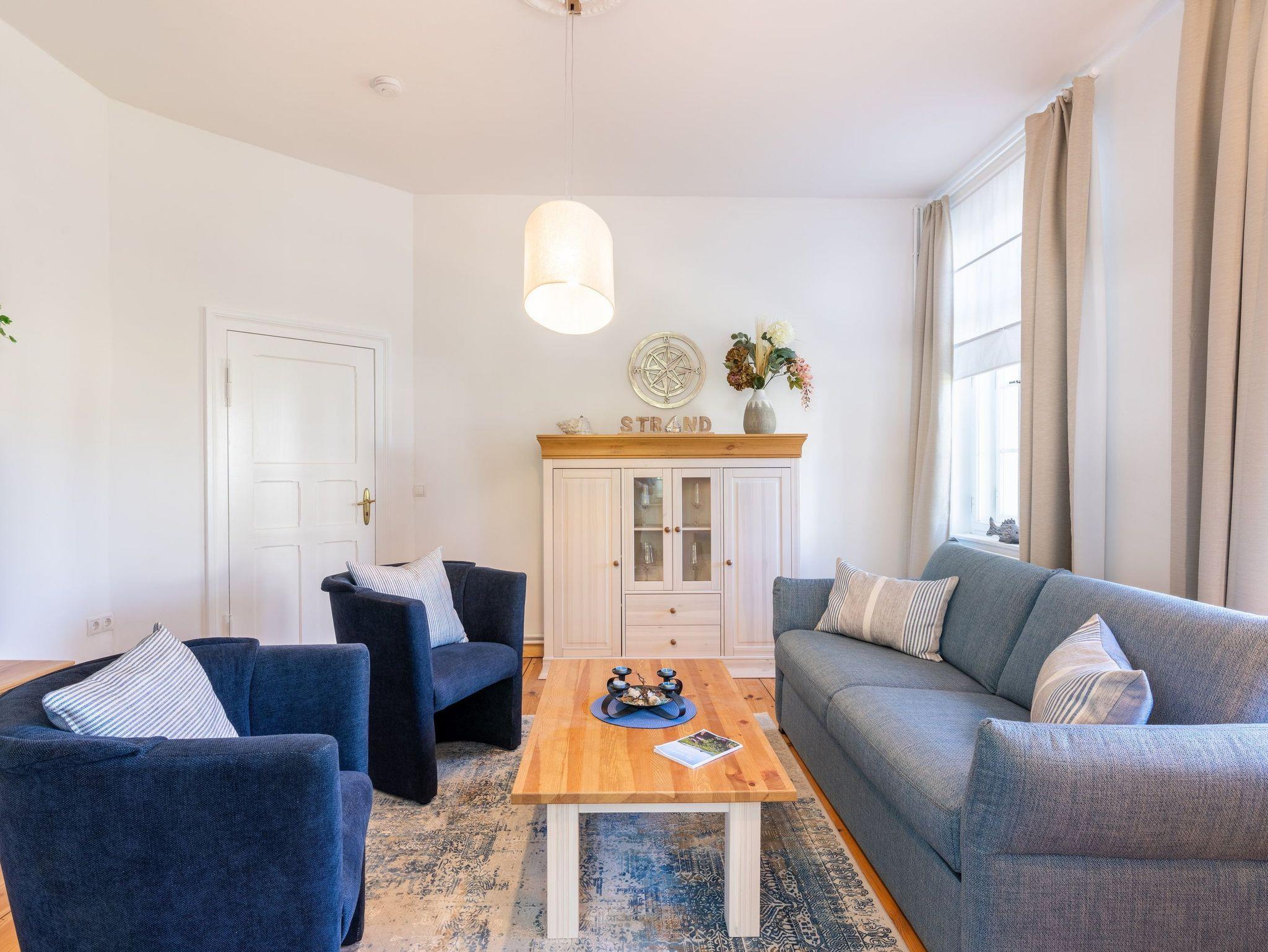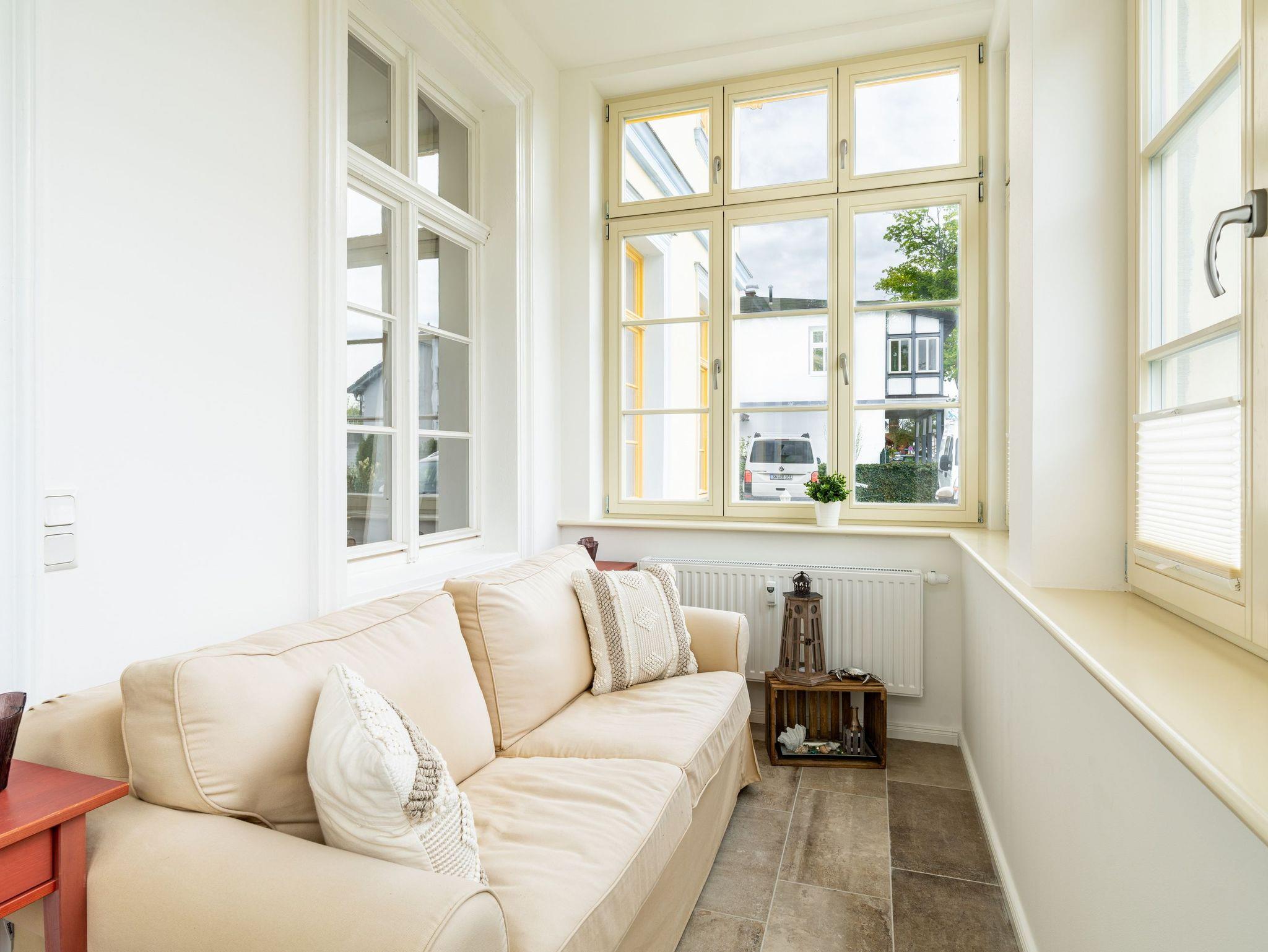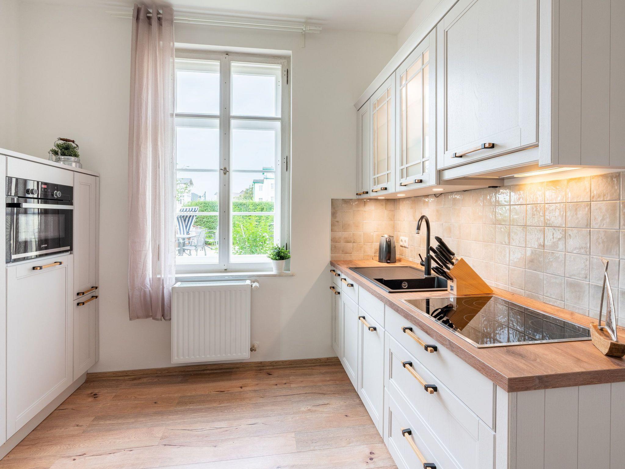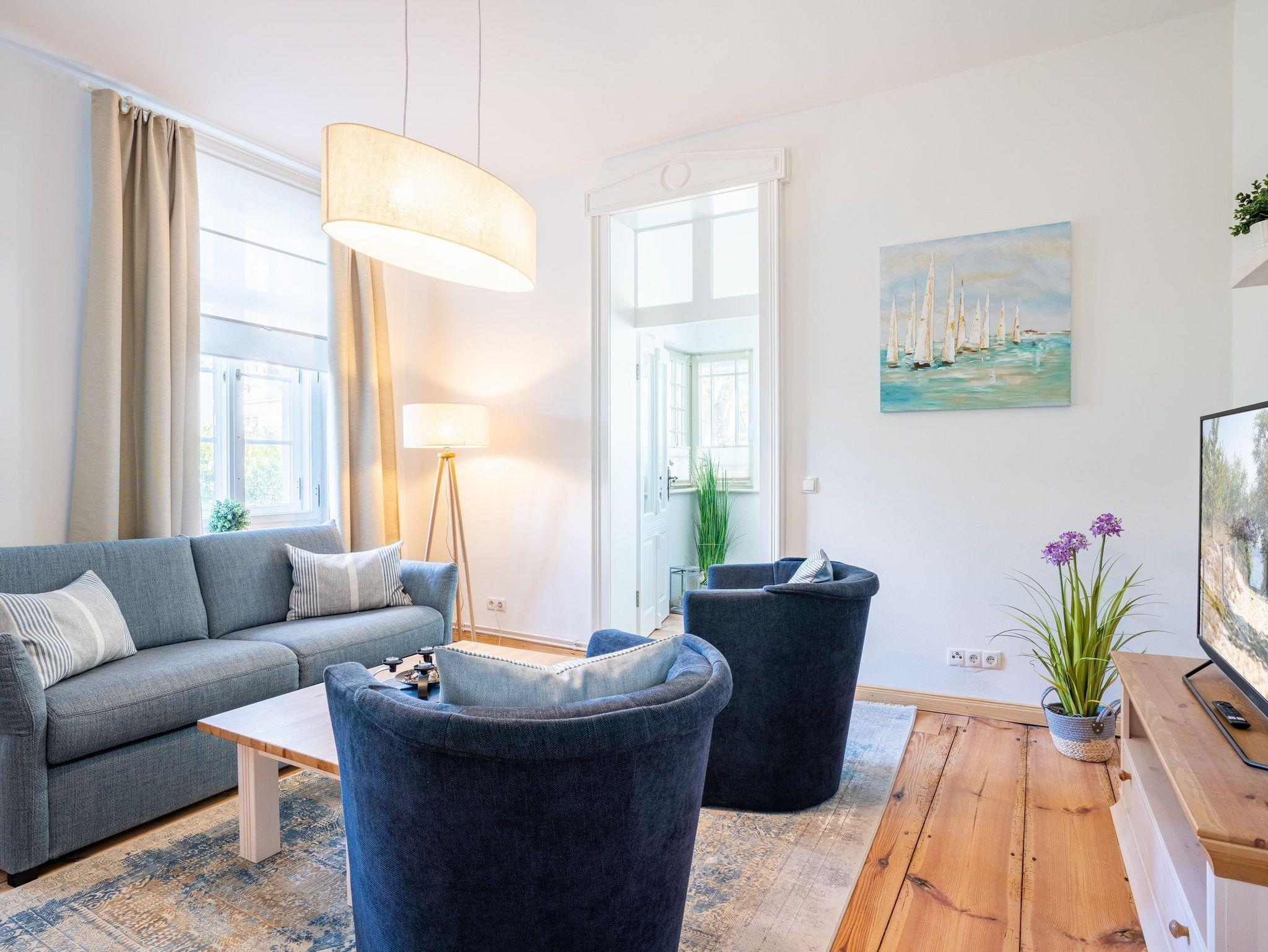 Das neu möblierte 2-Raum-Appartement mit dem Charme der alten Bäderarchitektur mitten im Herzen von Ahlbeck befindet sich im Erdgeschoss. Die 78 Quadratmeter Wohnfläche bieten ausreichend Platz für einen erholsamen Urlaub mit bis zu vier Personen. Der helle Wohnbereich ist mit Flat-TV und bequemen Polstermöbeln ausgestattet. Verbringen Sie hier Ihre familiären und geselligen Stunden. Das Sofa kann auch als Schlafstätte für zwei weitere Personen umfunktioniert werden. Der lichtdurchflutete, angrenzende Wintergarten lädt zum gemütlichen Verweilen bei einer schönen Tasse Tee ein. Die hochwertig ausgestattete Küche (Herd mit Backofen, Kühlschrank mit Tiefkühlfach, Geschirrspülmaschine, Mikrowelle, 3-in-1-Kaffeemaschine für Pads, Kapseln und Kaffeepulver, Toaster und Wasserkocher) im Landhausstil lässt keine Wünsche offen. Bereiten Sie gemeinsam Ihre Lieblingsspeisen zu und genießen Sie diese an dem großzügigen Esstisch.