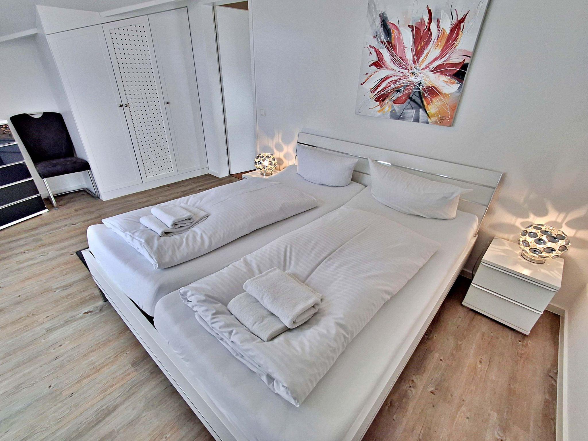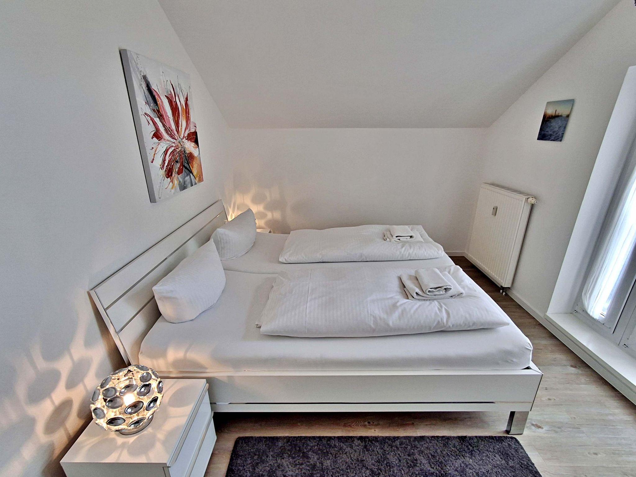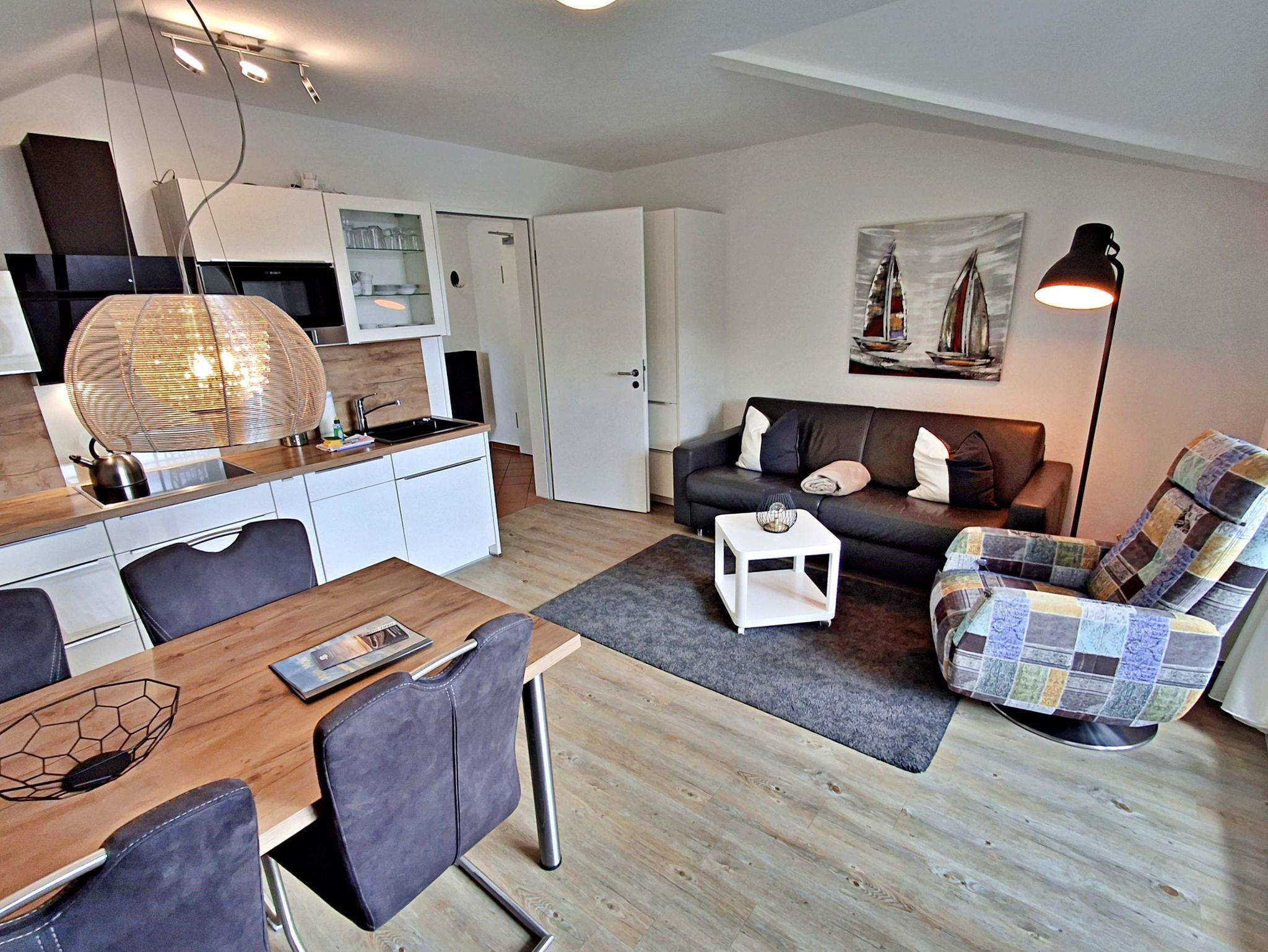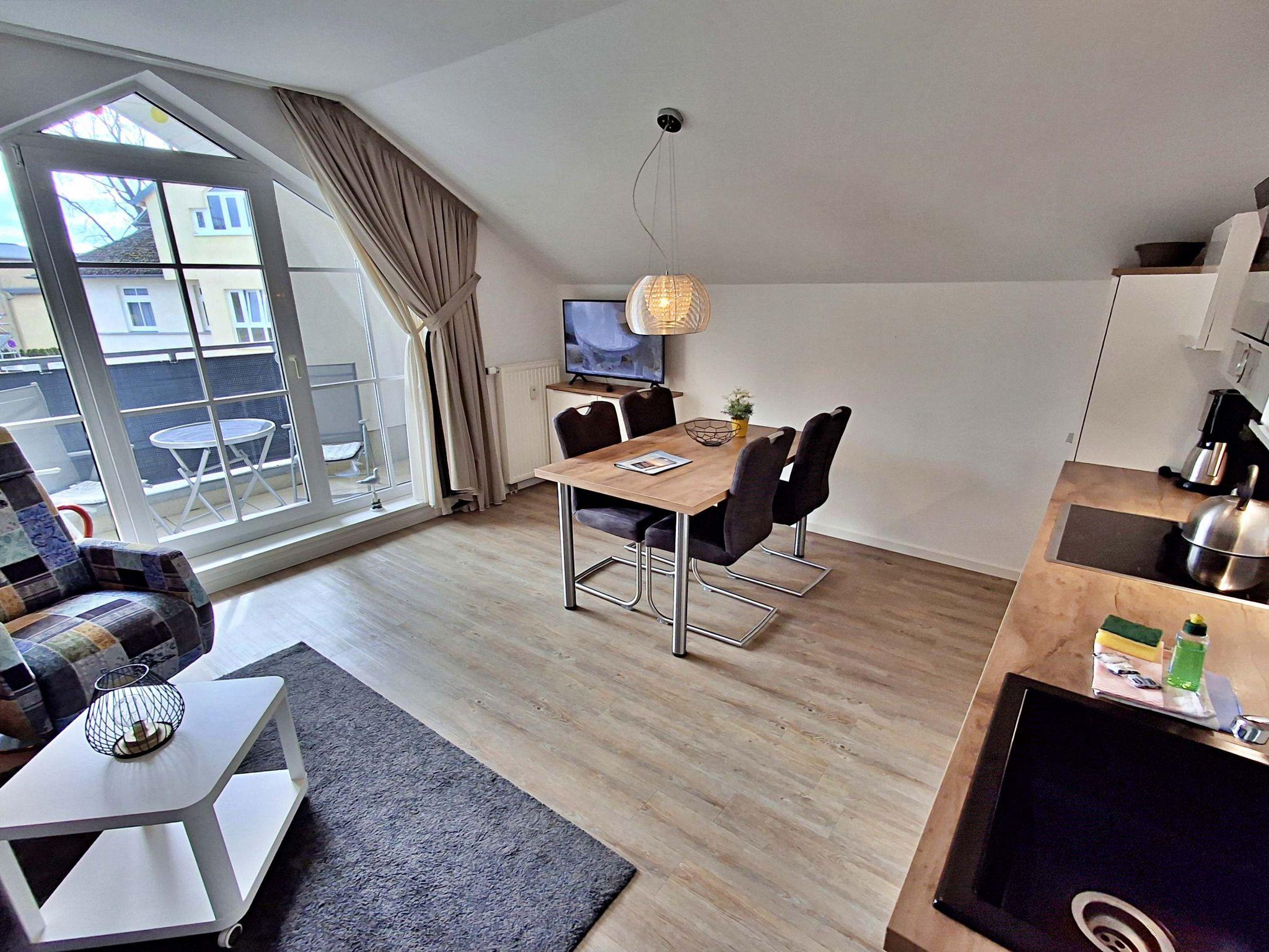 Diese schöne 2-Raum-Wohnung mit Balkon befindet sich im 3.OG (Dachgeschoss, Süd-Ost Lage) auf 45 qm Wohnfläche. Bis zum 2. OG können Sie den Fahrstuhl nutzen. Das sonnige Wohnzimmer verfügt über eine Couch, welche auch zum Schlafen geeignet ist (160 x 200 cm, 7 Zonen Matratze), Fernsehsessel und Esstisch mit 4 Stühlen. Für die Unterhaltung sorgt ein Smart-TV. Die vollständig ausgestattete Küchenzeile mit Ceranherd, Kühlschrank mit Gefriermöglichkeit, Spülmaschine und Mikrowelle mit Grill lässt keine Wünsche offen. Im gemütlichen Schlafzimmer befindet sich ein großes Doppelbett, Kleiderschrank und ein zweiter Flachbild-TV. Das angrenzende Bad mit DU/WC und Haarfön wird Sie zusätzlich begeistern. Ein Balkon lädt zum Sitzen und Verweilen ein.