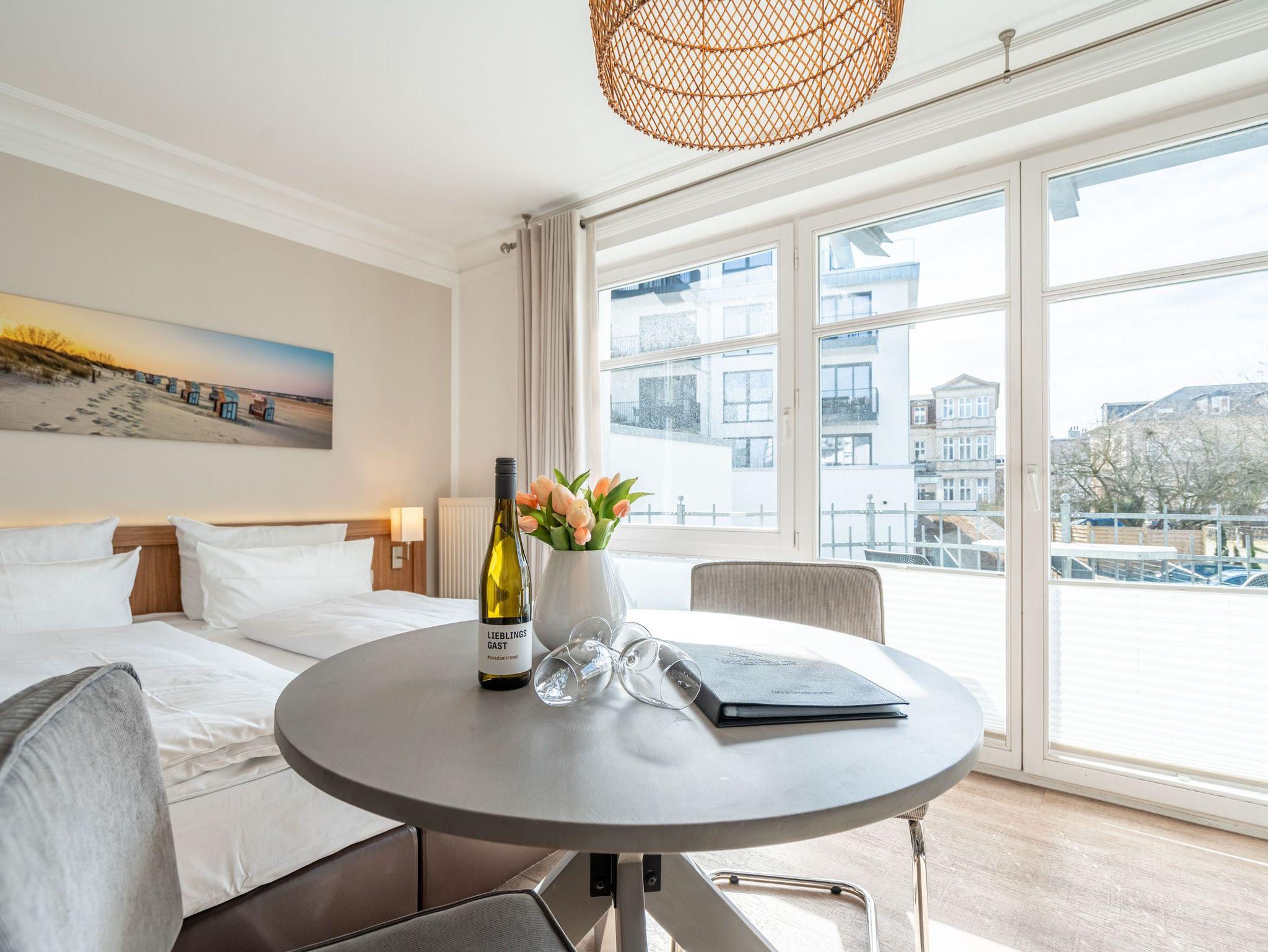 Die 1-Raum-Ferienwohnung Nr. C03 in der Villa Seedüwel bietet auf 35 qm komfortablen Platz für zwei Personen und befindet sich in der 1. Etage. Der offene Wohnbereich ist mit einer Küchenzeile ausgestattet, die ein 3-Zonen-Induktionskochfeld, eine Mikrowelle und einen Kühlschrank mit Gefrierfach umfasst. Ein Essplatz für zwei Personen, eine gemütliche Sitzgruppe und ein Flat-TV sorgen für Komfort. Das Doppelbett (1,80 m x 2,00 m) befindet sich ebenfalls im Wohnbereich und wird durch eine Kommode sowie einen Kleiderschrank ergänzt. Von hier aus gelangen Sie auf den sonnigen Süd-West-Balkon. Das Tageslicht-Bad verfügt über eine Dusche, ein Waschbecken und ein WC. Ein Stellplatz in der Tiefgarage ( Einfahrthöhe 2,03m) des benachbarten Hauses ?Strandterrasse? ist für Sie reserviert. WLAN steht Ihnen kostenfrei zur Verfügung.