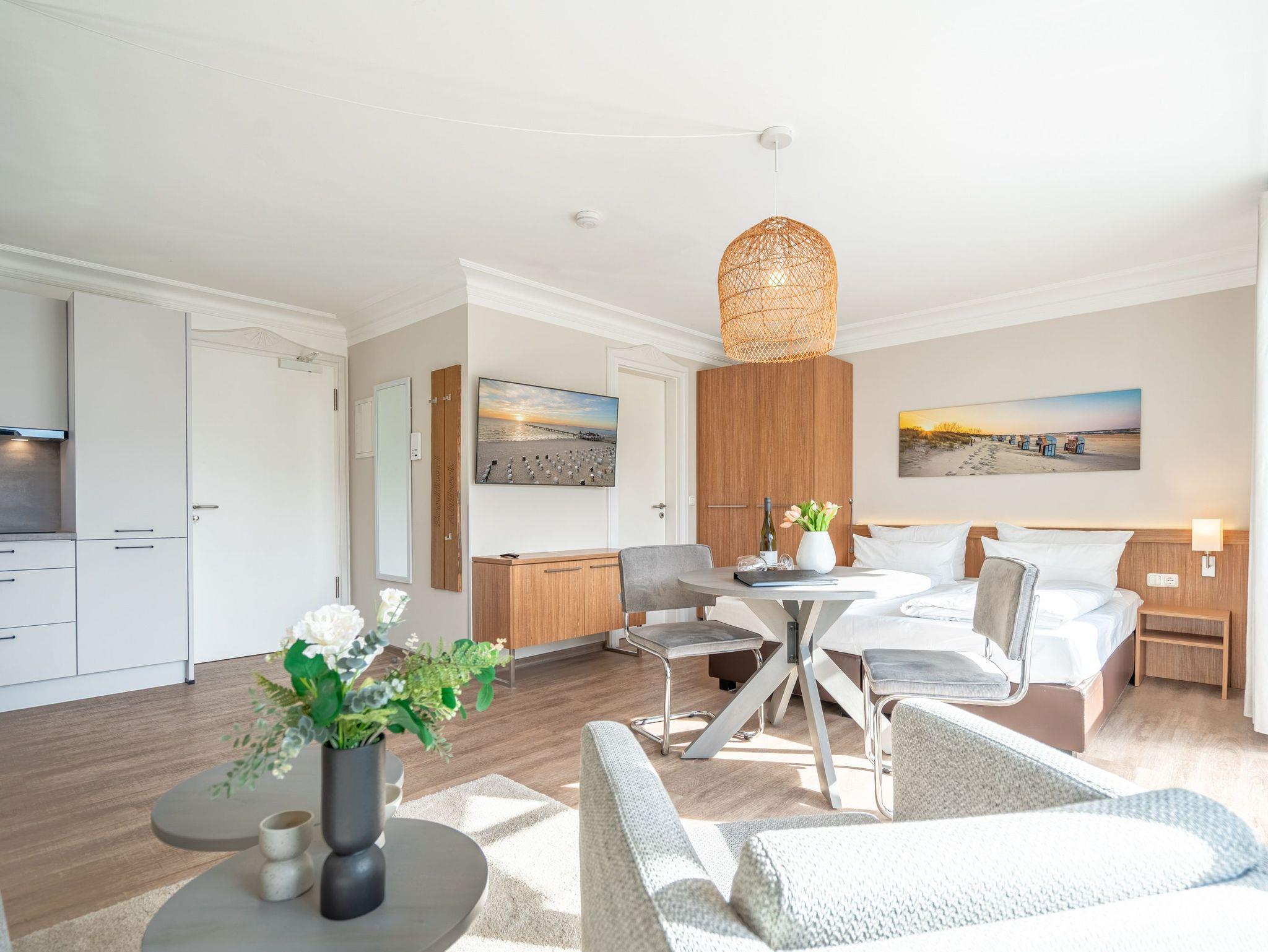 Die 1-Raum-Ferienwohnung Nr. C03 in der Villa Seedüwel bietet auf 35 qm komfortablen Platz für zwei Personen und befindet sich in der 1. Etage. Der offene Wohnbereich ist mit einer Küchenzeile ausgestattet, die ein 3-Zonen-Induktionskochfeld, eine Mikrowelle und einen Kühlschrank mit Gefrierfach umfasst. Ein Essplatz für zwei Personen, eine gemütliche Sitzgruppe und ein Flat-TV sorgen für Komfort. Das Doppelbett (1,80 m x 2,00 m) befindet sich ebenfalls im Wohnbereich und wird durch eine Kommode sowie einen Kleiderschrank ergänzt. Von hier aus gelangen Sie auf den sonnigen Süd-West-Balkon. Das Tageslicht-Bad verfügt über eine Dusche, ein Waschbecken und ein WC. Ein Stellplatz in der Tiefgarage ( Einfahrthöhe 2,03m) des benachbarten Hauses „Strandterrasse“ ist für Sie reserviert. WLAN steht Ihnen kostenfrei zur Verfügung.