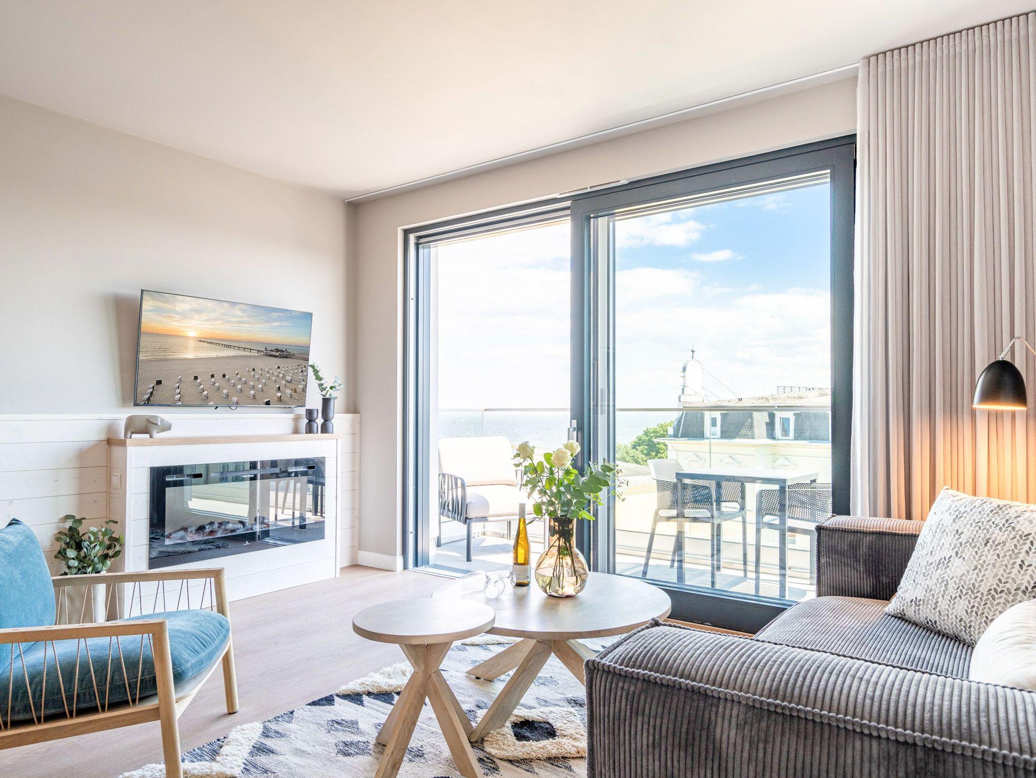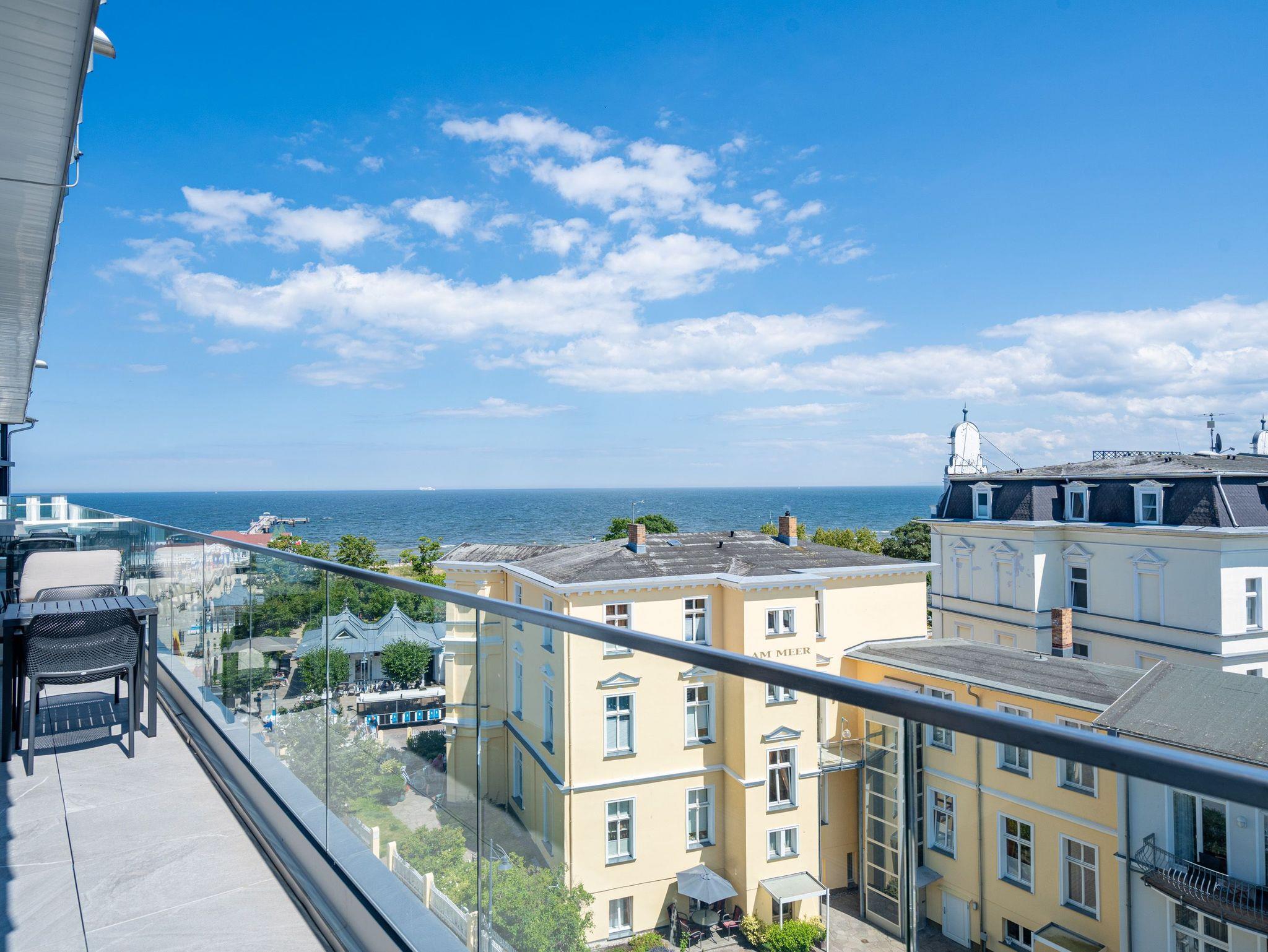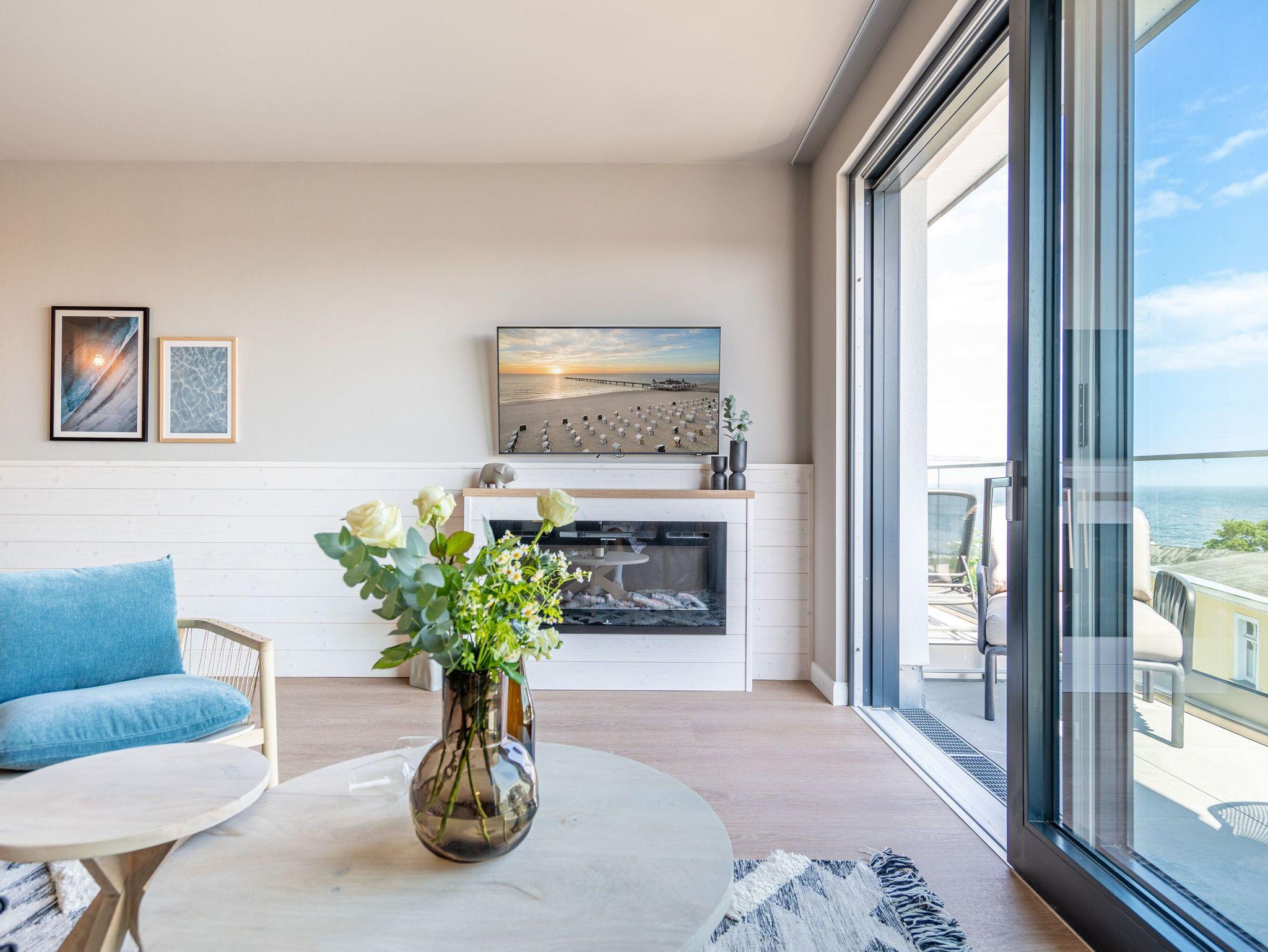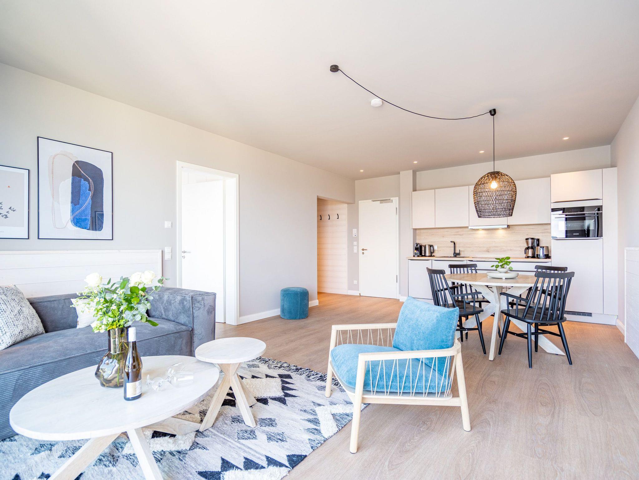 Willkommen in einem charmanten Rückzugsort an der Ostsee für bis zu 2 Personen. Das 2-Raum-Appartement B 4.3 (Haus B) im 4. Obergeschoss der Strandterrasse ist ein ganz besonderes Urlaubsdomizil. Denn es ist nicht nur unglaublich kuschelig und elegant eingerichtet, sondern bietet darüber hinaus einen atemberaubenden Blick über die Ostsee. Näher dran am Meer geht nur am Strand. Der liegt Ihnen übrigens direkt zu Füßen. Das 63 Quadratmeter große Appartement ist speziell für Paare konzipiert, die einen Faible für nordische Designmöbel haben und das gewisse Etwas lieben. Sie werden sich hier rundum wohlfühlen. Das großzügige Wohnzimmer ist mit einem schönen Sofa, einem Elektrokamin (ohne Wärmeabgabe) und einem großen Esstisch stilvoll eingerichtet. Ein aufeinander abgestimmtes Farbkonzept sorgt für eine beruhigende Atmosphäre. Der große Flat-TV (50 Zoll) ist Ihr ganz persönliches Heimkino. Machen Sie es sich hier gemütlich. Eine moderne Küchenzeile, die zum Wohnzimmer hin offen ist, bietet allen Technikkomfort, den Sie brauchen können, um köstliche Gerichte zu zaubern. Vom Backofen über einen 3-Platten-Induktionsherd, eine Geschirrspülmaschine, einen Toaster bis hin zum Wasserkocher ? es ist alles da. Wenn Sie guten Kaffee mögen, können Sie sich Ihren Morgenkaffee von der Nespresso-Kapselmaschine machen lassen. So starten Sie perfekt in den Tag an der Ostsee. Vom Süd-Ostbalkon aus haben Sie einen herrlichen Blick aufs Meer. Die Weite, die sich hier eröffnet, ist ein wundervoller Entschleuniger und schickt Ihre Gedanken auf Reisen. Essen bei Meeresluft, faulenzen auf der Sonnenliege ? auf dem großzügigen Freiluftbalkon können Sie entspannte Stunden verbringen. Auch vom Schlafzimmer aus können Sie auf den Balkon hinaustreten. Für einen erholsamen Schlaf sorgt das komfortable Boxspringdoppelbett (1,80m x 2,00m). Das Schlafzimmer ist zudem mit einem geräumigen Kleiderschrank, einem weiteren 50 Zoll Flat-TV und einem Arbeitsplatz ausgestattet. Das moderne Badezimmer verfügt über eine Dusche, einen Waschtisch, ein WC und sogar eine Infrarotsaunakabine. Die bietet wohlig warme Entspannung an kühlen Tagen. Ihr Auto steht sicher und trocken auf dem PKW-Stellplatz in der Tiefgarage. Wir wünschen Ihnen viel Freude in diesem charmanten und stilvollen Ferienappartement und einen unvergesslich schönen Ostseeaufenthalt.