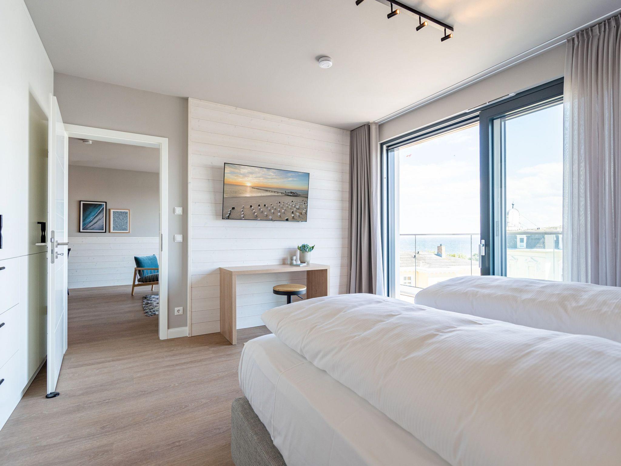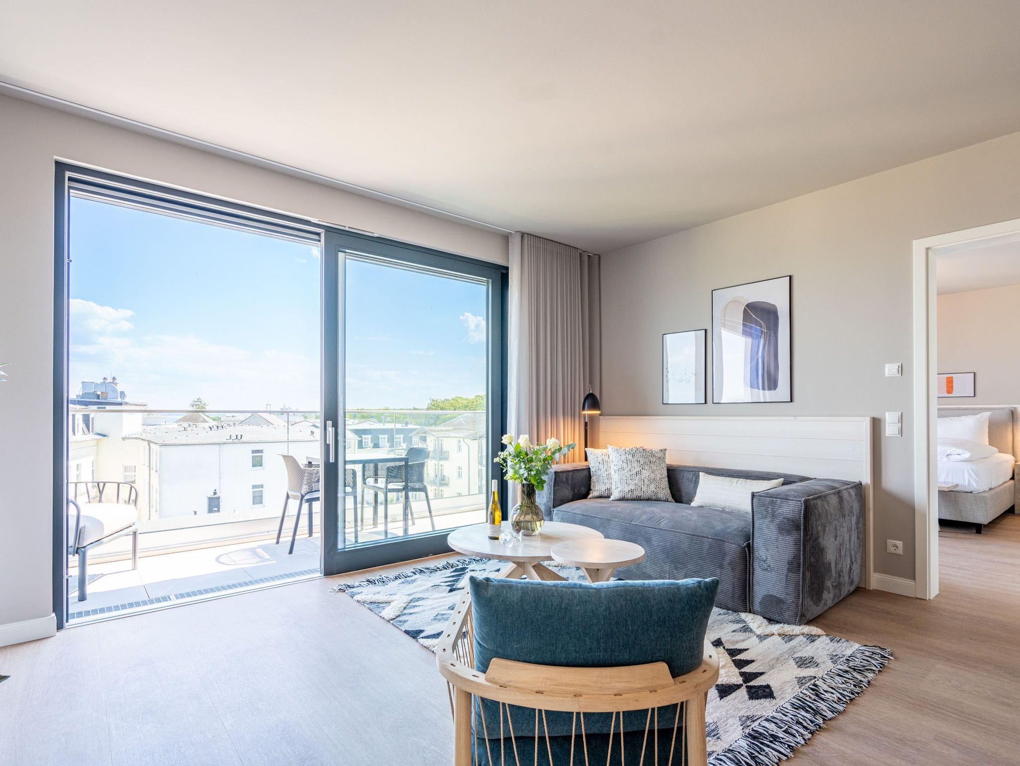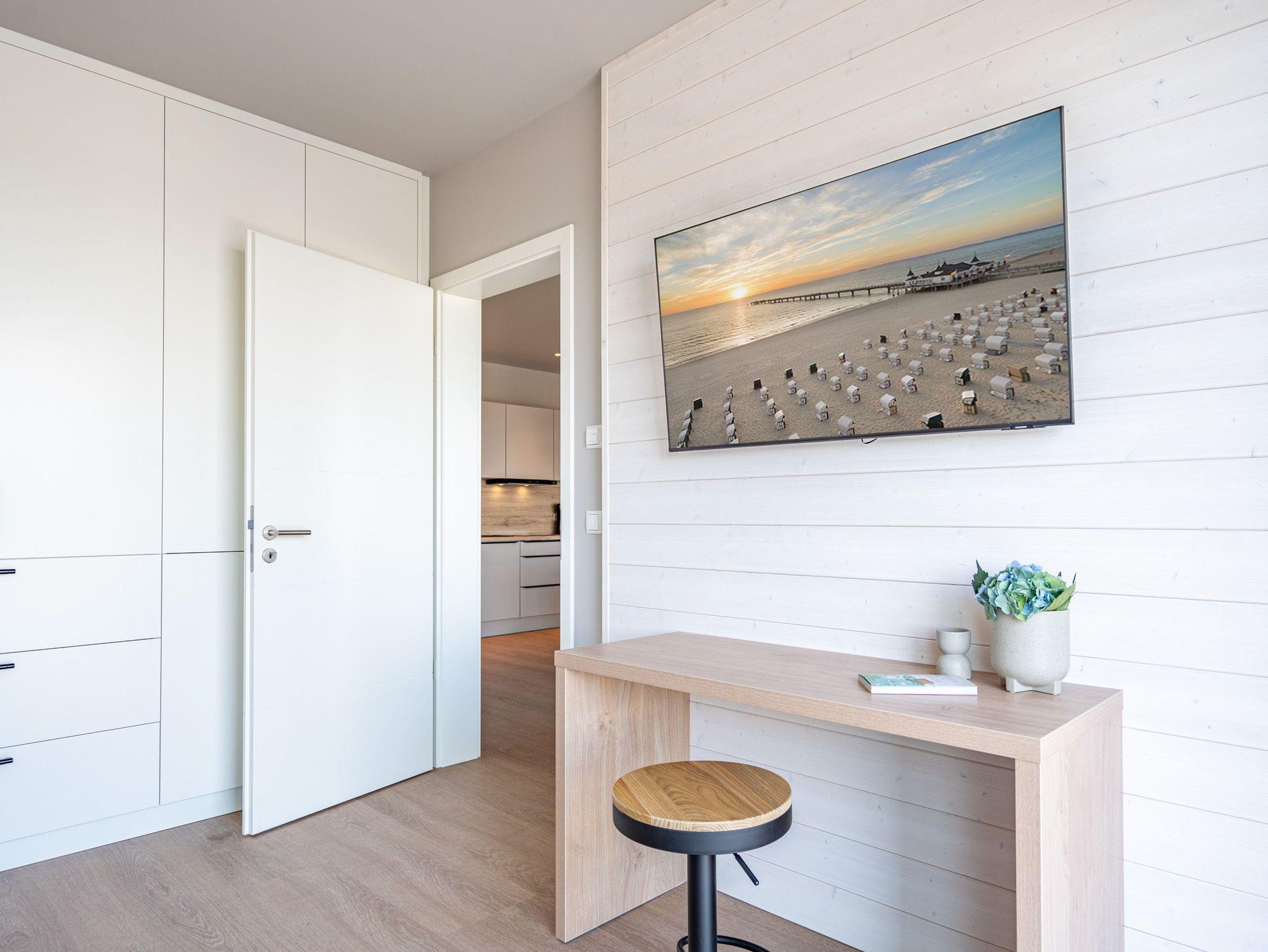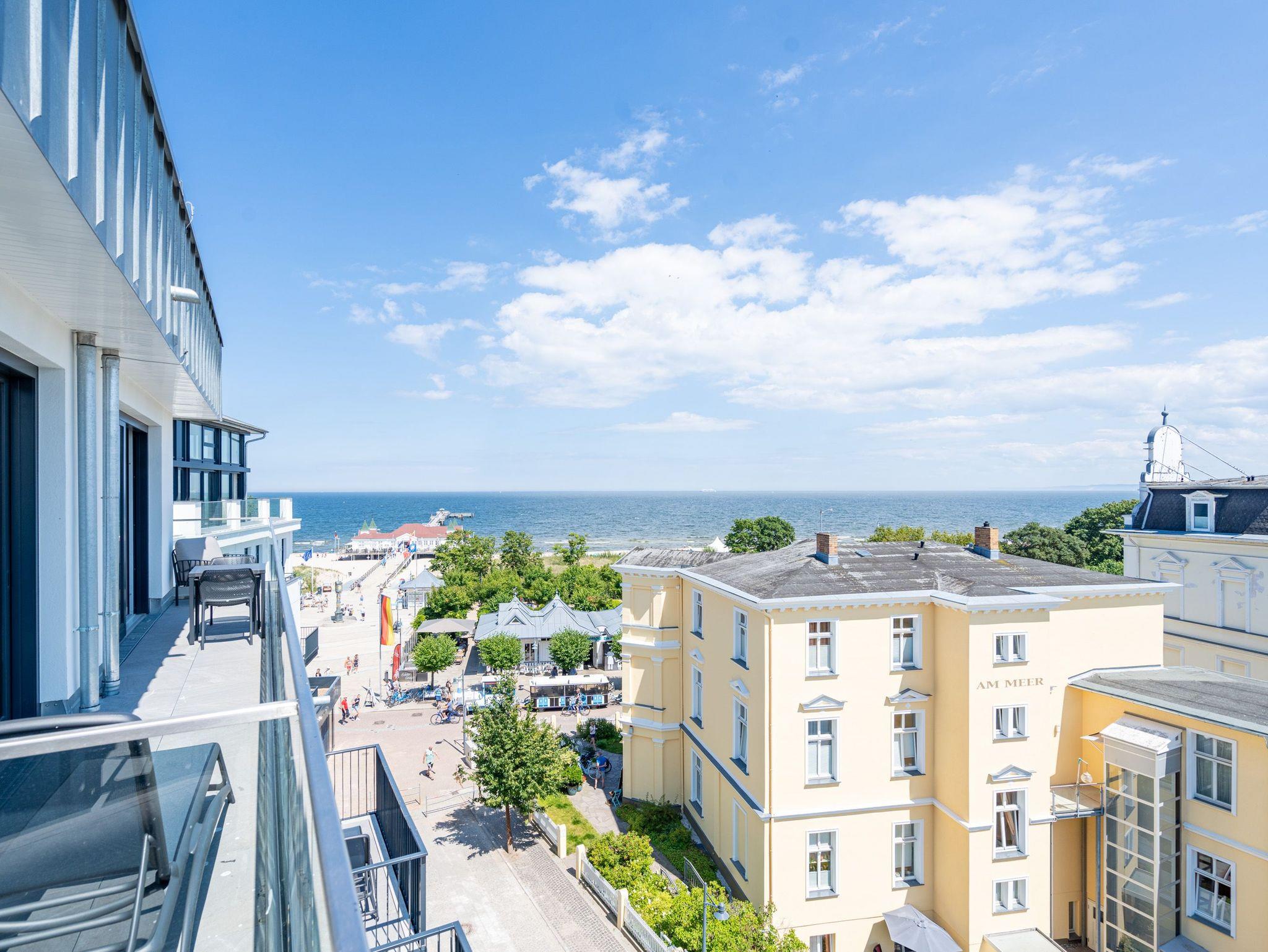 Willkommen in einem charmanten Rückzugsort an der Ostsee für bis zu 2 Personen. Das 2-Raum-Appartement B 4.3 (Haus B) im 4. Obergeschoss der Strandterrasse ist ein ganz besonderes Urlaubsdomizil. Denn es ist nicht nur unglaublich kuschelig und elegant eingerichtet, sondern bietet darüber hinaus einen atemberaubenden Blick über die Ostsee. Näher dran am Meer geht nur am Strand. Der liegt Ihnen übrigens direkt zu Füßen. Das 63 Quadratmeter große Appartement ist speziell für Paare konzipiert, die einen Faible für nordische Designmöbel haben und das gewisse Etwas lieben. Sie werden sich hier rundum wohlfühlen. Das großzügige Wohnzimmer ist mit einem schönen Sofa, einem Elektrokamin (ohne Wärmeabgabe) und einem großen Esstisch stilvoll eingerichtet. Ein aufeinander abgestimmtes Farbkonzept sorgt für eine beruhigende Atmosphäre. Der große Flat-TV (50 Zoll) ist Ihr ganz persönliches Heimkino. Machen Sie es sich hier gemütlich. Eine moderne Küchenzeile, die zum Wohnzimmer hin offen ist, bietet allen Technikkomfort, den Sie brauchen können, um köstliche Gerichte zu zaubern. Vom Backofen über einen 3-Platten-Induktionsherd, eine Geschirrspülmaschine, einen Toaster bis hin zum Wasserkocher ? es ist alles da. Wenn Sie guten Kaffee mögen, können Sie sich Ihren Morgenkaffee von der Nespresso-Kapselmaschine machen lassen. So starten Sie perfekt in den Tag an der Ostsee. Vom Süd-Ostbalkon aus haben Sie einen herrlichen Blick aufs Meer. Die Weite, die sich hier eröffnet, ist ein wundervoller Entschleuniger und schickt Ihre Gedanken auf Reisen. Essen bei Meeresluft, faulenzen auf der Sonnenliege ? auf dem großzügigen Freiluftbalkon können Sie entspannte Stunden verbringen. Auch vom Schlafzimmer aus können Sie auf den Balkon hinaustreten. Für einen erholsamen Schlaf sorgt das komfortable Boxspringdoppelbett (1,80m x 2,00m). Das Schlafzimmer ist zudem mit einem geräumigen Kleiderschrank, einem weiteren 50 Zoll Flat-TV und einem Arbeitsplatz ausgestattet. Das moderne Badezimmer verfügt über eine Dusche, einen Waschtisch, ein WC und sogar eine Infrarotsaunakabine. Die bietet wohlig warme Entspannung an kühlen Tagen. Ihr Auto steht sicher und trocken auf dem PKW-Stellplatz in der Tiefgarage. Wir wünschen Ihnen viel Freude in diesem charmanten und stilvollen Ferienappartement und einen unvergesslich schönen Ostseeaufenthalt.