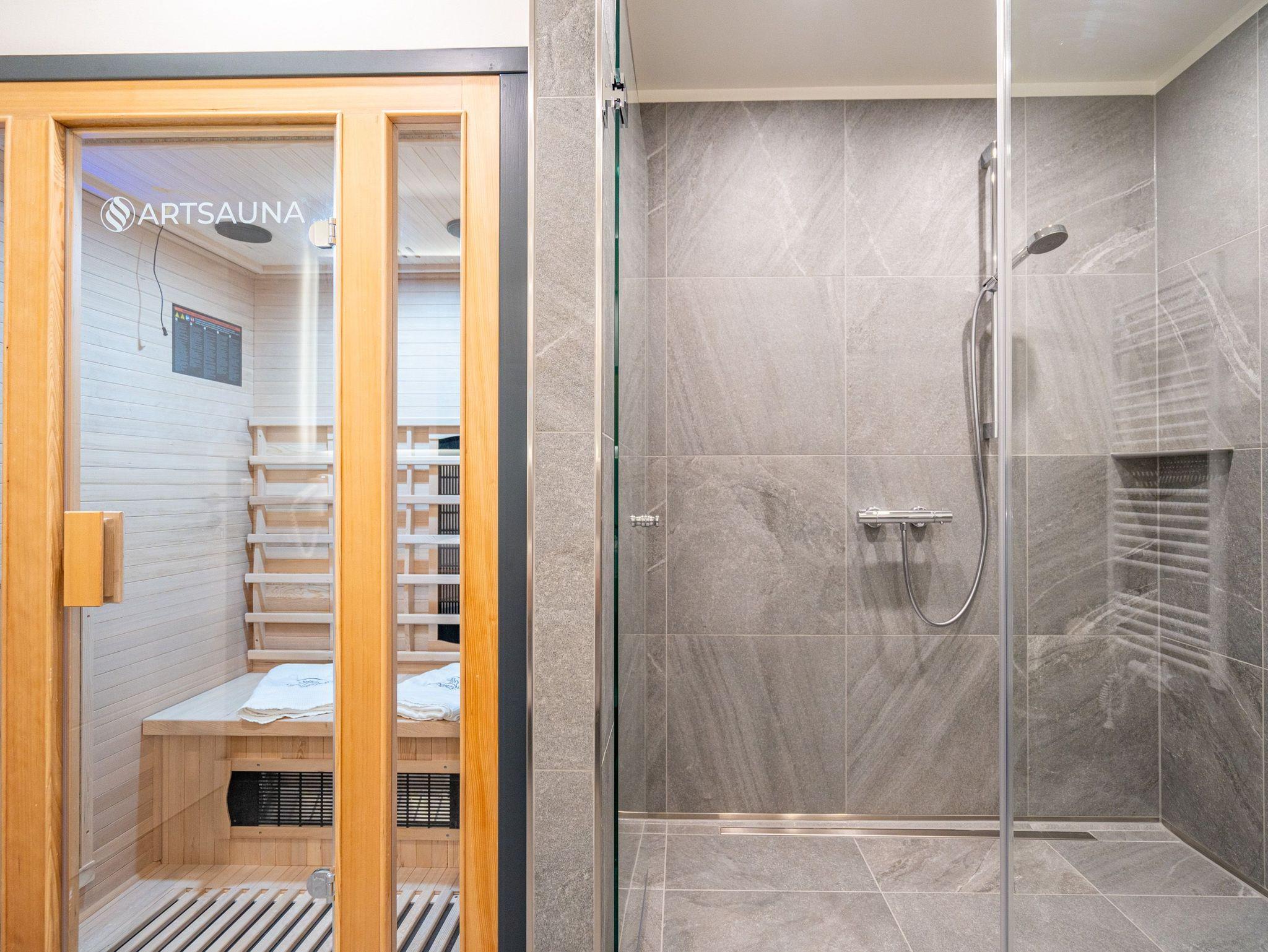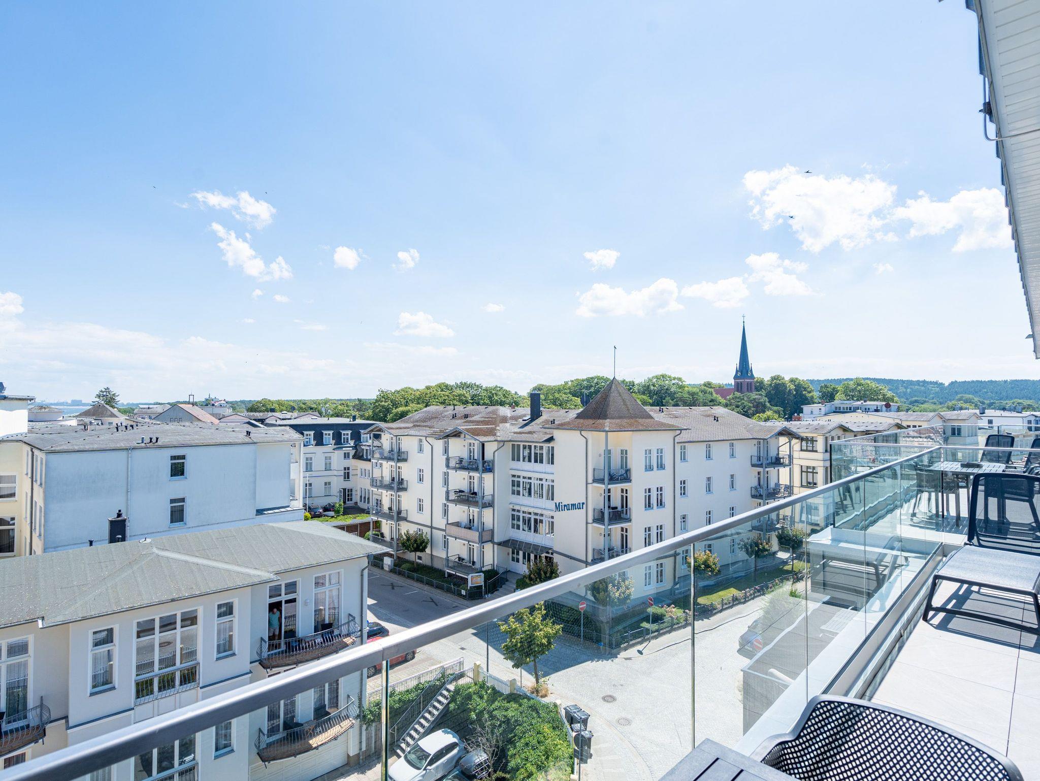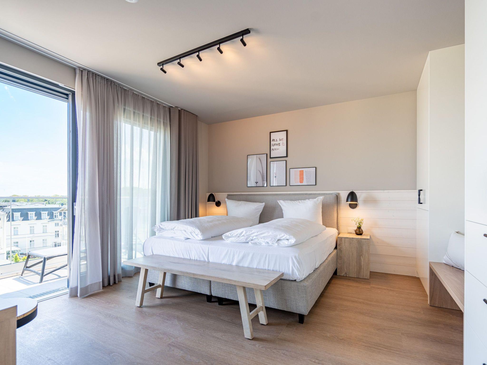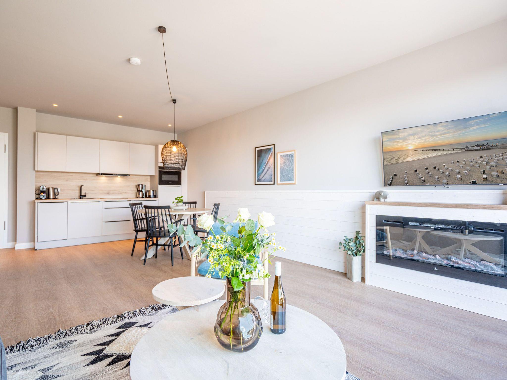 Willkommen in einem charmanten Rückzugsort an der Ostsee für bis zu 2 Personen. Das 2-Raum-Appartement B 4.3 (Haus B) im 4. Obergeschoss der Strandterrasse ist ein ganz besonderes Urlaubsdomizil. Denn es ist nicht nur unglaublich kuschelig und elegant eingerichtet, sondern bietet darüber hinaus einen atemberaubenden Blick über die Ostsee. Näher dran am Meer geht nur am Strand. Der liegt Ihnen übrigens direkt zu Füßen. Das 63 Quadratmeter große Appartement ist speziell für Paare konzipiert, die einen Faible für nordische Designmöbel haben und das gewisse Etwas lieben. Sie werden sich hier rundum wohlfühlen. Das großzügige Wohnzimmer ist mit einem schönen Sofa, einem Elektrokamin (ohne Wärmeabgabe) und einem großen Esstisch stilvoll eingerichtet. Ein aufeinander abgestimmtes Farbkonzept sorgt für eine beruhigende Atmosphäre. Der große Flat-TV (50 Zoll) ist Ihr ganz persönliches Heimkino. Machen Sie es sich hier gemütlich. Eine moderne Küchenzeile, die zum Wohnzimmer hin offen ist, bietet allen Technikkomfort, den Sie brauchen können, um köstliche Gerichte zu zaubern. Vom Backofen über einen 3-Platten-Induktionsherd, eine Geschirrspülmaschine, einen Toaster bis hin zum Wasserkocher ? es ist alles da. Wenn Sie guten Kaffee mögen, können Sie sich Ihren Morgenkaffee von der Nespresso-Kapselmaschine machen lassen. So starten Sie perfekt in den Tag an der Ostsee. Vom Süd-Ostbalkon aus haben Sie einen herrlichen Blick aufs Meer. Die Weite, die sich hier eröffnet, ist ein wundervoller Entschleuniger und schickt Ihre Gedanken auf Reisen. Essen bei Meeresluft, faulenzen auf der Sonnenliege ? auf dem großzügigen Freiluftbalkon können Sie entspannte Stunden verbringen. Auch vom Schlafzimmer aus können Sie auf den Balkon hinaustreten. Für einen erholsamen Schlaf sorgt das komfortable Boxspringdoppelbett (1,80m x 2,00m). Das Schlafzimmer ist zudem mit einem geräumigen Kleiderschrank, einem weiteren 50 Zoll Flat-TV und einem Arbeitsplatz ausgestattet. Das moderne Badezimmer verfügt über eine Dusche, einen Waschtisch, ein WC und sogar eine Infrarotsaunakabine. Die bietet wohlig warme Entspannung an kühlen Tagen. Ihr Auto steht sicher und trocken auf dem PKW-Stellplatz in der Tiefgarage. Wir wünschen Ihnen viel Freude in diesem charmanten und stilvollen Ferienappartement und einen unvergesslich schönen Ostseeaufenthalt.