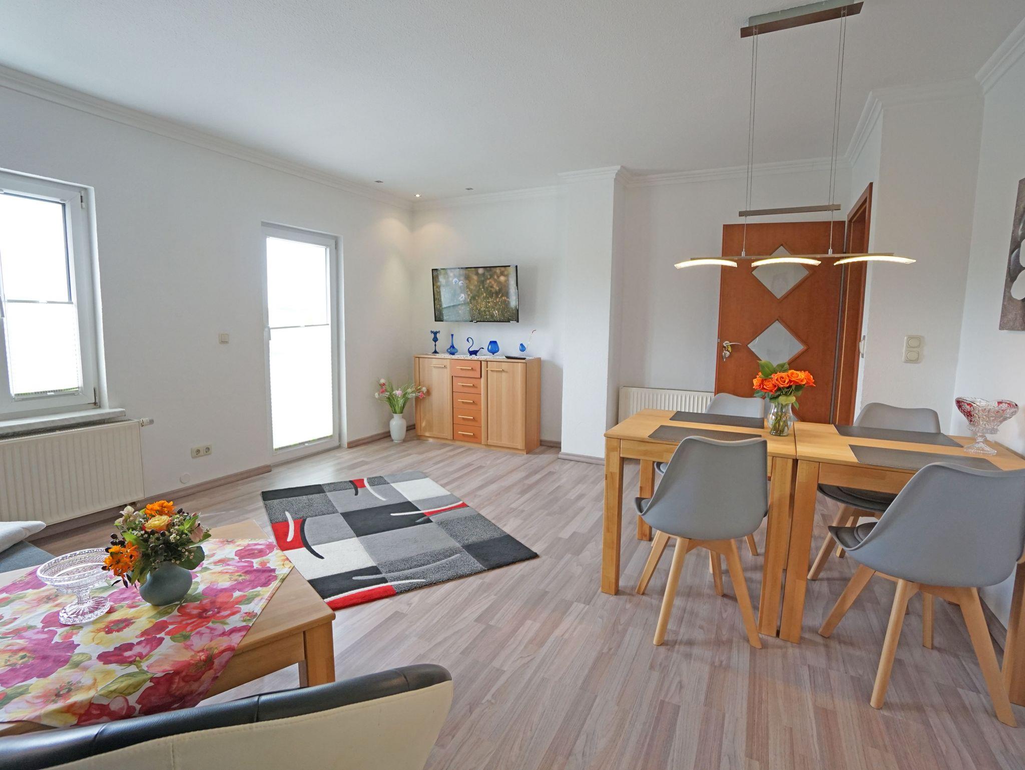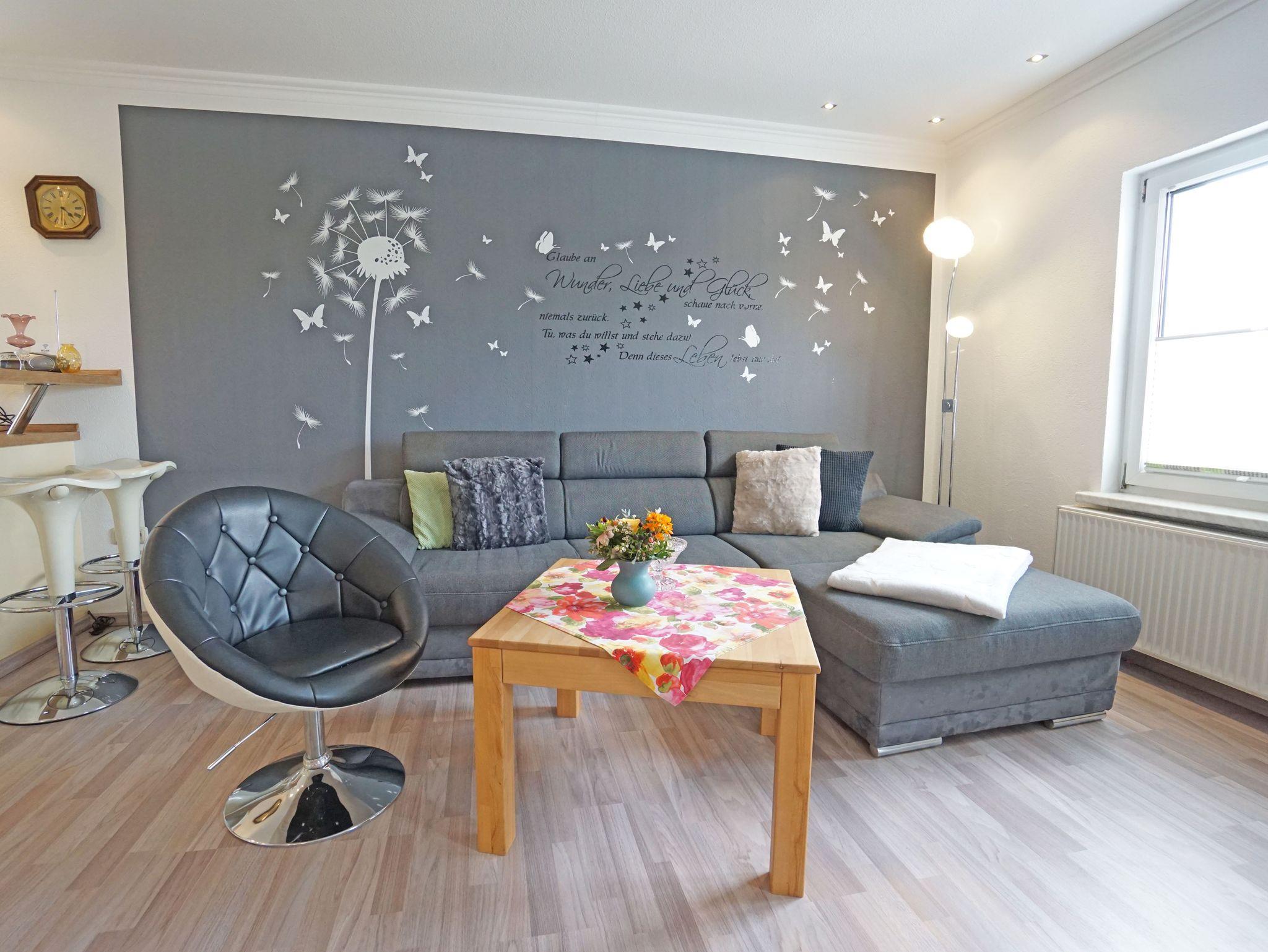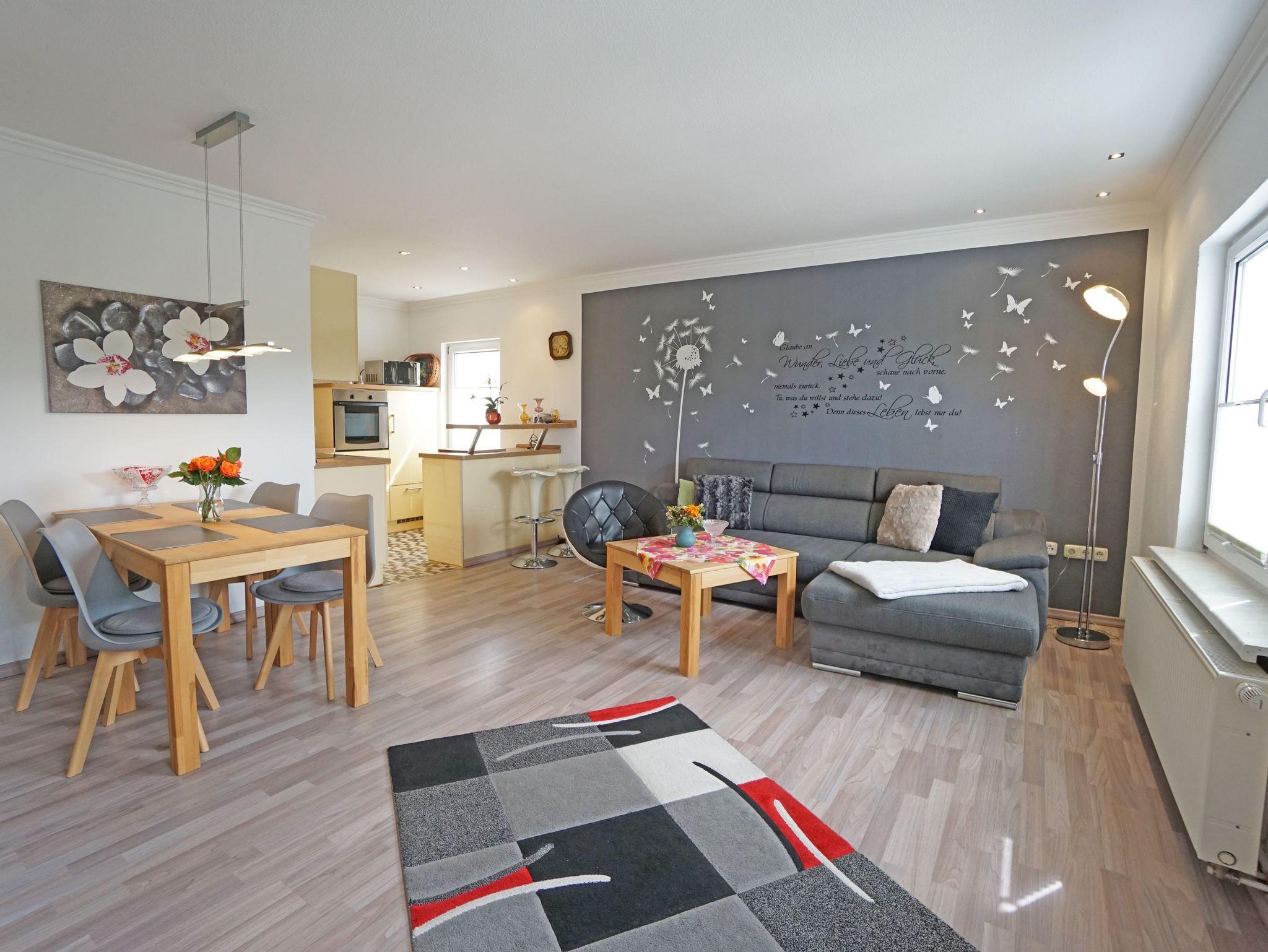 Die moderne Ferienwohnung Wiesenblick (75qm) verfügt über 2 Schlafzimmer für max. 3 Personen. Vom großen Wohnzimmer mit offener Küche und Esstisch im ersten Obergeschoss gelangt man auf die großzügige möblierte Sonnenterrasse. Weiterhin verfügt die Wohnung über ein Duschbad. Das Grundstück ist komplett umzäunt. Für Ihren PKW gibt es einen Außenstellplatz.