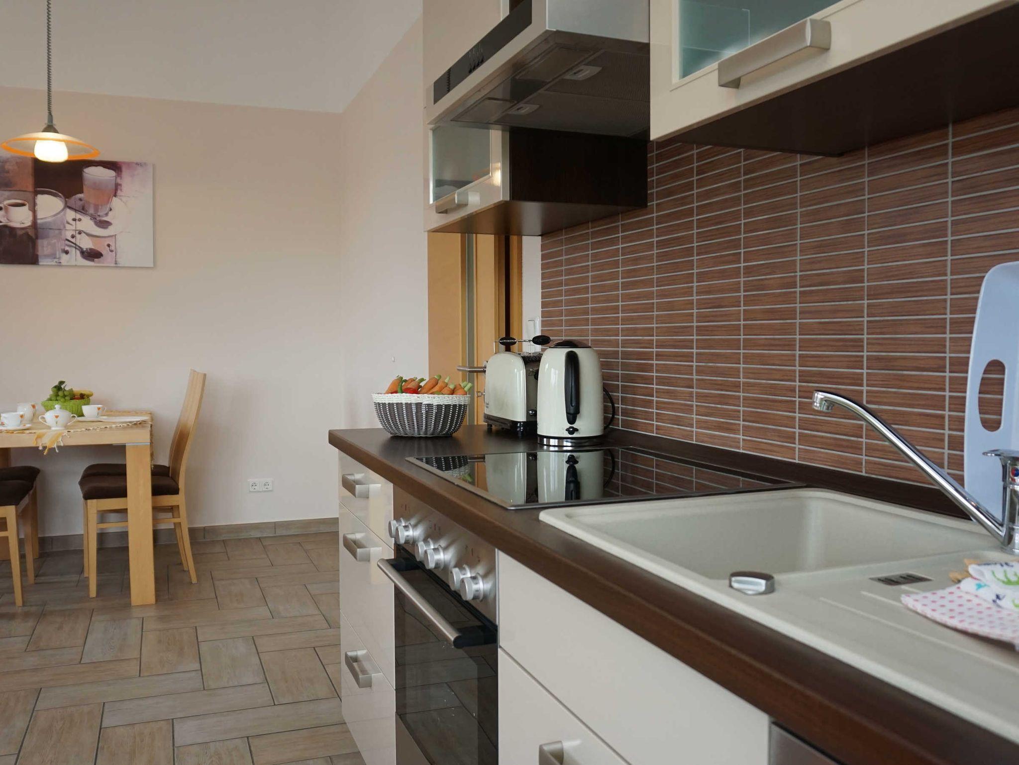 Die 2 Zimmerwohnung (Dachgeschoss) 43 qm in Südostlage mit großzügiger Terrasse über die gesamte Hausbreite ist hell und modern eingerichtet und verfügt über einen sehr guten Standard. - alle Böden gefliest (außergewöhnliche Farben und Formen) - alle Türen echtholzfurniert - Fußbodenheizung - Kabelfernsehen (Flachbild) - große Fenster mit Schiebeelementen - Treppenhaus Granit - Markeneinbauküchen - Wechselsprechanlage.