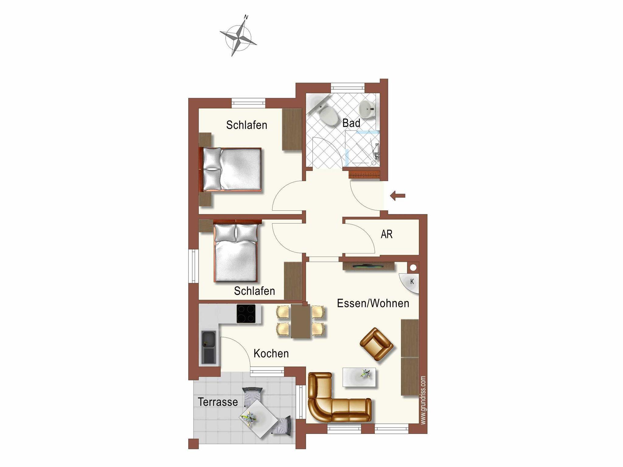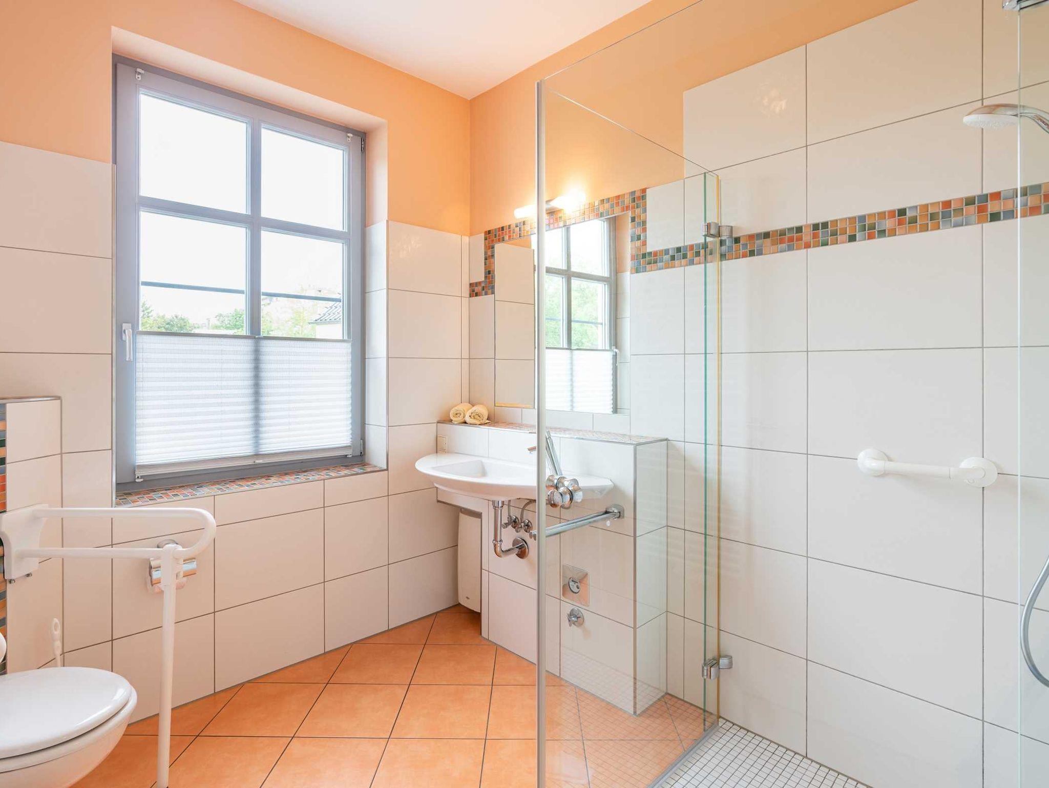 Diese Wohnung befindet sich im Erdgeschoß, ist barrierefrei und für Rollstuhlfahrer geeignet. (ebenerdiger Zugang/Dusche ebenerdig) Sie bietet auf 68m² Platz für 4 bis max. 5 Personen.*(Aufbettung) Der Wohnbereich mit Essplatz und Sofa lässt keine Wünsche offen. Eine gut ausgestattete Küche steht zur Verfügung. Die Wohnung verfügt über 2 Schlafzimmer mit Doppelbetten, Bad, Kaminofen und eine Loggia. An der Toilette können auf Wunsch Stützen angebaut werden. Das Doppelbett in dem großen Schlafzimmer wurde auf 48 cm (54 mit Matratze) erhöht und es gibt in dem Schlafzimmer einen zusätzlichen Fernseher.
