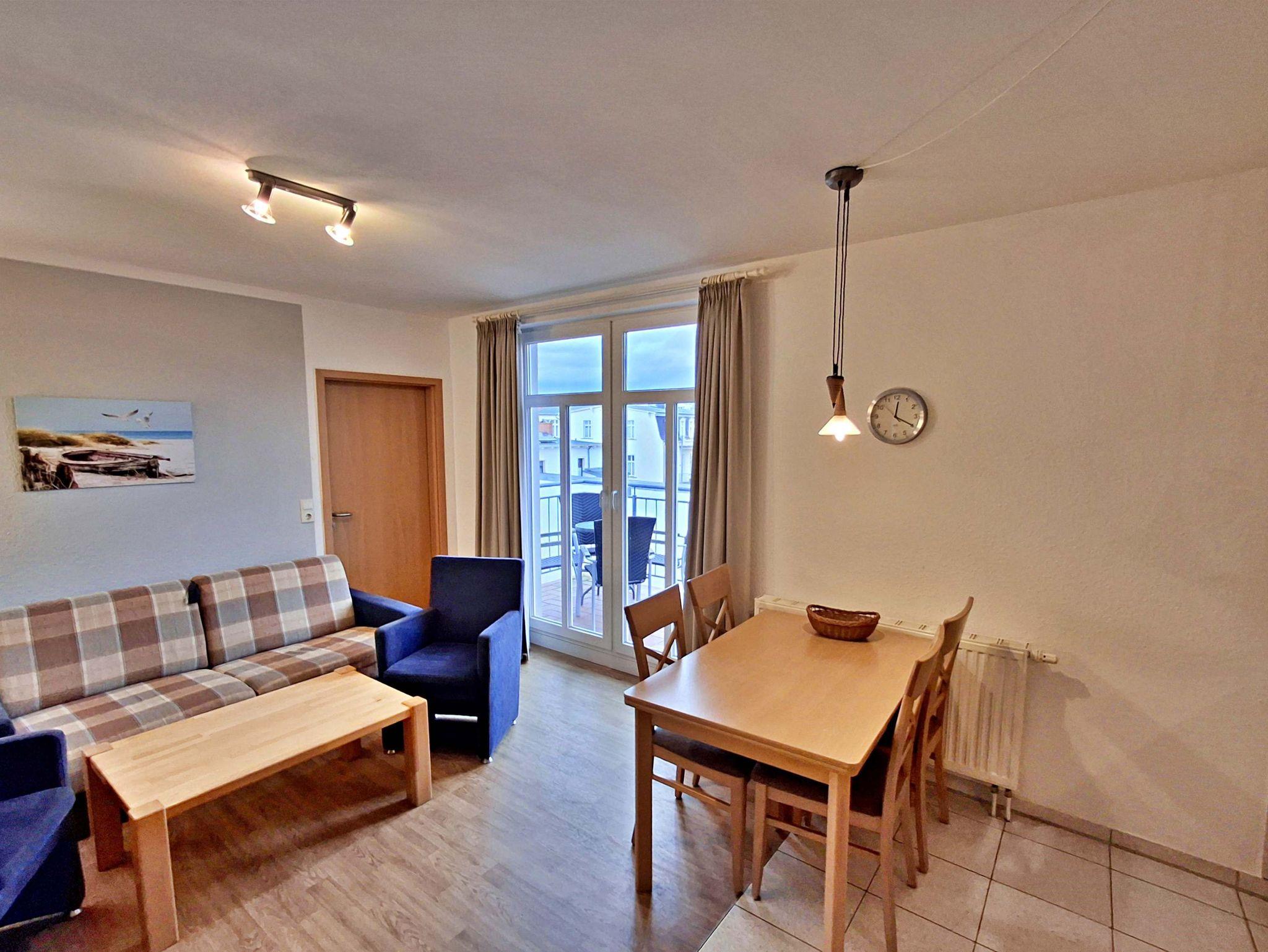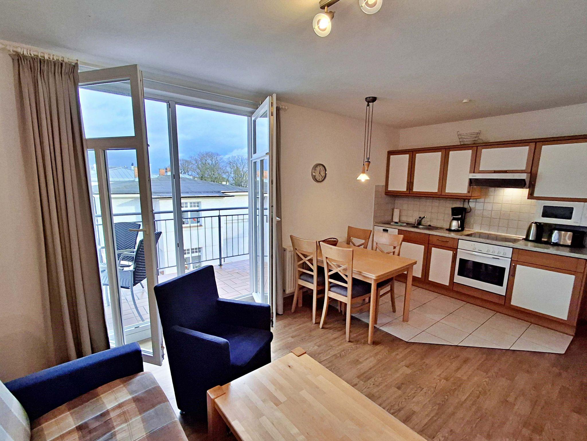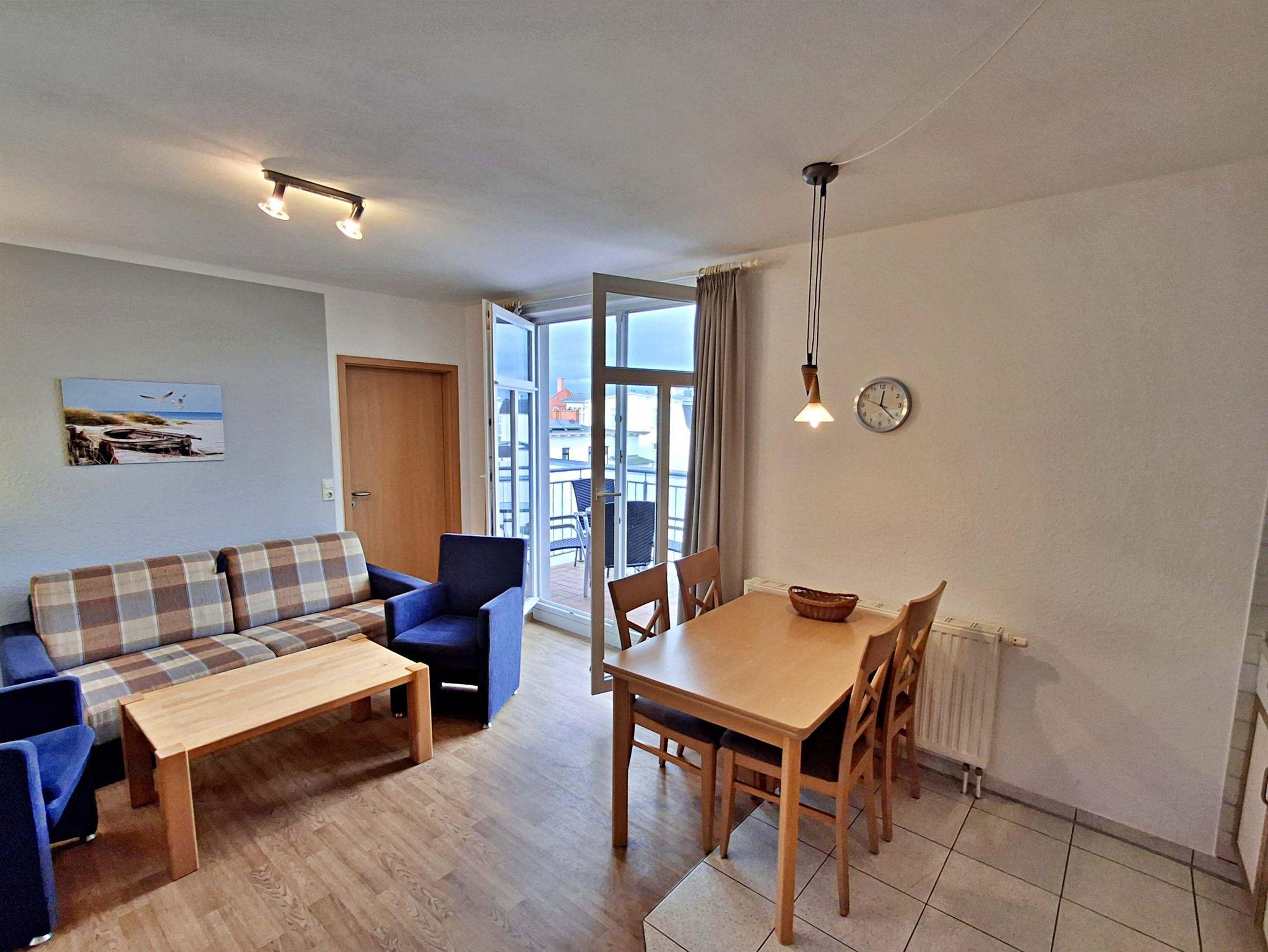 Die freundliche 3-Zimmer-Wohnung Korswandt mit Balkon für max. 4 Erwachsene und 1 Kleinkind bis 3 Jahre befindet in der zweiten Etage im Haus am Kurpark - nur wenige Schritte von der Promenade und dem Strand entfernt. Im Wohnbereich befinden sich neben der gemütlichen Couch auch zwei Sessel sowie ein Esstisch mit 4 Stühlen, der genügend Platz bietet. Vom Wohnbereich aus gelangen Sie auf den Balkon, welcher zur See-/Hofseite gelegen ist. Hier können Sie bereits morgens Ihren Kaffee genießen oder den Abend bei einem Glas Wein ausklingen lassen. Die moderne Küchenzeile mit Ceranherd, Backofen, Geschirrspüler, Mikrowelle, Kaffeemaschine, Wasserkocher und Toaster lässt keine Wünsche offen. Für die Unterhaltung sorgen ein Flachbild-TV, Radio-CD-Player und kostenfreies W-LAN. Das 1. Schlafzimmer verfügt über ein Doppelbett und das zweite Schlafzimmer über 2 Einzelbetten. Das Badezimmer hat DU/WC.