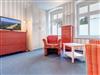 Doppelzimmer zur Landseite mit Doppelbett, Couchgruppe, Kühlmöglichkeit, Kabel-TV, Tablet-PC, Bad mit Fenster.