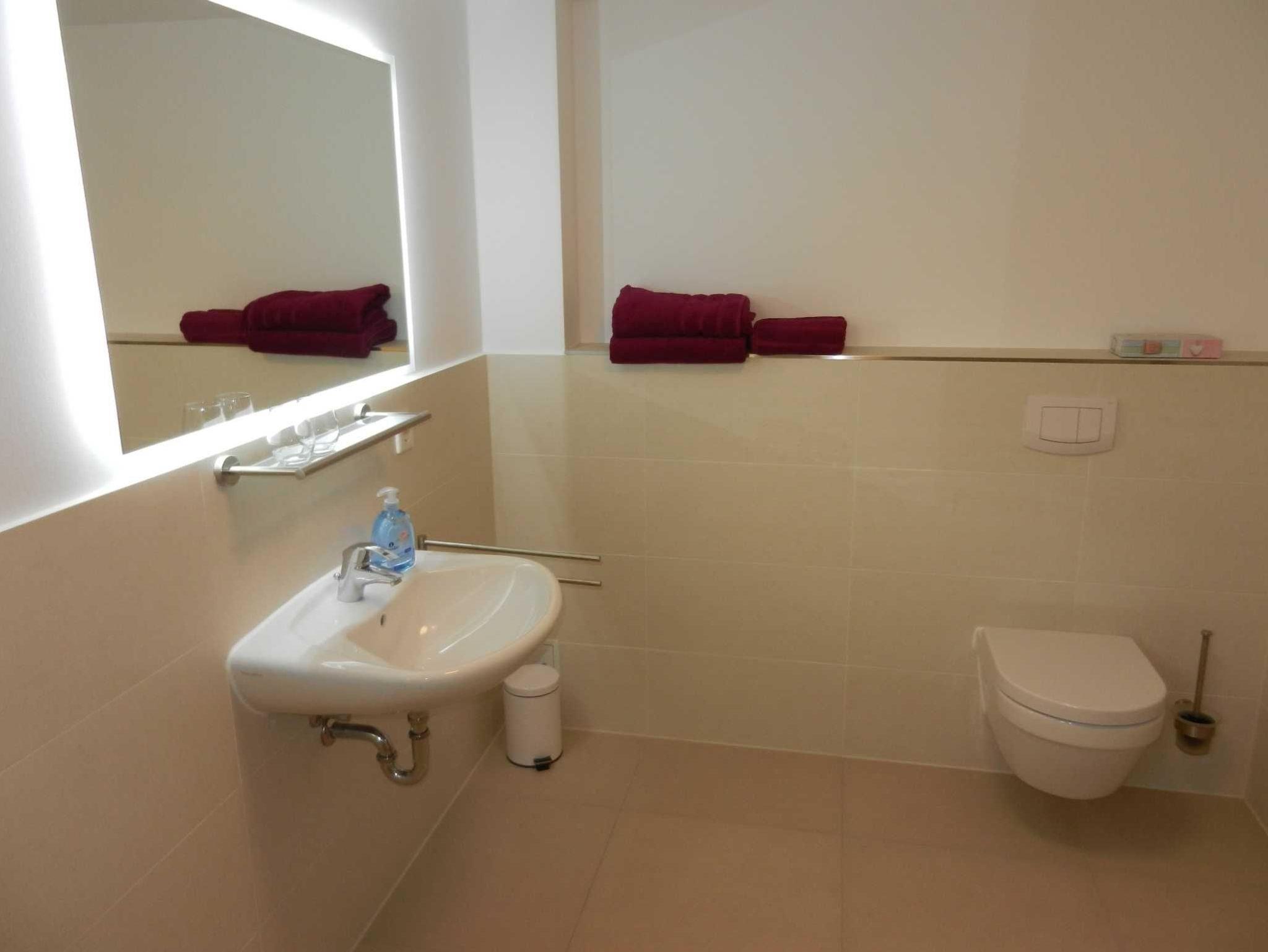 Das große Badezimmer verfügt über eine Dusche und WC.