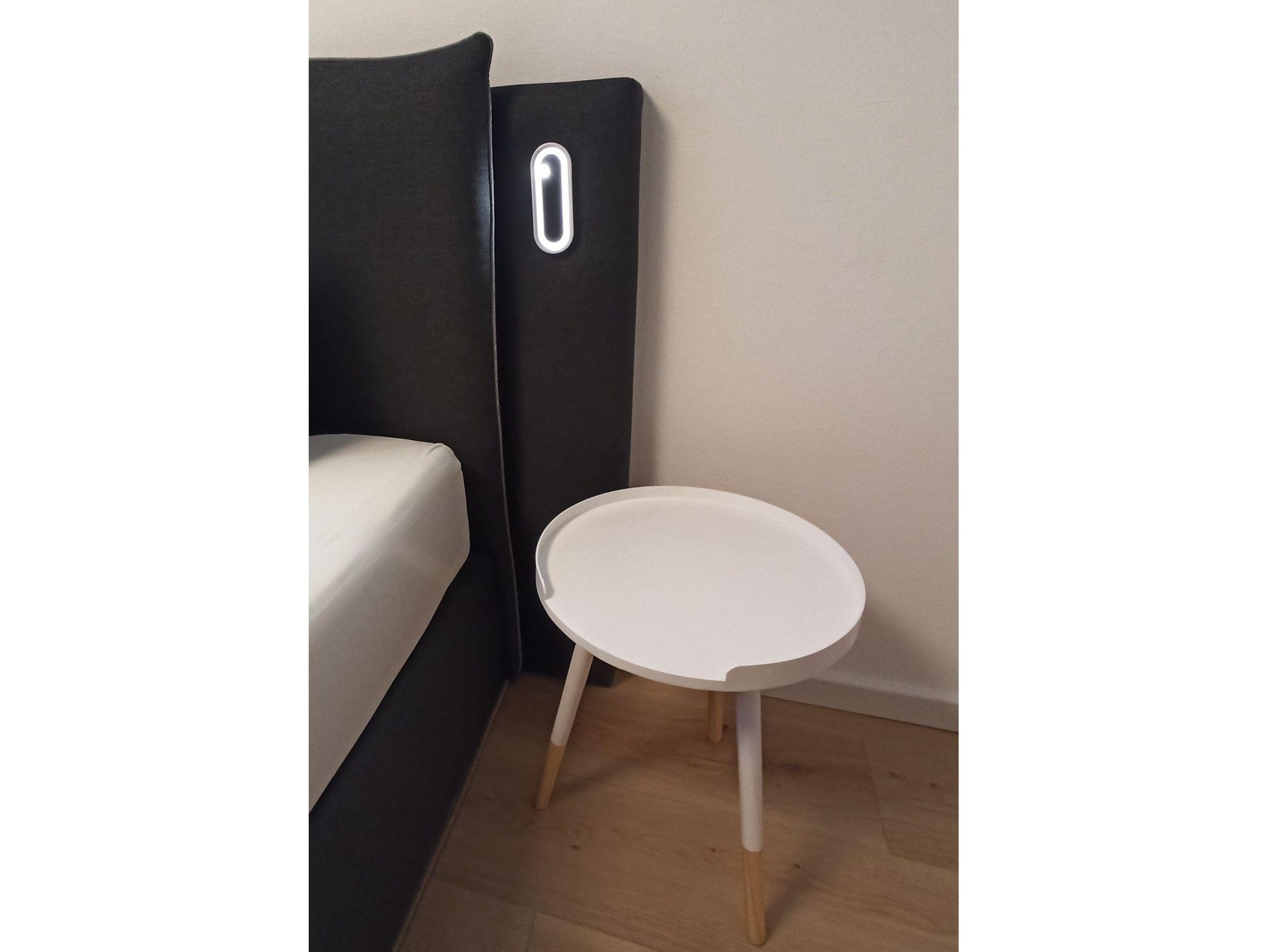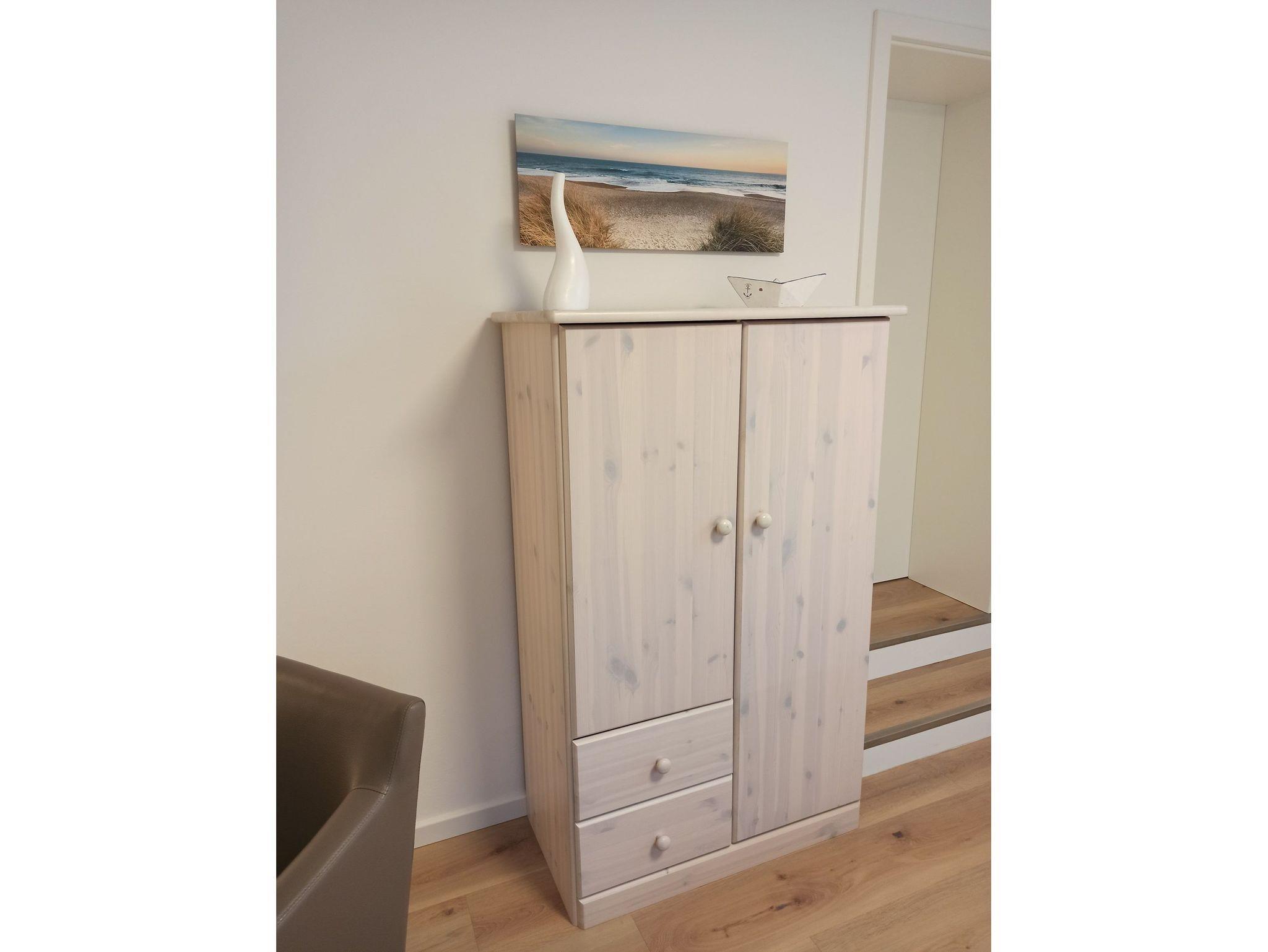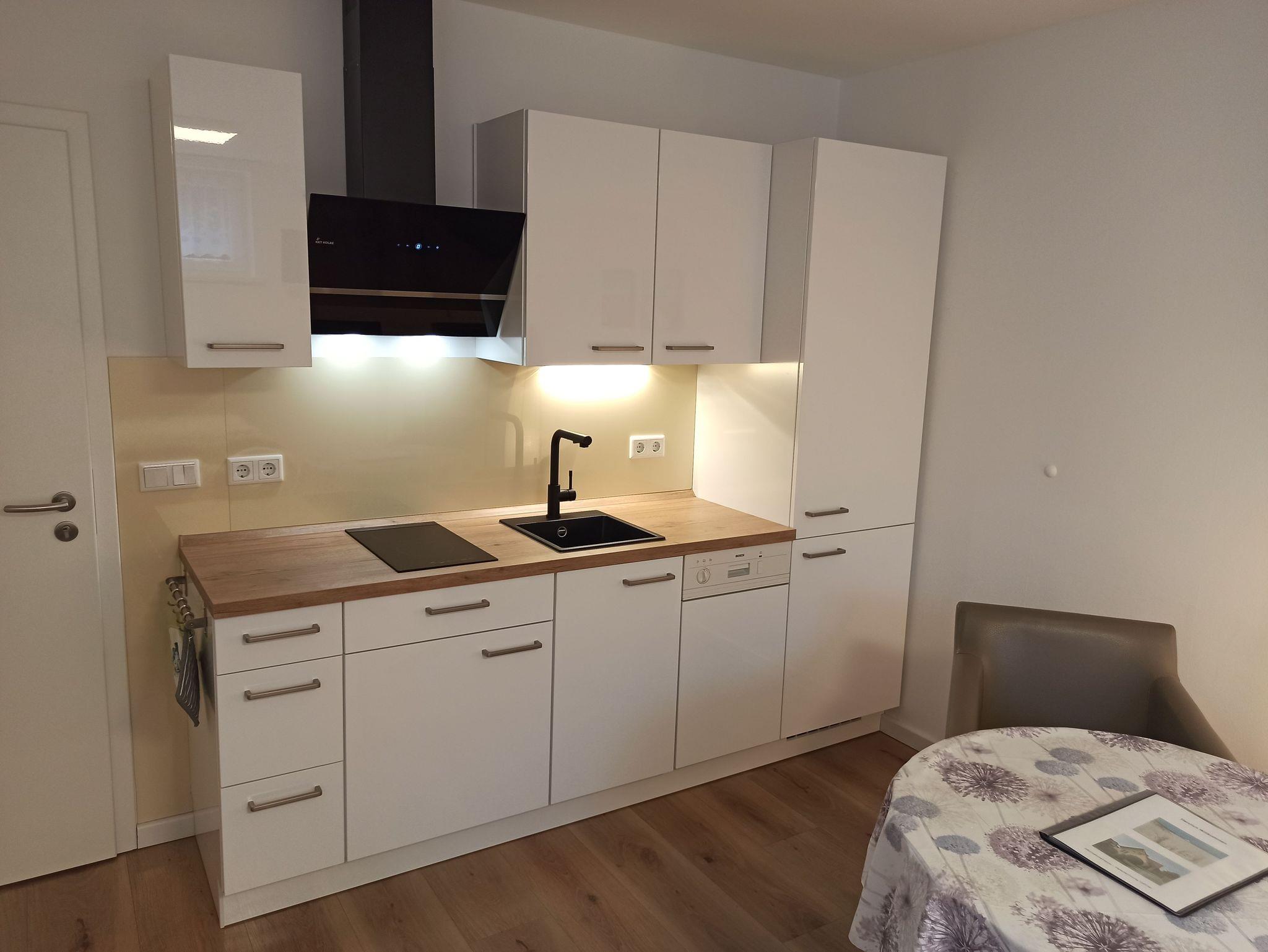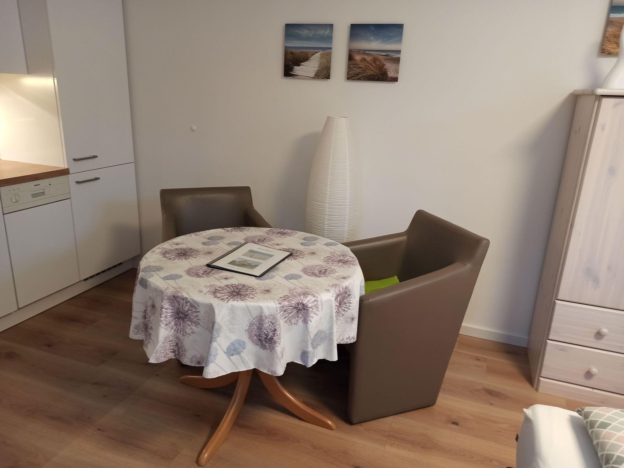 Die Wohnung verfügt über einen kombinierten Wohn- Schlafraum. Hier befindet sich ein Doppelbett, eine Sitzecke, sowie die moderne Küchenzeile. Die Küchenzeile ist ausgestattet mit einen 2 Platten Cerankochfeld, Spülmaschine, Kühlschrank mit Gefriermöglichkeit, Wasserkocher, Toaster, Mikrowelle und Kaffeemaschine.